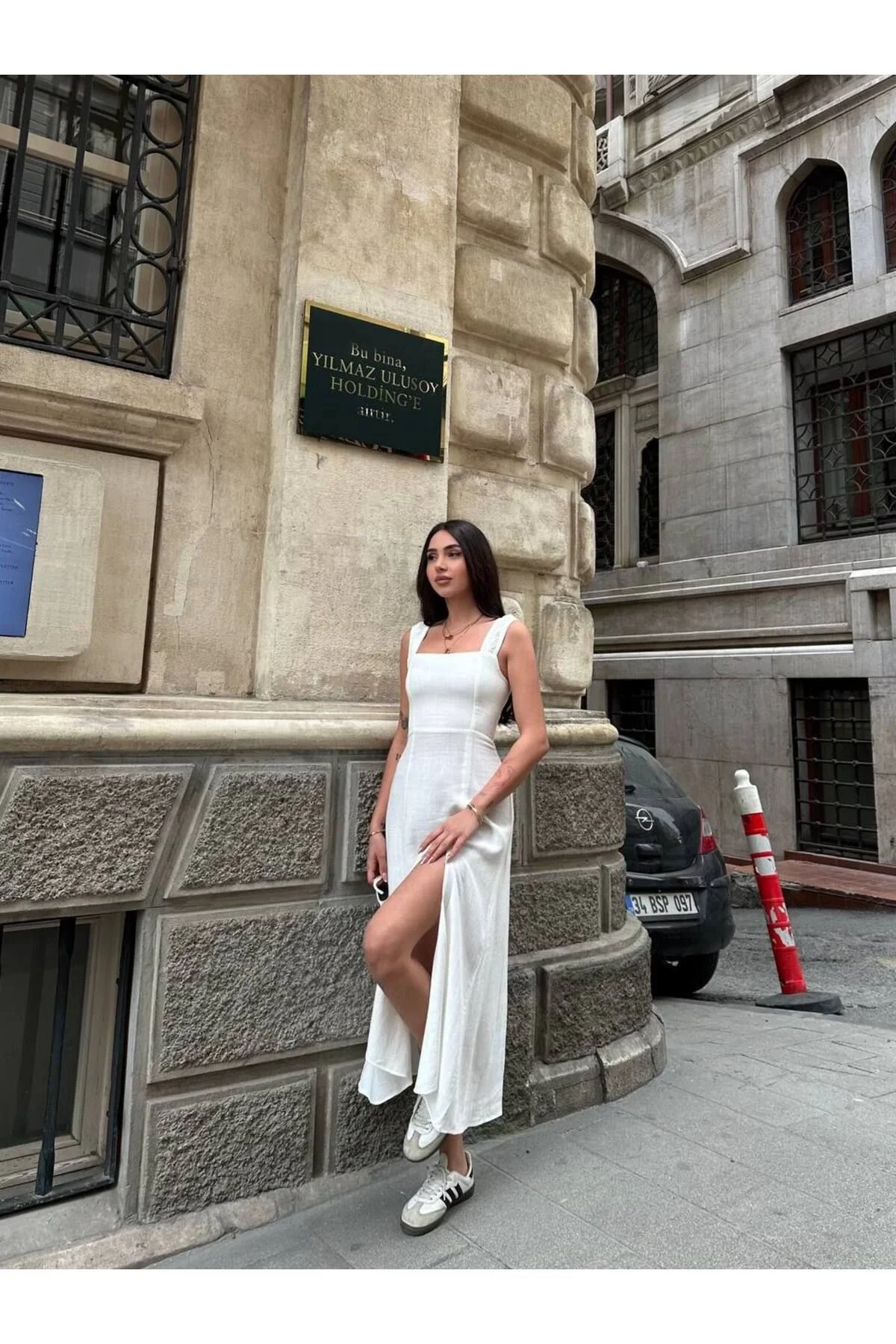 Sırt kısmındaki bağcık detaylarıyla göz alıcı bir duruş sunan MetuCa keten maxi elbise, önden yırtmaç detayıyla hem konfor hem feminenlik vadediyor. Günlük kombinlerde ya da özel davetlerde bir adım önde olmak isteyenler için tasarlandı. Hafif yapısı ve pamuklu dokusuyla yaz boyunca vazgeçilmezin olacak!