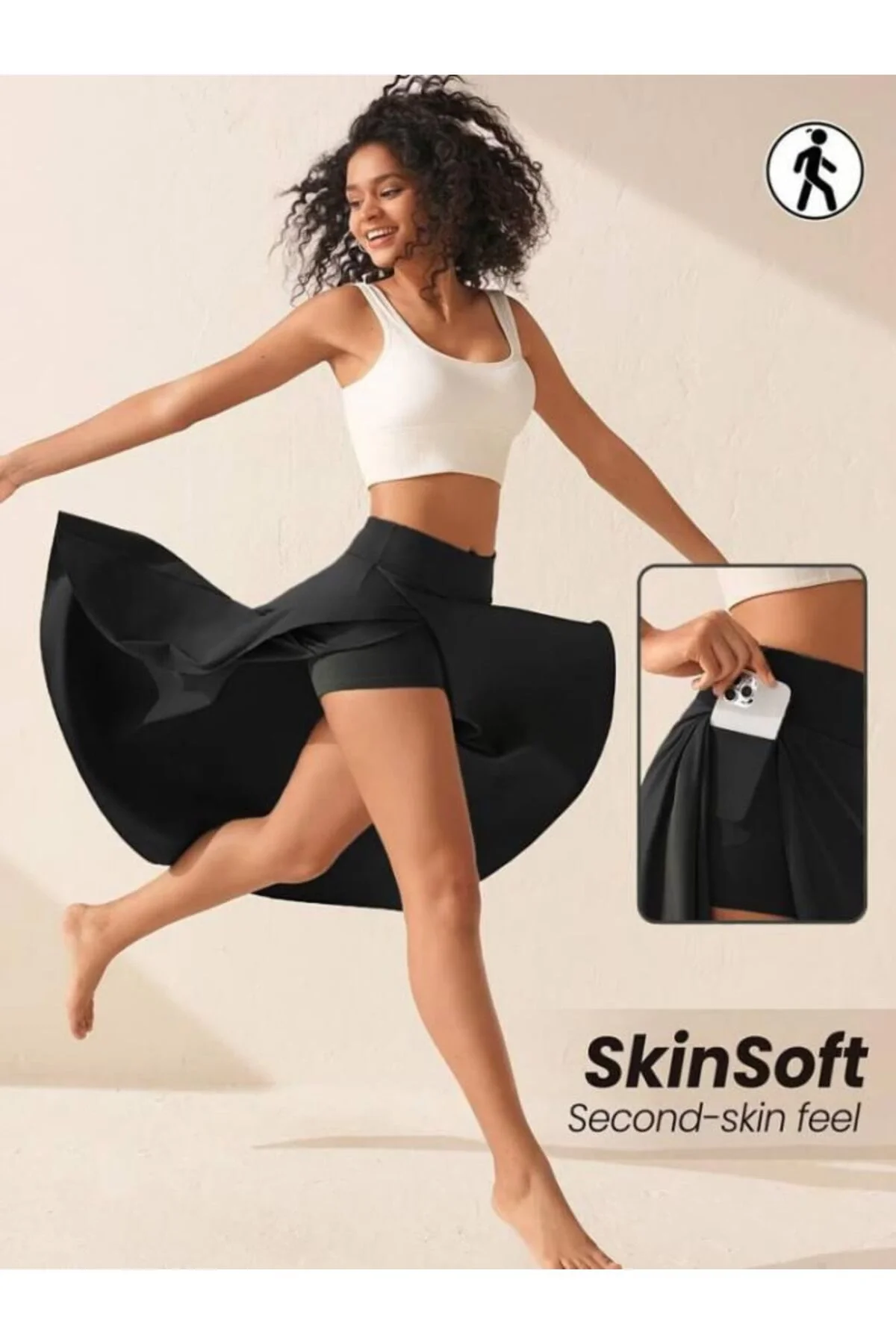 Kadın Yüksek Bel Cepli Asimetrik Yırtmaçlı İçi Şortlu Taytlı Etek - Siyah