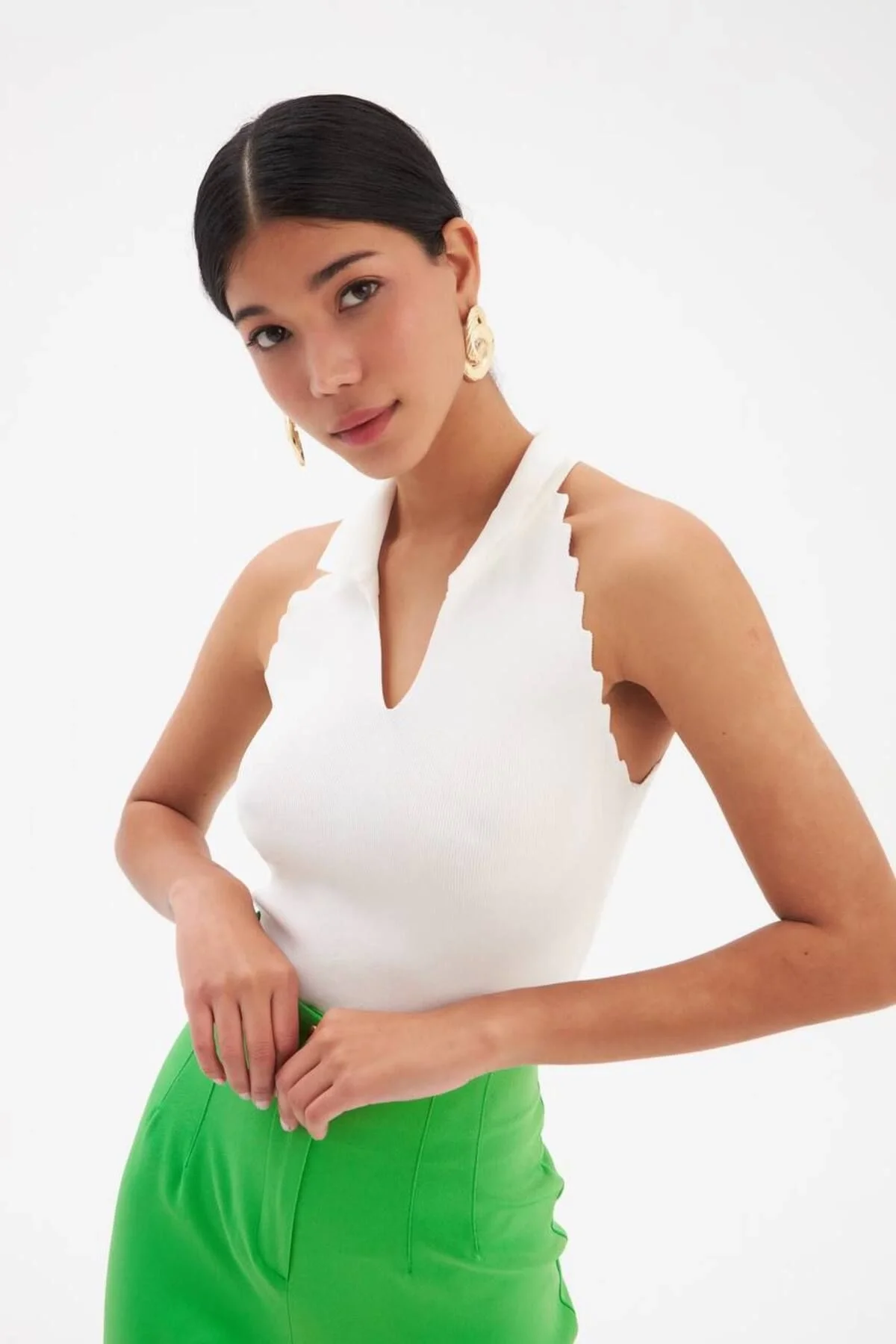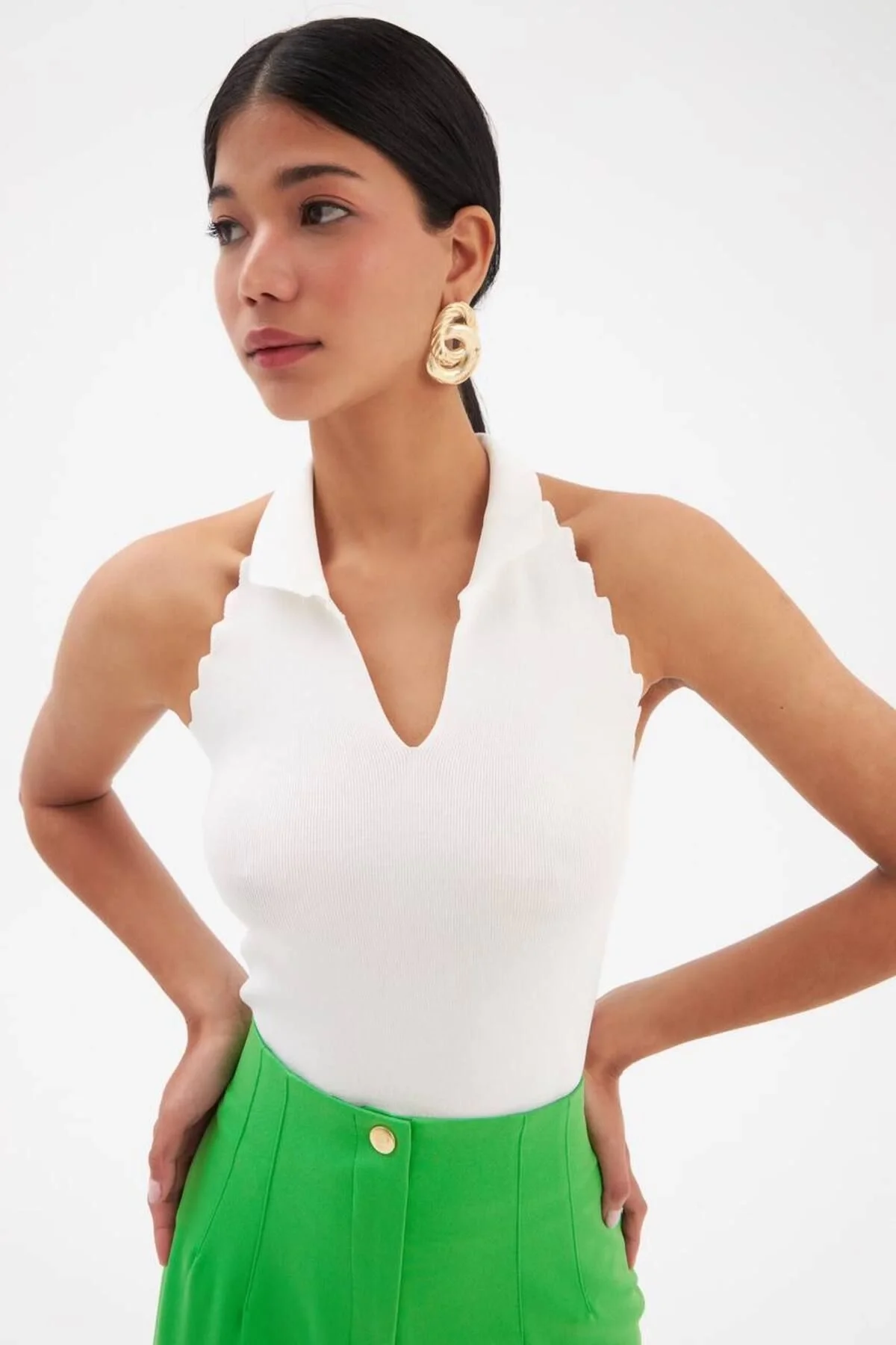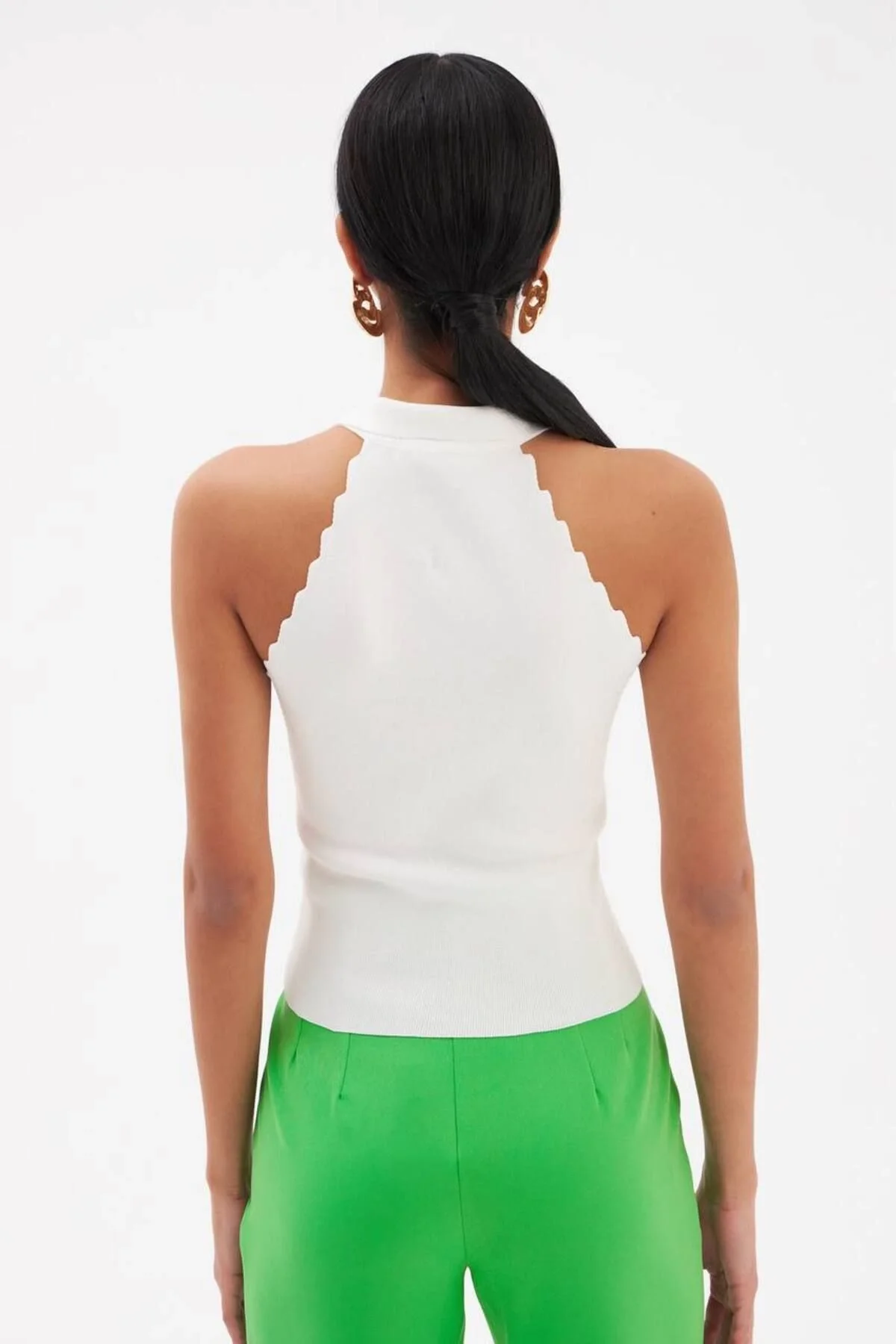 Kadın Polo Yaka Halter Yaka Kenarları Tırtıklı Sırtı Açık Triko Bluz - Yeşil
