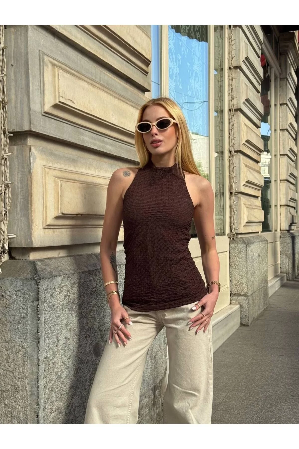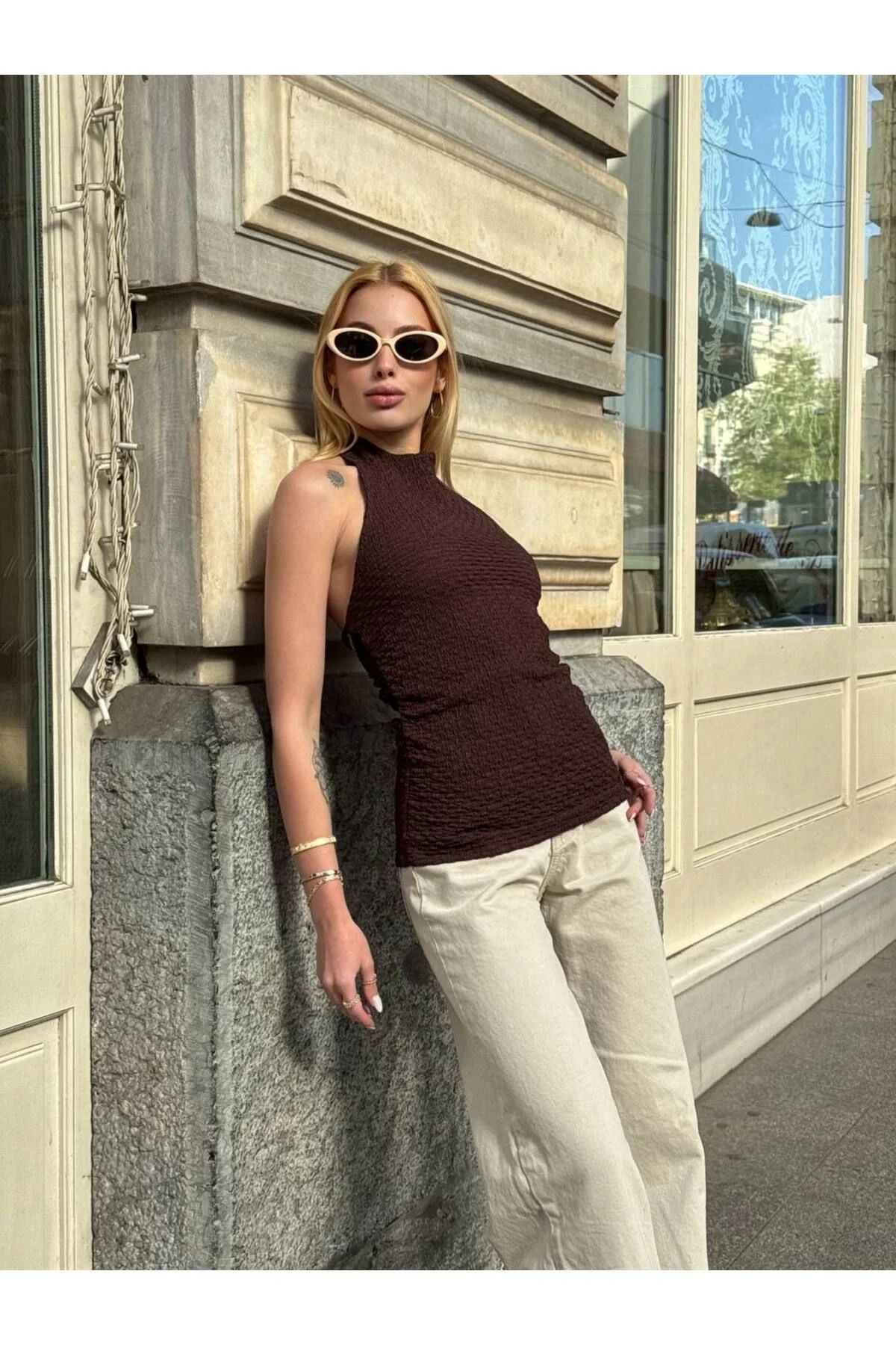 Kadın Halter Yaka Sırtı Açık Boyundan Düğmeli Dokulu Gofre Kumaş Bluz - Kahverengi