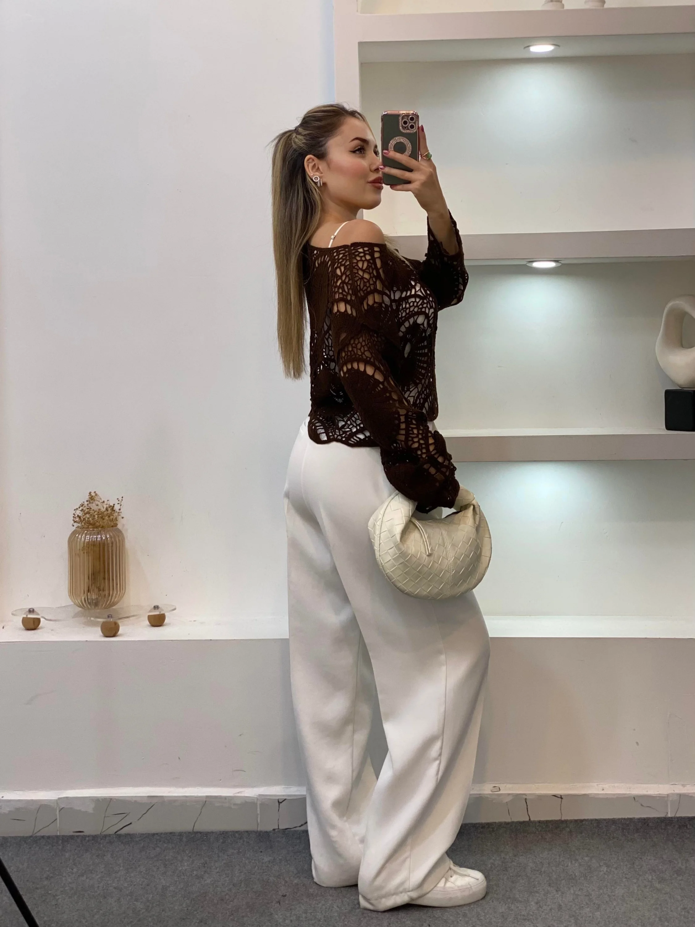 El işçiliği tadında modern bir dokunuş... Bu acı kahve crochet (örgü) bluz, sezonun en hit parçalarından biri. Büyük dairesel motifleri ve ajurlu (delikli) yapısıyla hem gizemli hem de iddialı bir görünüm sunuyor. İster plajda bikininizin üzerine, ister şehirde şık bir akşam yemeğinde kullanarak stilinizi konuşturabilirsiniz.