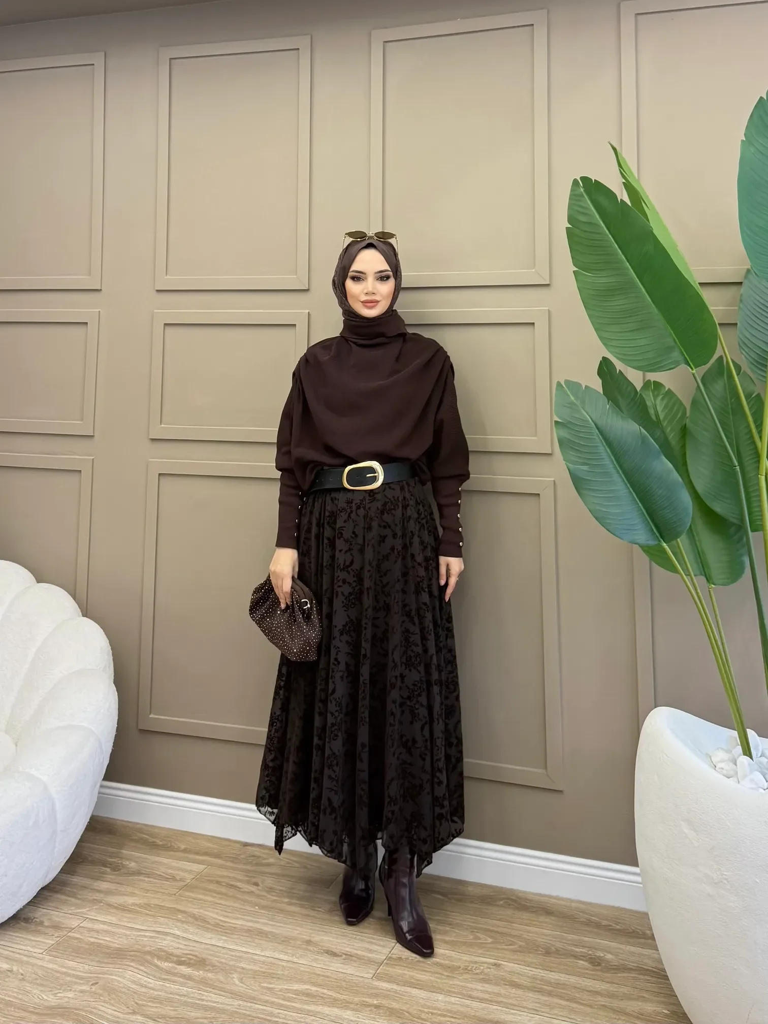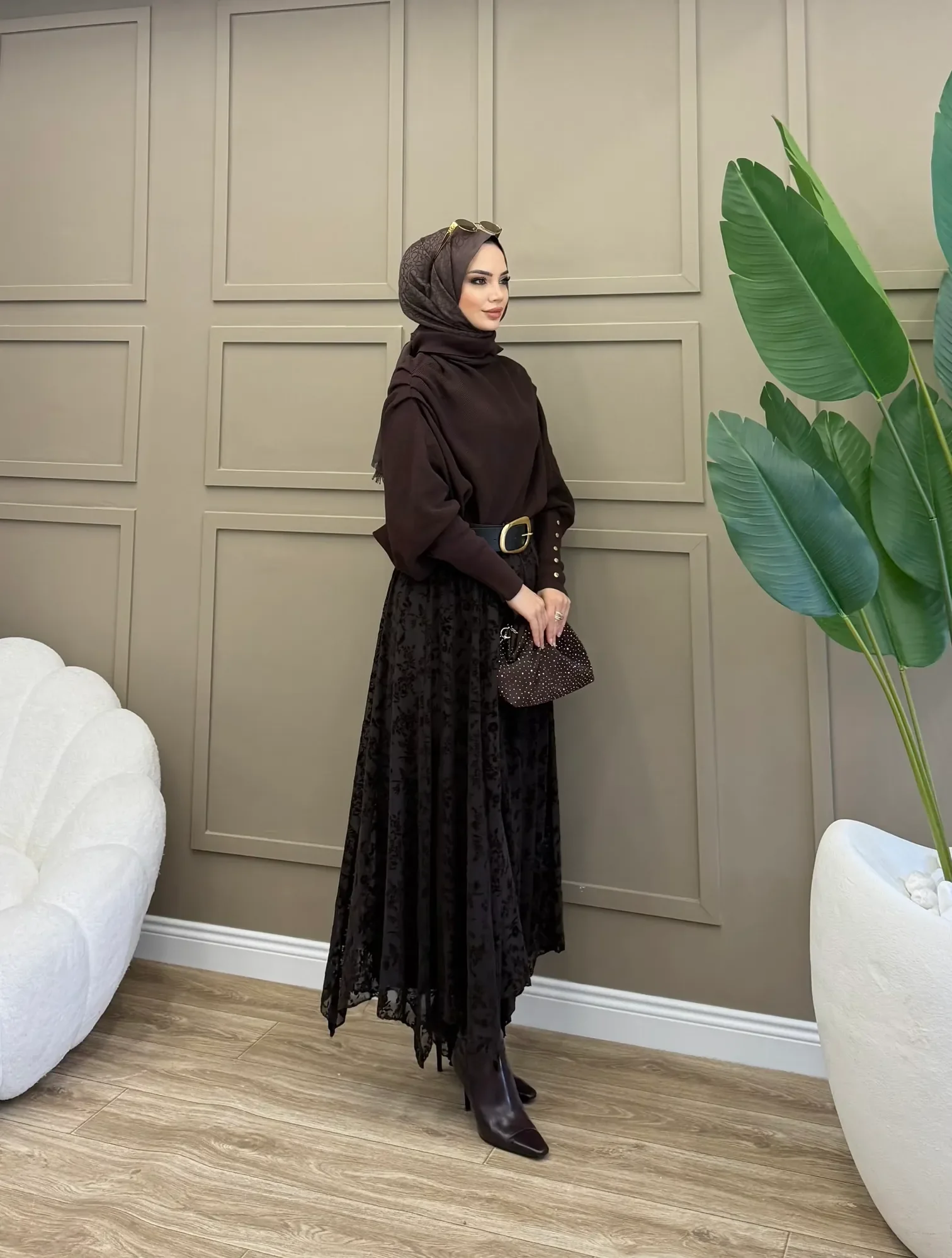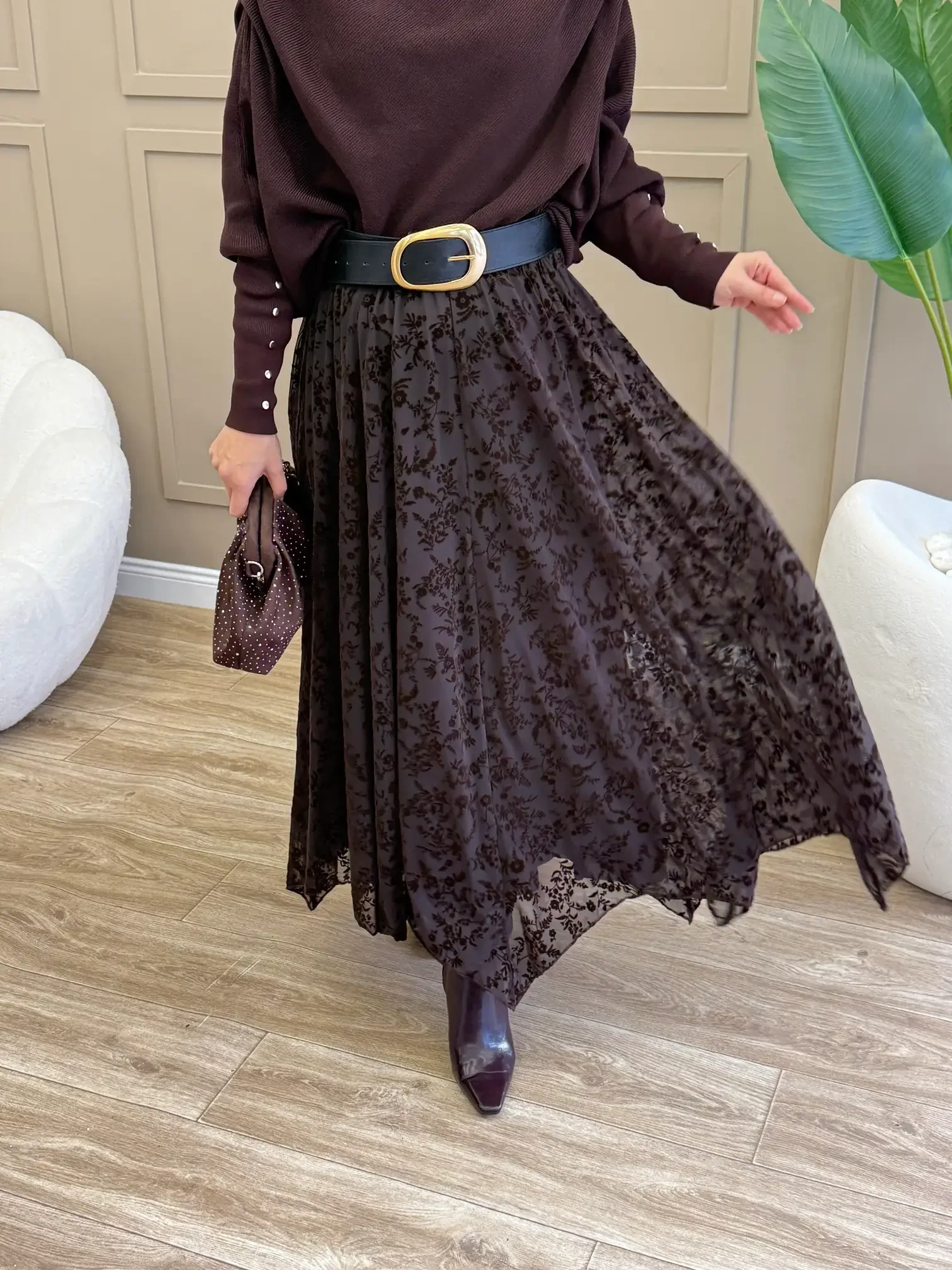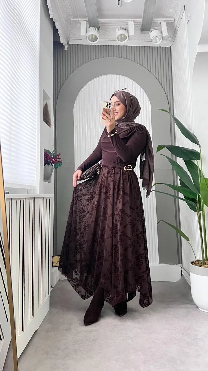Doğal tonların en zarif hali... Bu acı kahve flok baskılı etek, tül üzerine işlenen kadife dokulu çiçek desenleriyle (flok baskı) tasarıma derinlik ve zenginlik katıyor. Kahverenginin sıcak tonu, özellikle bej ve krem gibi toprak tonlarıyla mükemmel bir uyum yakalarken, asimetrik kesimli uçuşan etek uçları romantik bir silüet çiziyor.
