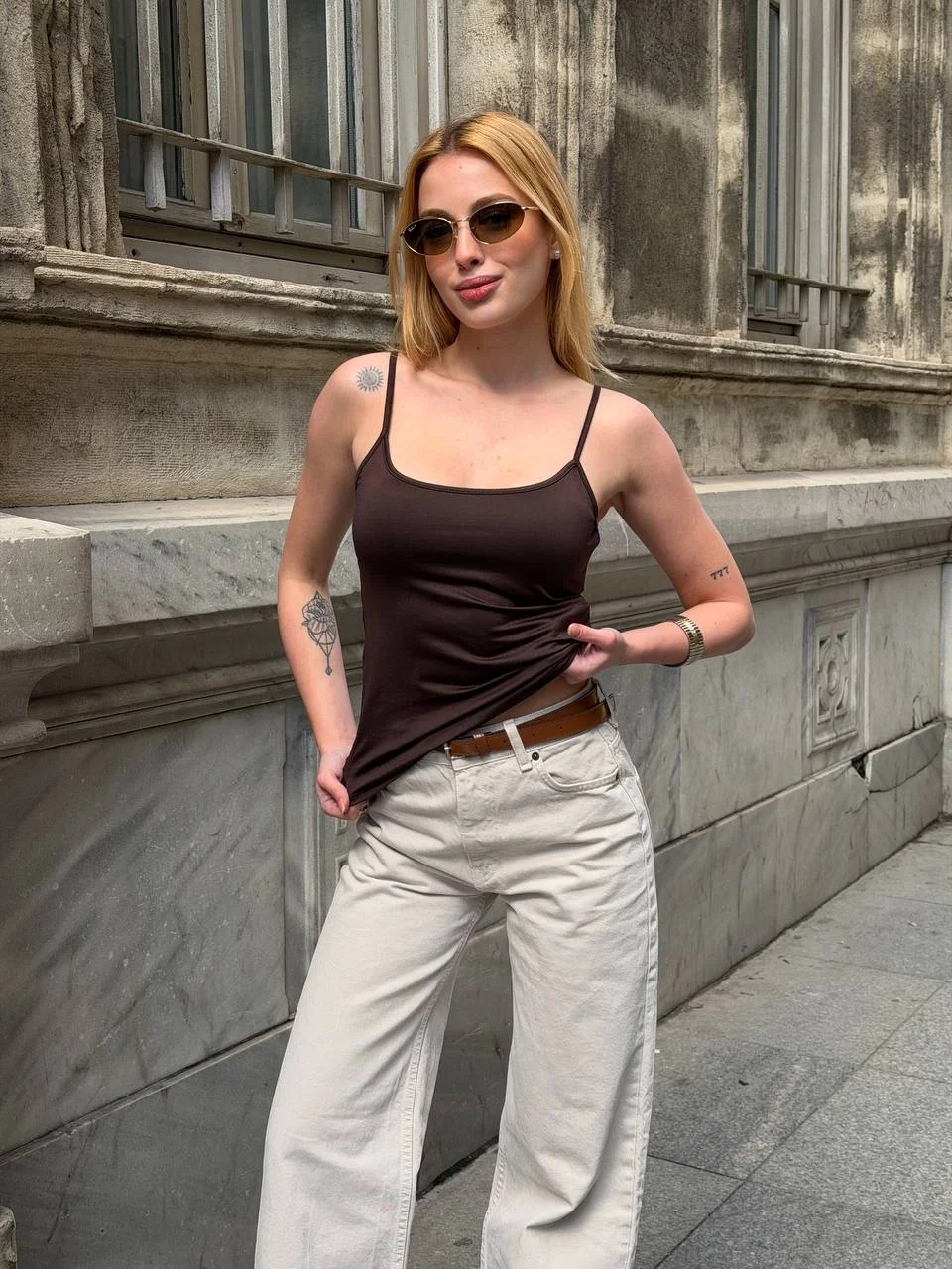 Bu kahve tonlu atleti, görseldeki gibi krem veya ekru rengi yüksek bel bir jean ile tamamlayarak çabasız bir sokak stili oluşturabilirsiniz. Üzerine alacağınız keten bir gömlek ve altın rengi aksesuarlarla görünümünüzü zenginleştirin.