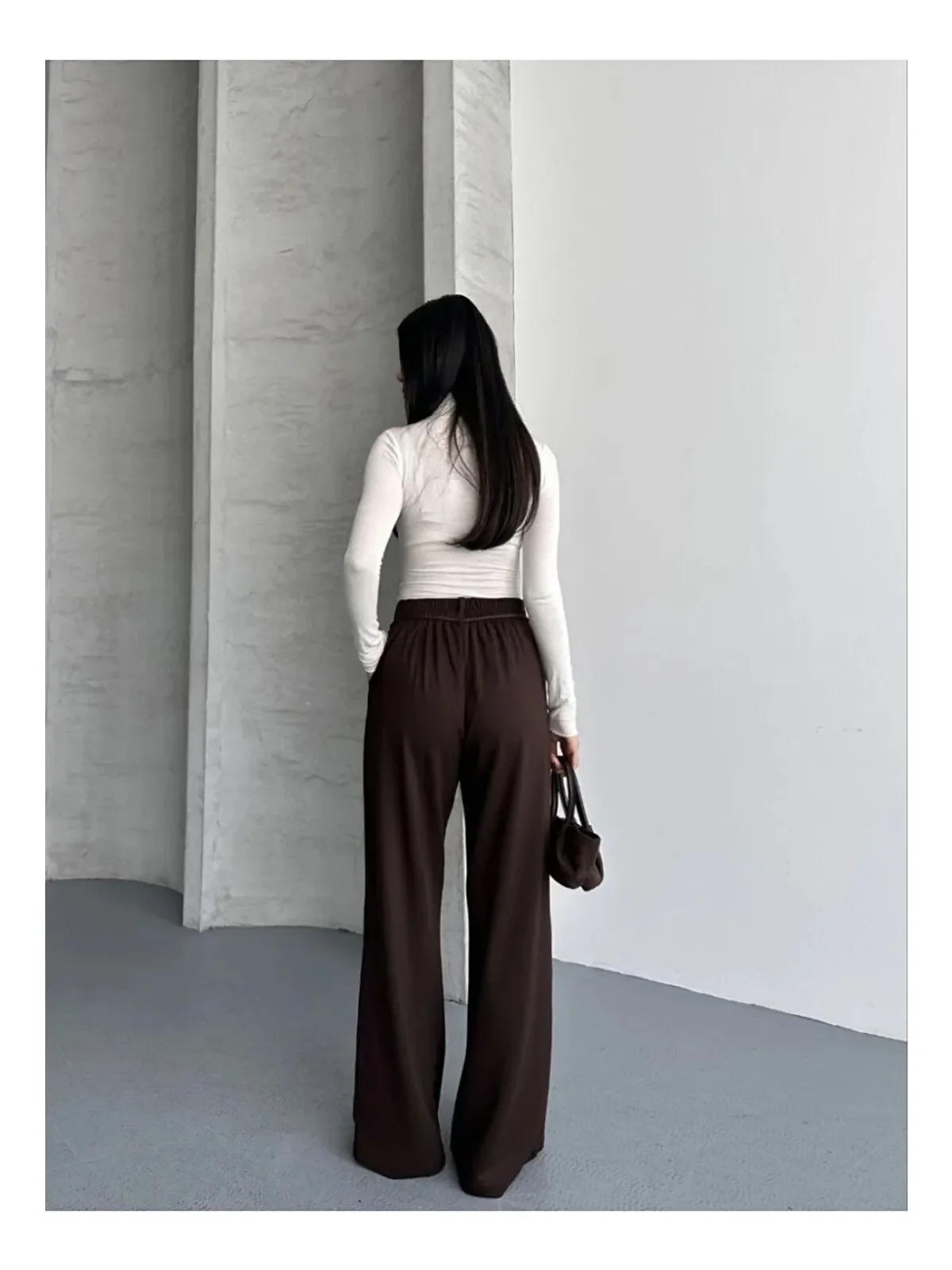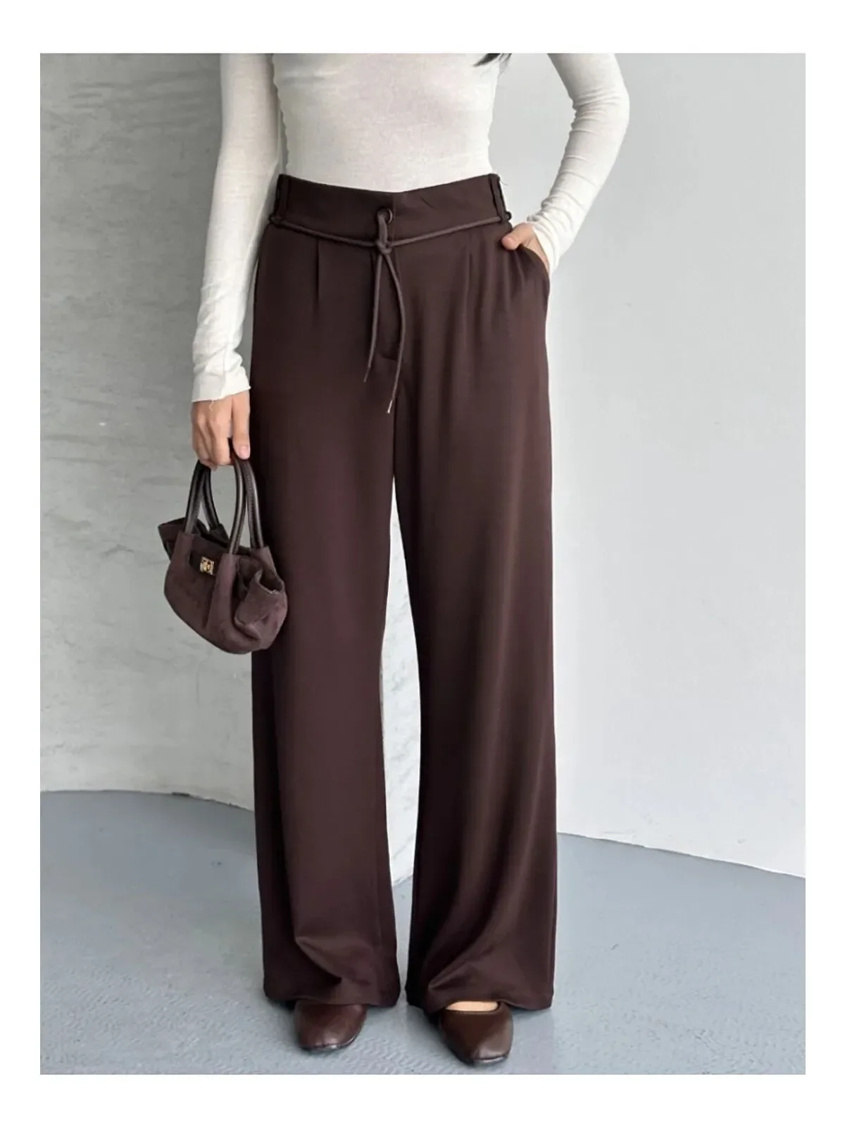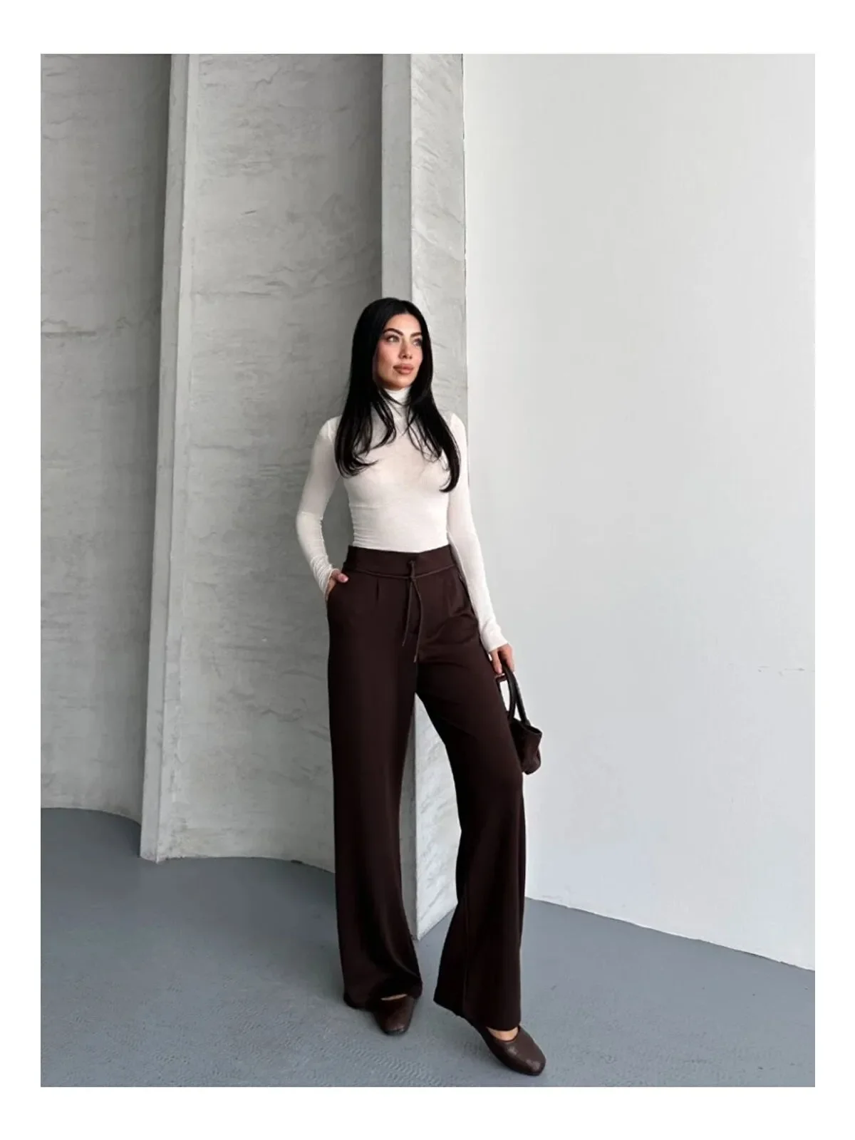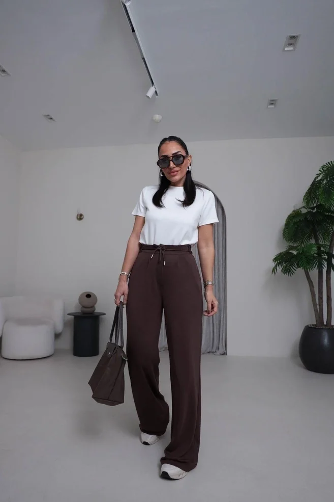 Bu şık kahverengi modal pantolonu, "Ton Sür Ton" modasına uyarak bej veya krem rengi trikolarla kombinleyip yumuşak bir geçiş yaratabilirsiniz. Altın rengi takılar ve sandaletlerle tamamlayarak hem evde hem de dışarıda "eforsuz lüks" stilini yakalayabilirsiniz.