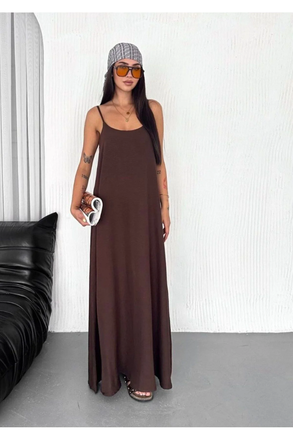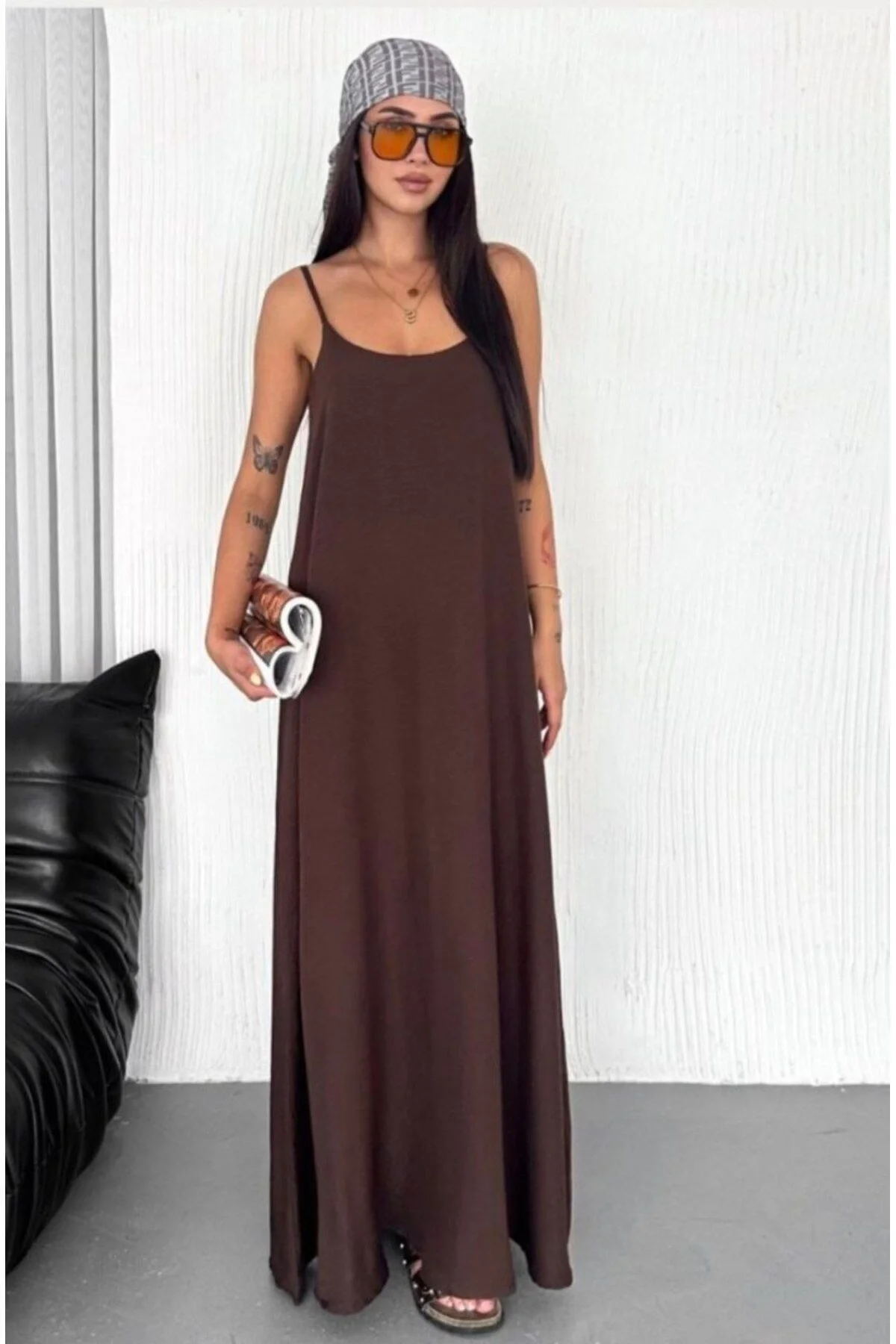 Kadın V Yaka İp Askılı Cepli Salaş Ayrobin Kumaş Maxi Boy Elbise - Kahverengi