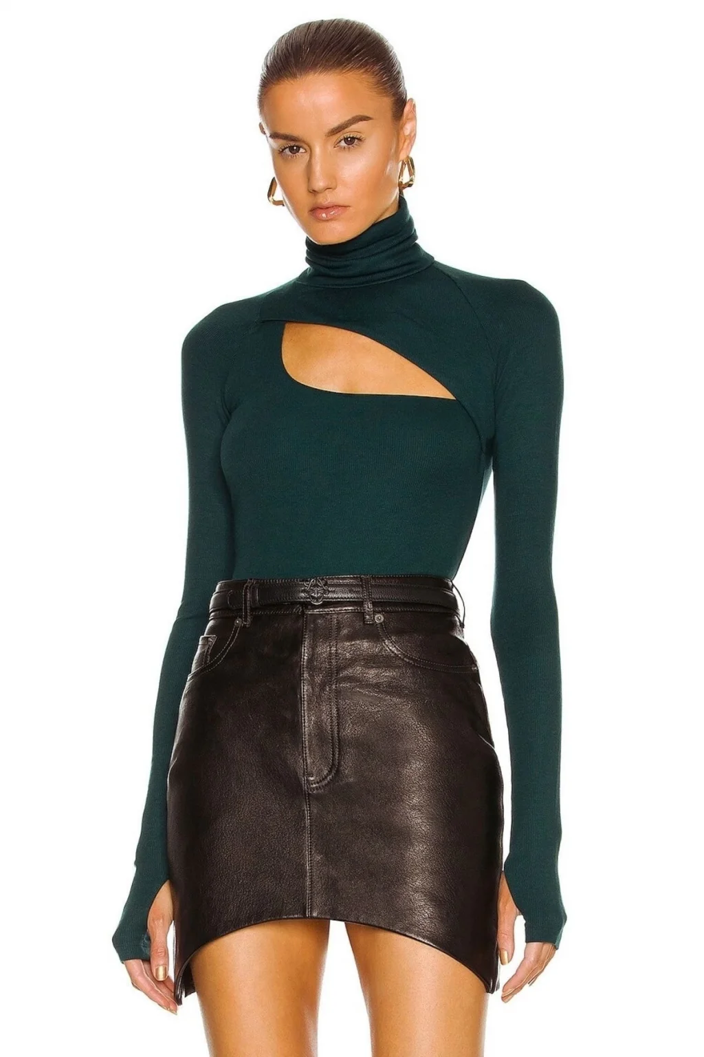 Modern çizgileri ve beklenmedik detayları bir araya getiren Pencere Dekolteli Balıkçı Yaka Bodysuit, sıradanlıktan uzak, iddialı bir stil yaratmak için tasarlandı.