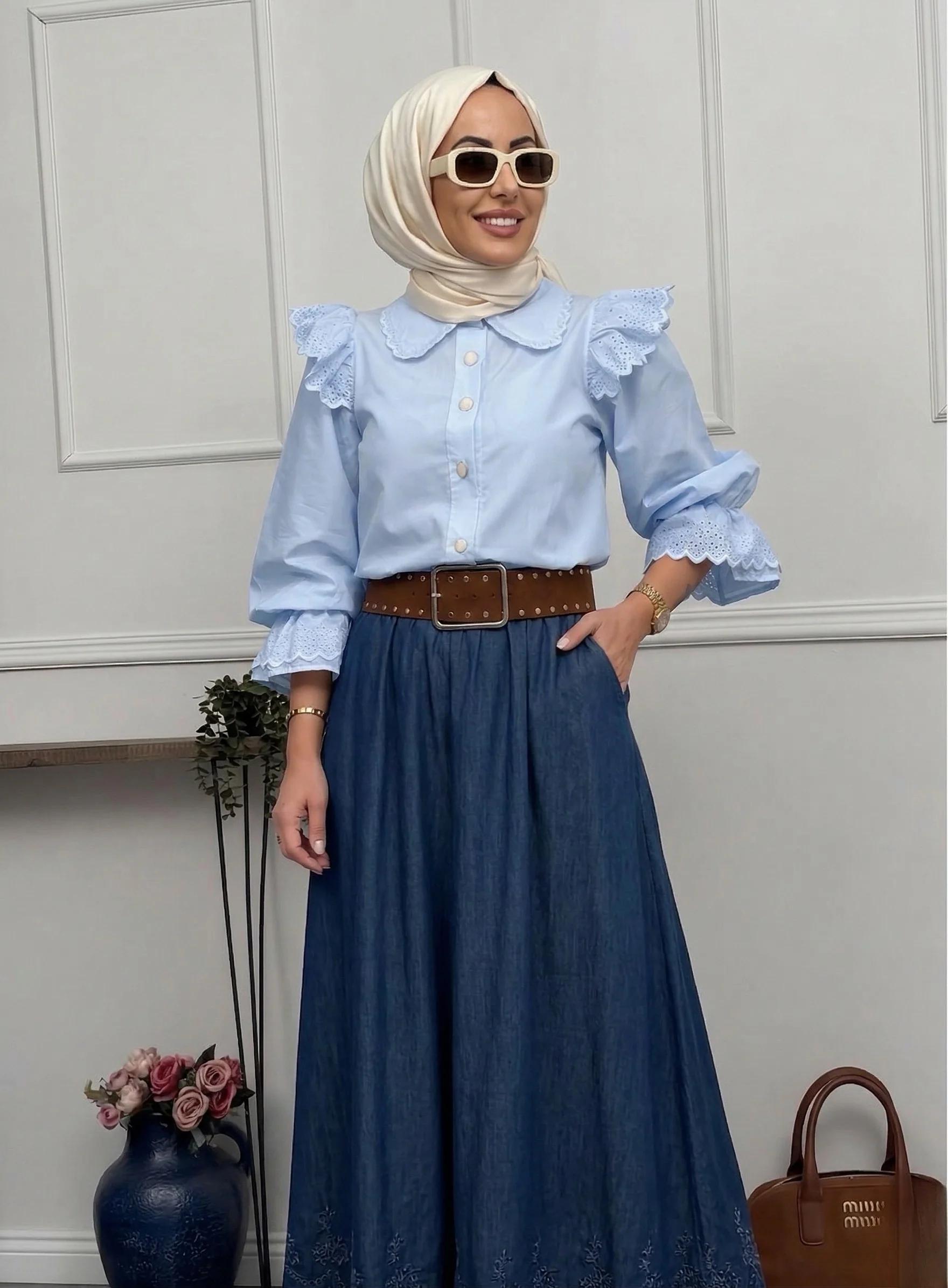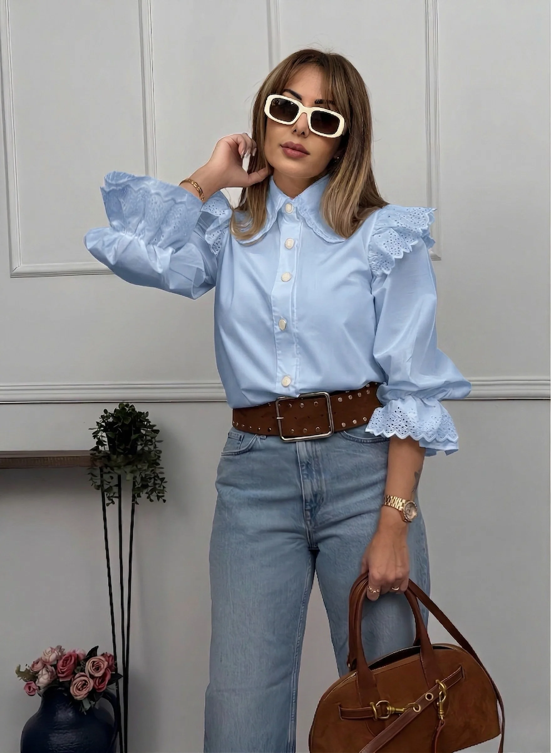 Romantizmin en şık hali... Bu tasarım bebe mavi pamuk keten gömlek, vintage modasının zarif detaylarını günümüze taşıyor. Geniş yakası, omuzlardaki katlı volanları ve manşetleri süsleyen fisto (broderie) işlemeleriyle gardırobunuzun en göz alıcı parçası olacak. Doğal dokusuyla hem şık hem de konforlu.