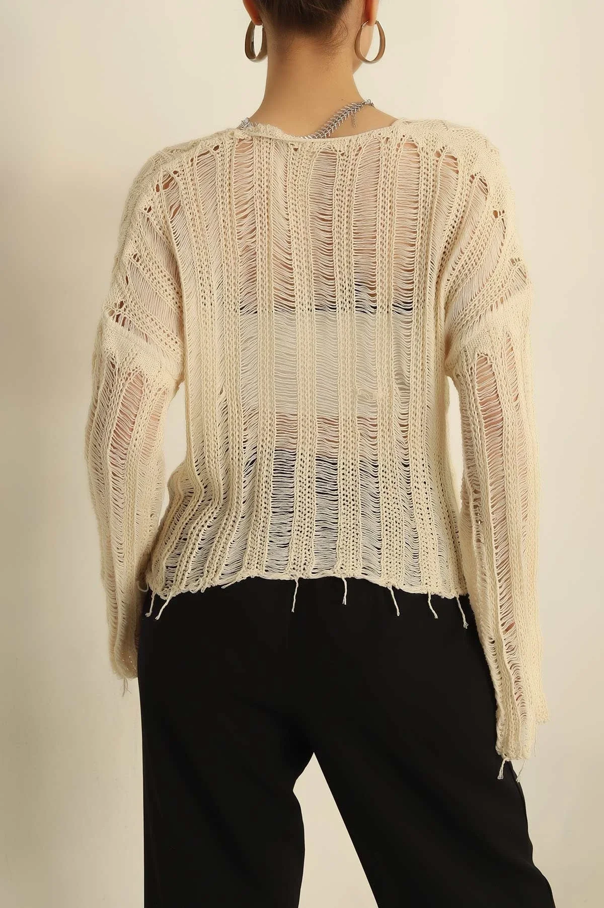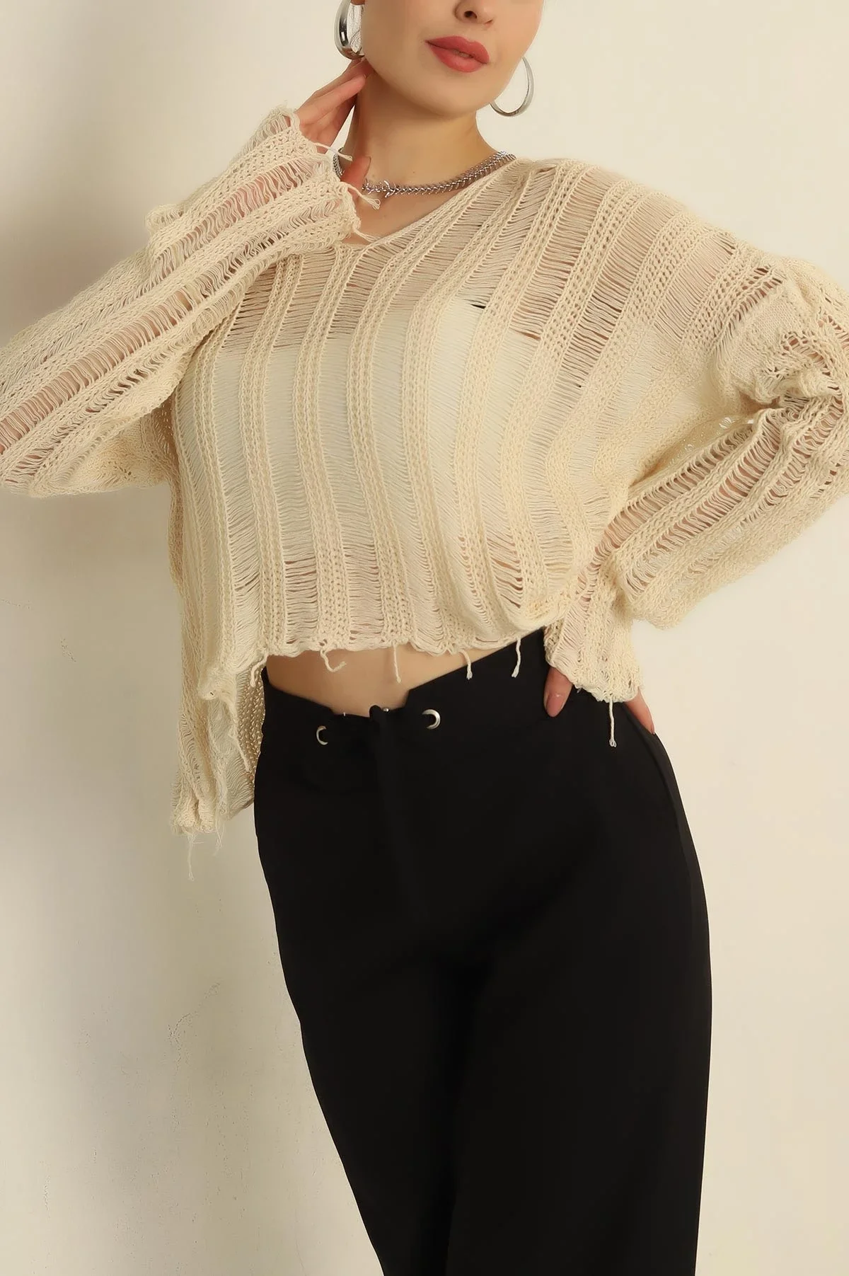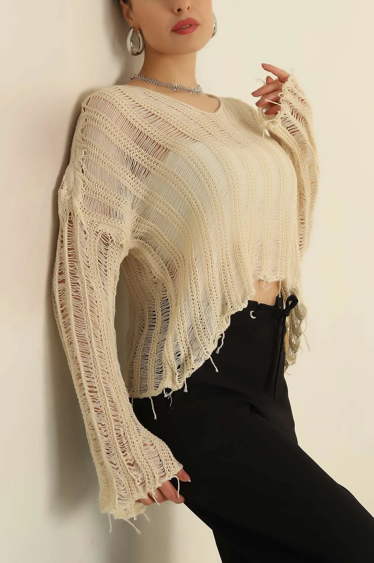 Doğal "nude" tonların sıcaklığını modern bir dokuyla keşfedin! Bu bej ajurlu örme bluz, yırtık detayları ve salaş kalıbıyla hem bohem hem de şehirli bir stil sunuyor. Etek ucundaki püskül detayları, hareketli ve özgür bir görünüm arayanlar için ideal.