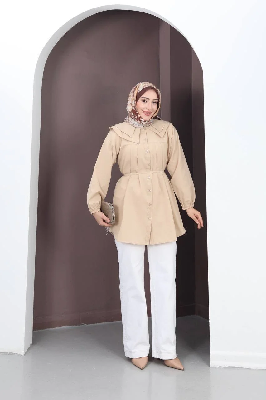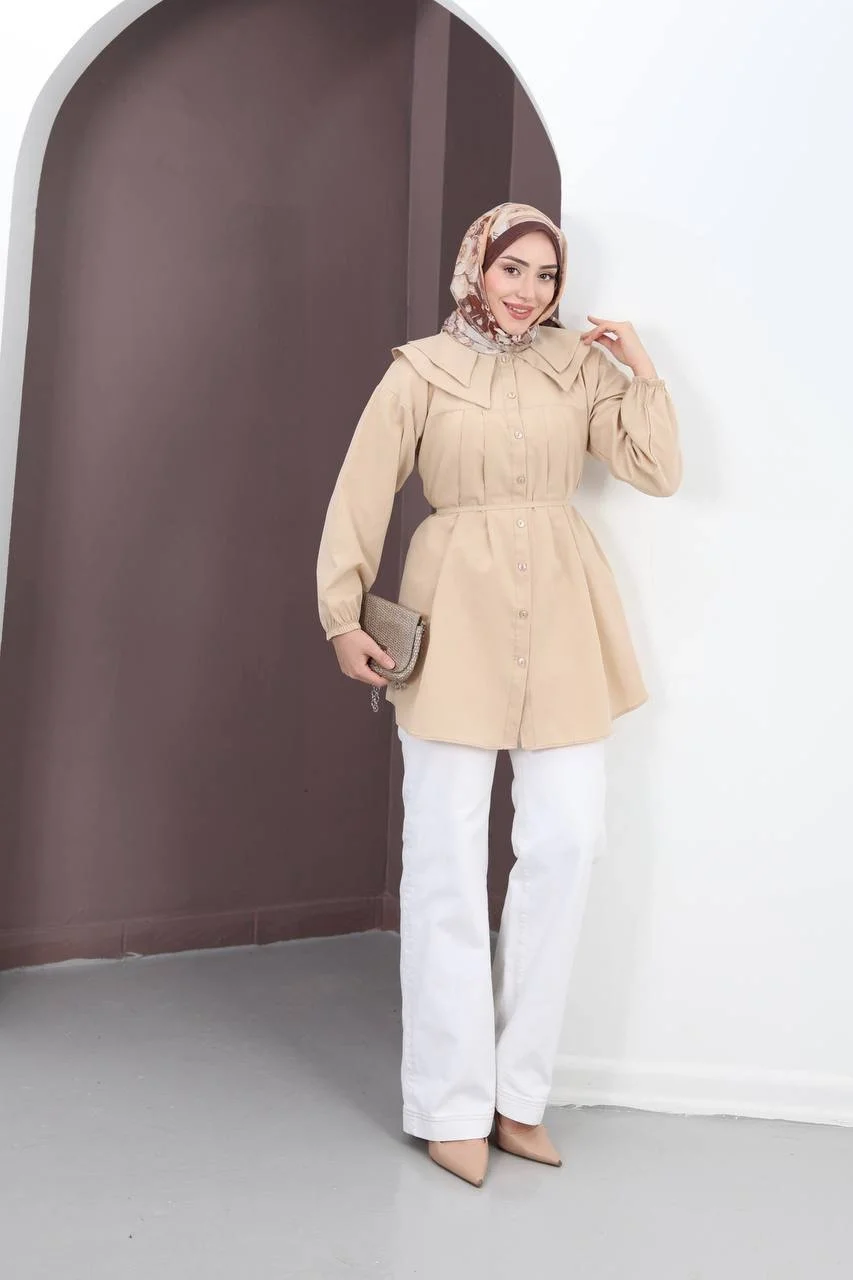 Zarafet ayrıntıda gizlidir... Bu bej dokuma tunik, omuzları kaplayan geniş çift katlı yakası ve göğüs kısmındaki ince pile işçiliği ile fark yaratıyor. Tok duruşlu dokuma kumaşı sayesinde vücuda yapışmaz, hatları belli etmez ve gün boyu ütülü gibi pürüzsüz bir görünüm sunar. İster ofiste ister şık bir davette stilinizden ödün vermeden kullanabilirsiniz.