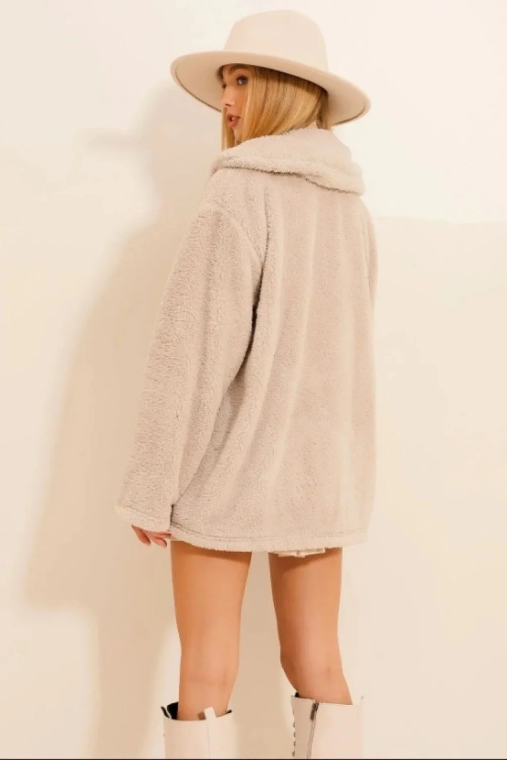 Kadın Ekru Oversize Düğmeli Cepli Kuzu Peluş Mont