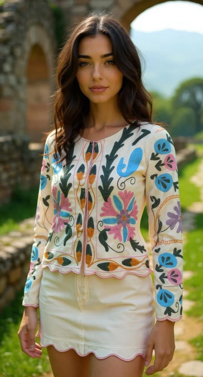 Renkli Suzani Sanatı: Ceketin hem ön hem de arka kısmına yoğun şekilde işlenen nakışlar, her türlü sade kombini saniyeler içinde iddialı ve özenilmiş bir hale getirir.