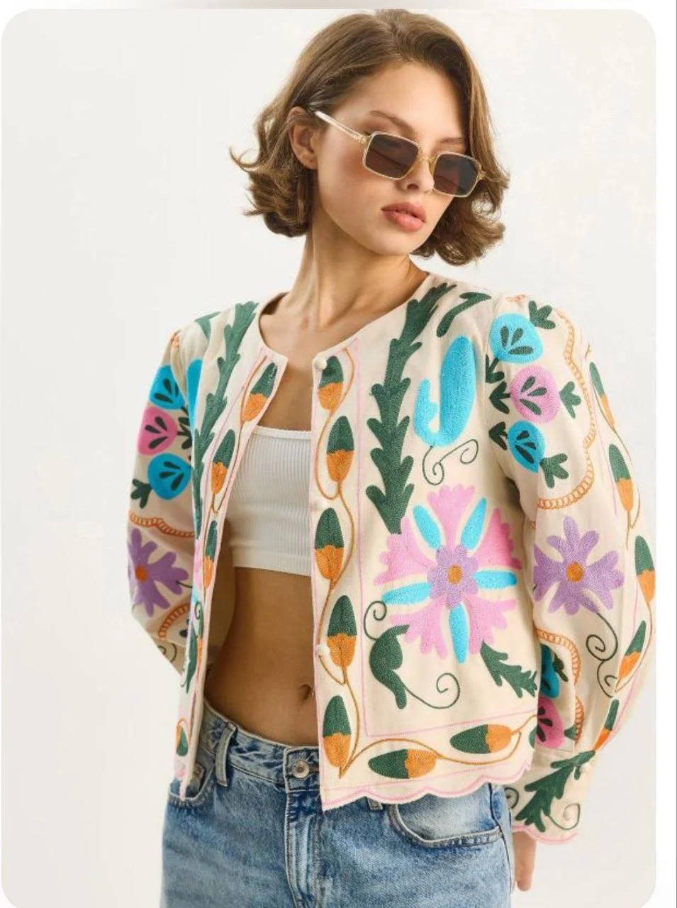Bu renkli nakışlı bej ceketi görseldeki gibi yüksek bel jean pantolonlar ve beyaz bir büstiyer ile kombinleyerek Pinterest tarzını yakalayabilirsiniz. Daha bohem bir görünüm için beyaz dökümlü keten pantolonlar ve hasır çantalar ile eşleştirerek baharın tadını çıkarın.