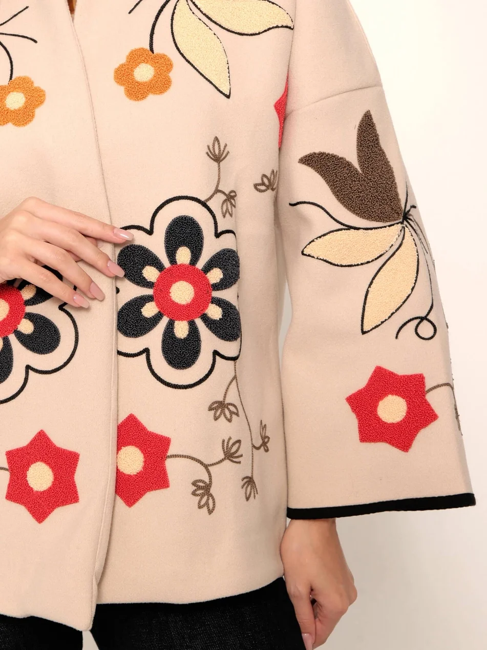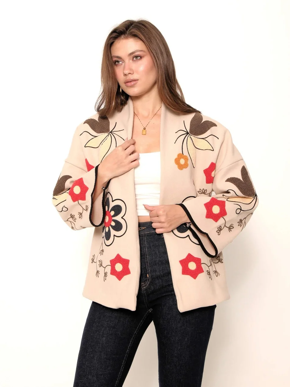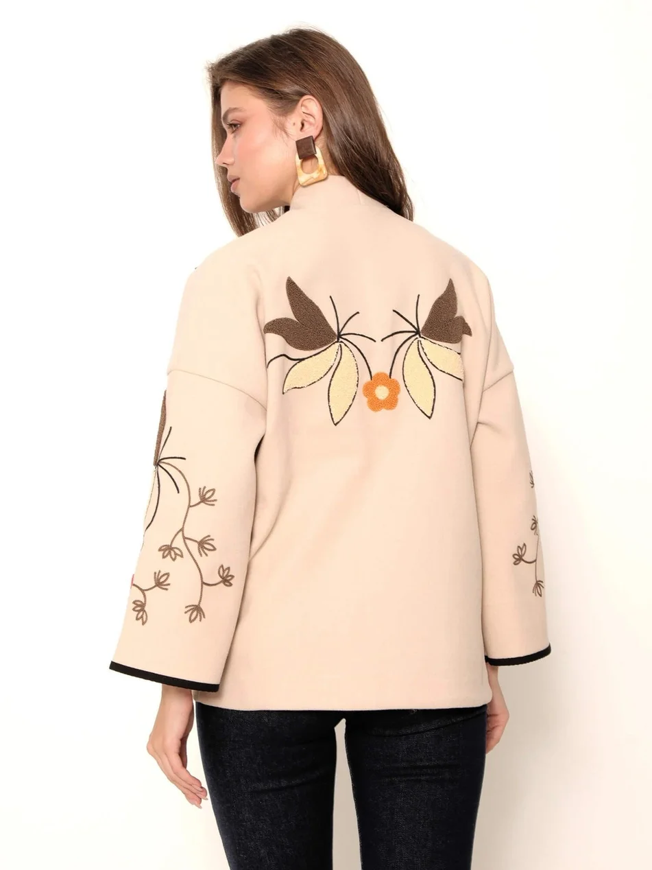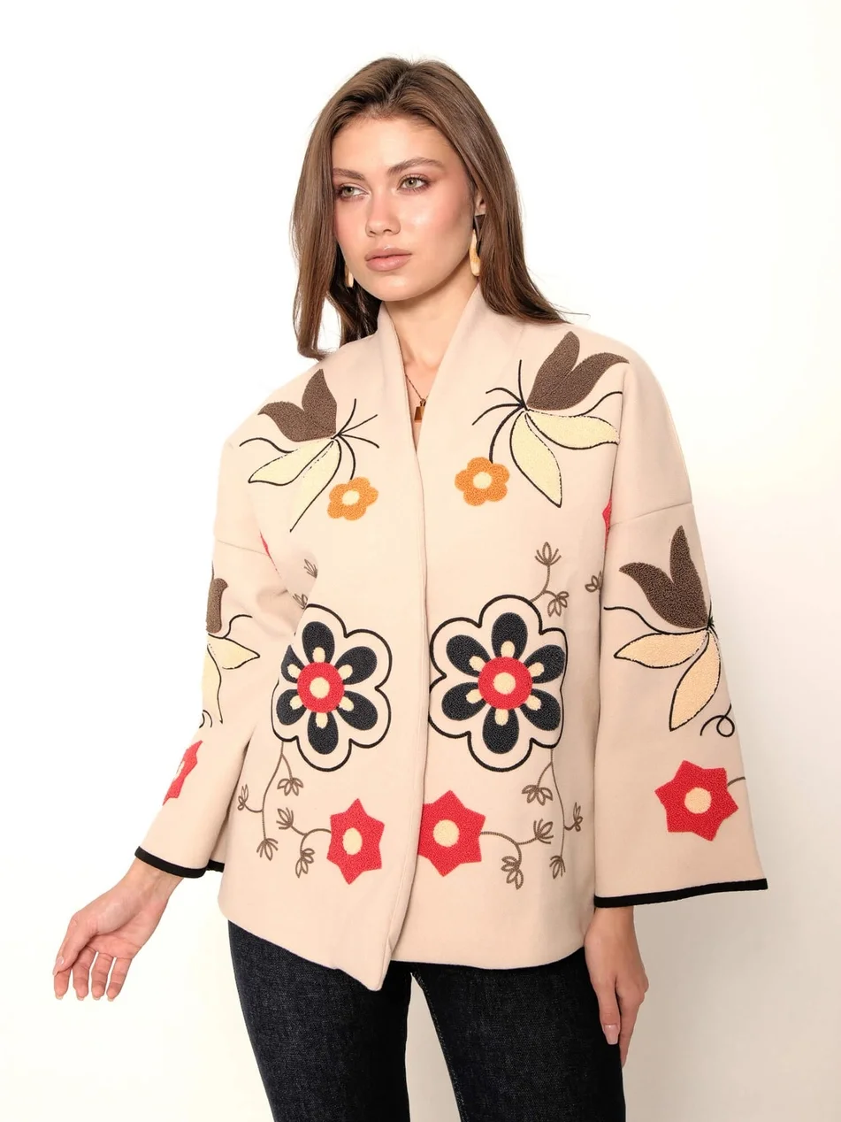 Soğuk havalarda stilinizden ödün vermeyin... Bu özgün tasarım bej kaşe ceket, kalın ve yumuşak dokusuyla sizi sıcak tutarken, üzerindeki büyük ölçekli çiçek nakışlarıyla sanatsal bir duruş sergiliyor. Kimono tarzı geniş kolları ve kontrast siyah biyeleri, klasik kaban görünümünden sıyrılarak modern ve bohem bir stil sunuyor.