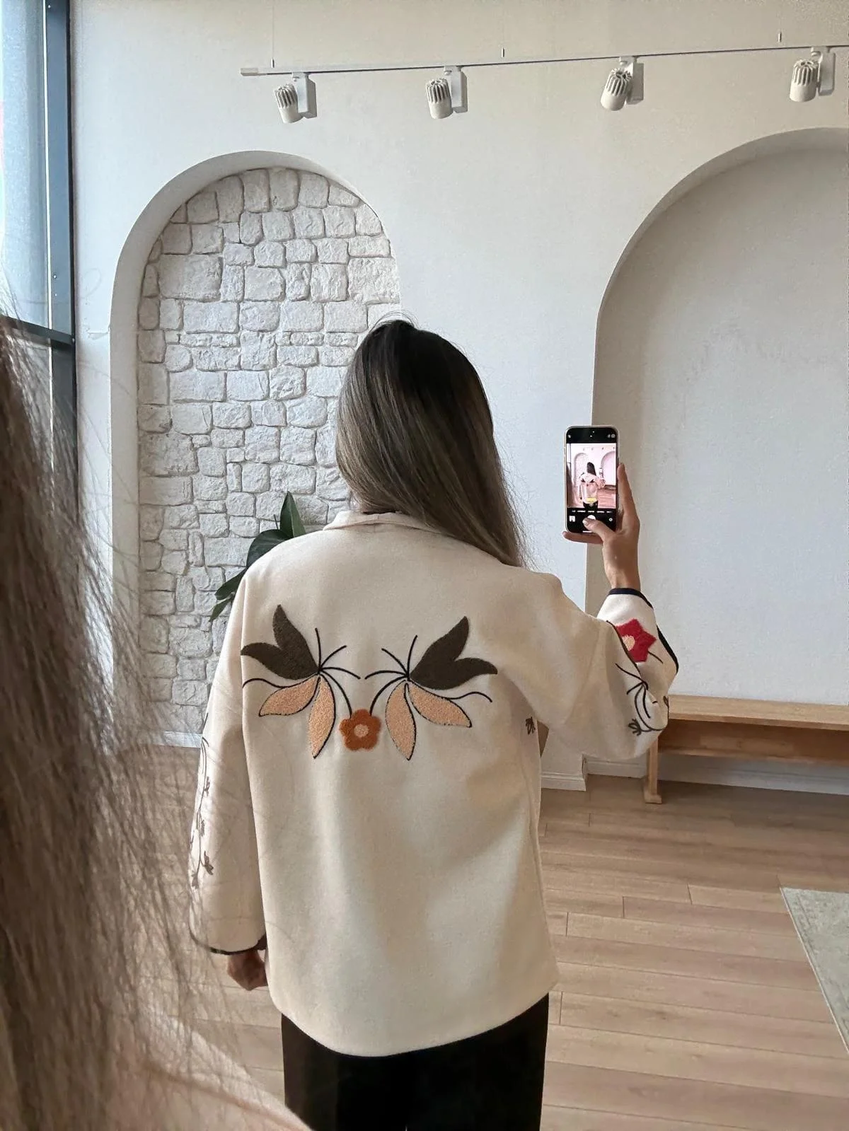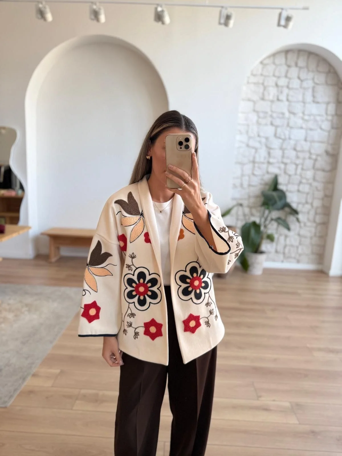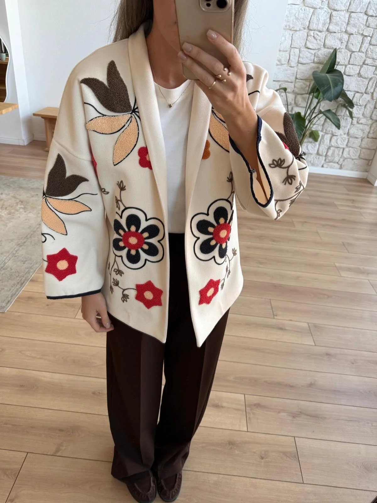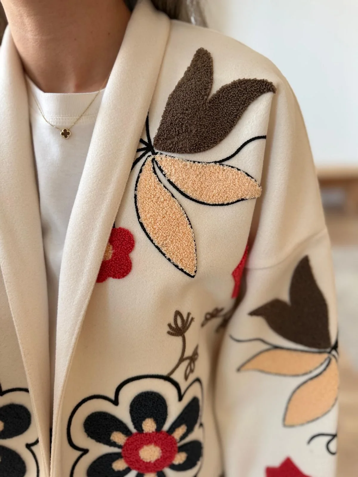 Soğuk havalarda stilinizden ödün vermeyin... Bu özgün tasarım bej kaşe ceket, kalın ve yumuşak dokusuyla sizi sıcak tutarken, üzerindeki büyük ölçekli çiçek nakışlarıyla sanatsal bir duruş sergiliyor. Kimono tarzı geniş kolları ve kontrast siyah biyeleri, klasik kaban görünümünden sıyrılarak modern ve bohem bir stil sunuyor.