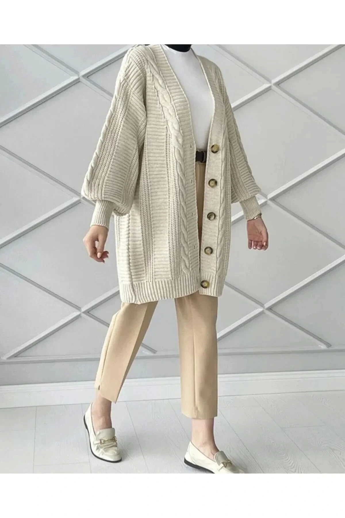Soğuk havaların en şık kalkanı... Bu bej saç örgü desenli uzun hırka, geleneksel el örgüsü görünümünü modern oversize kesimle birleştiriyor. Balon kolları, büyük düğme detayları ve kalçayı örten uzun boyuyla hem ev rahatlığında hem de sokak stilinde size eşlik etmeye hazır.
