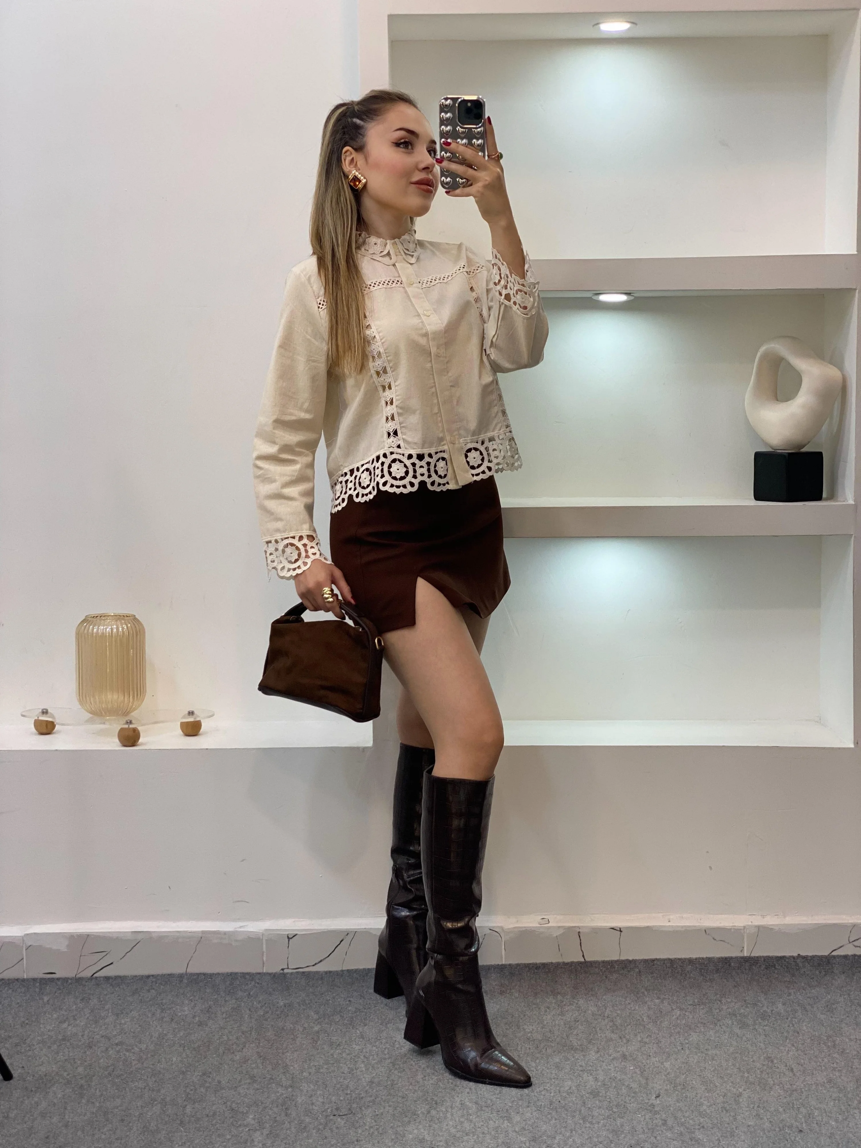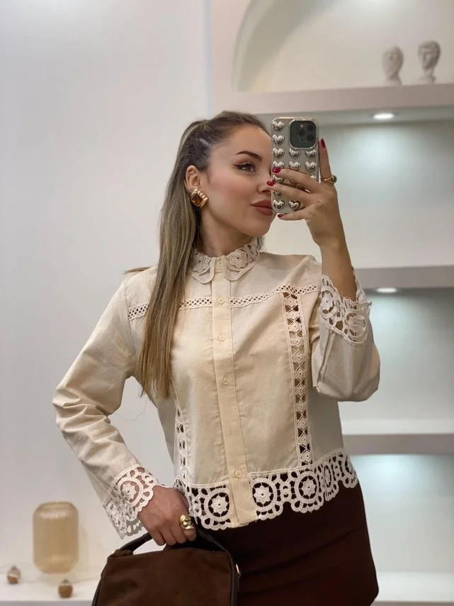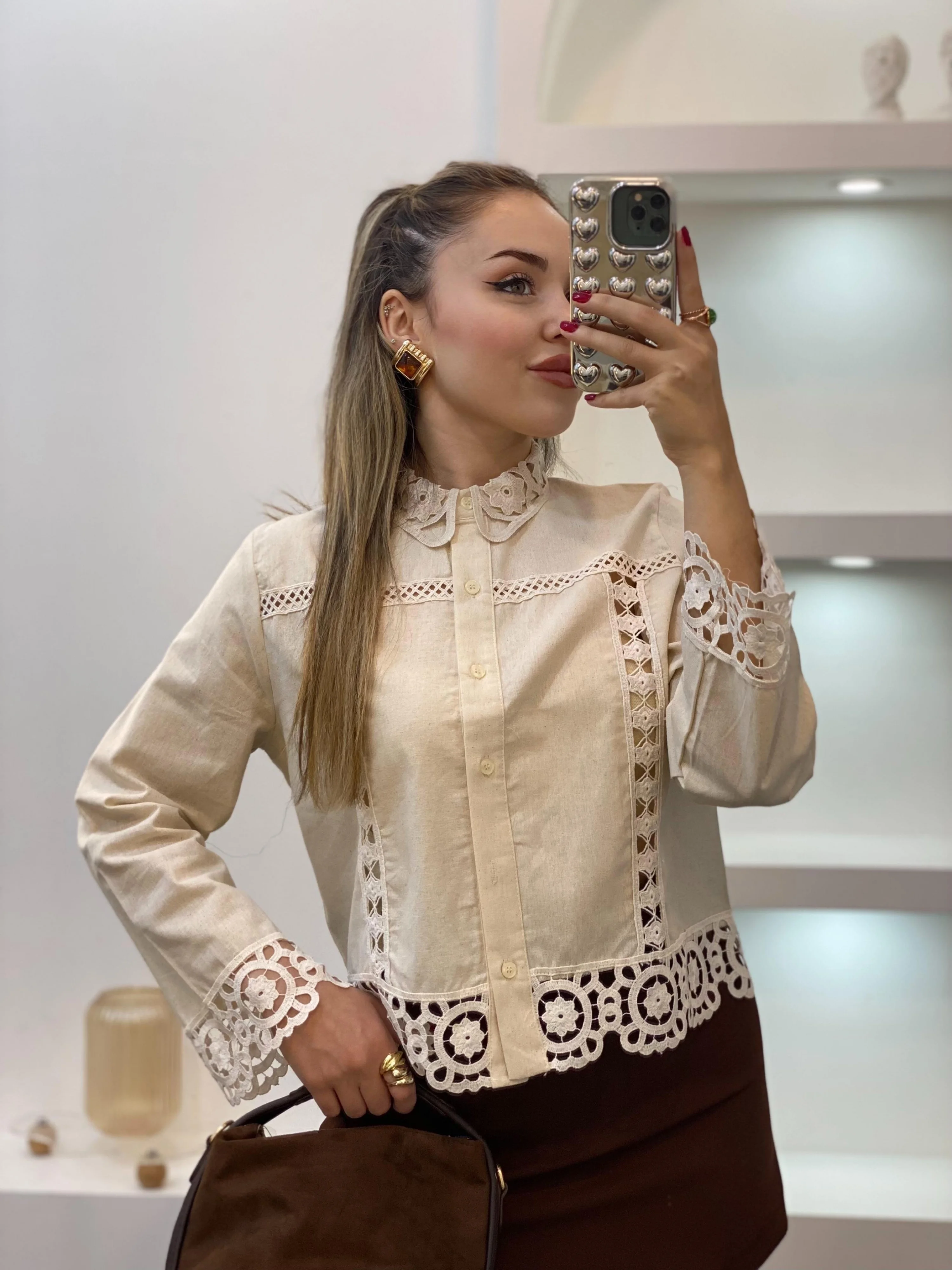 Romantik bir dokunuşla stilinizi yeniden tanımlayın! Bu tasarım motifli bej gömlek, geleneksel dantel sanatını modern kesimle buluşturuyor. Pamuklu keten karışımı kumaşıyla cildinize nefes aldırırken, yaka, manşet ve etek ucundaki gipur detaylarıyla benzersiz bir şıklık sunar.