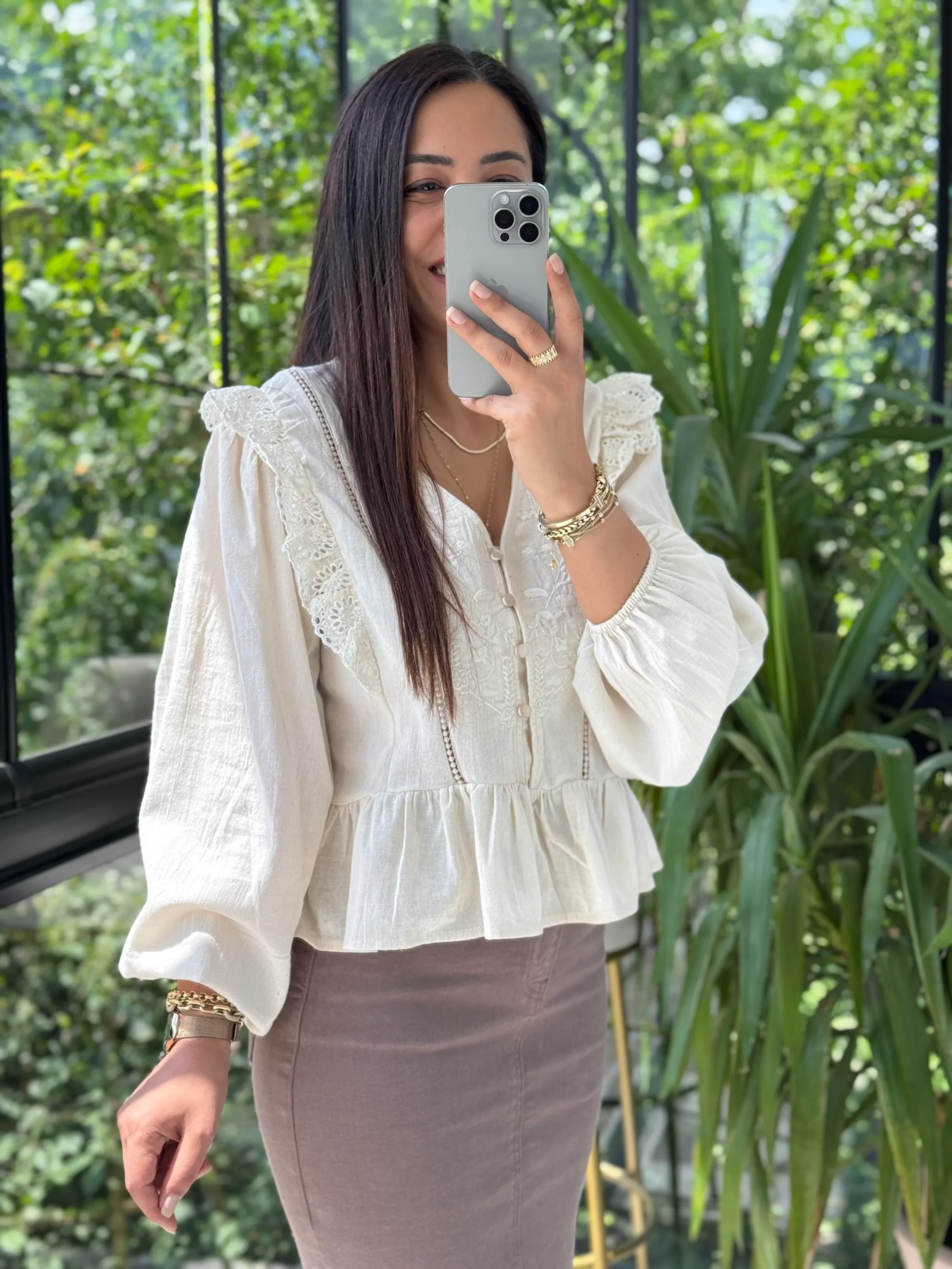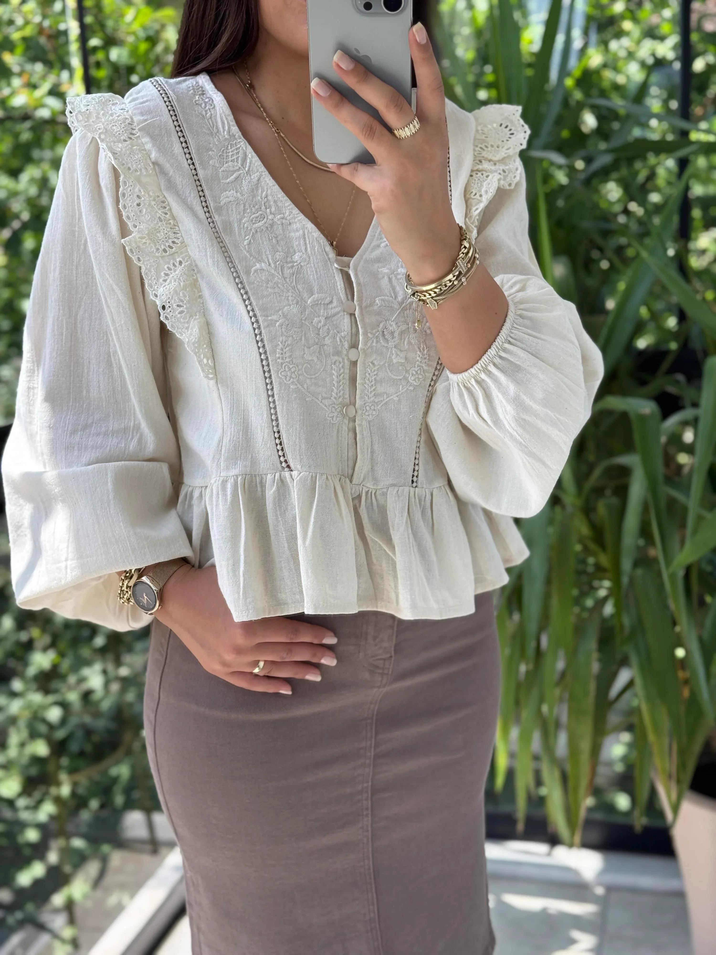 Bohem stilin en zarif hali... Bu bej fisto işlemeli peplum bluz, üzerindeki narin çiçek nakışları ve omuzlardan inen fırfır detaylarıyla büyüleyici bir görünüm sunuyor. Keten görünümlü doğal dokusu ve V yaka kesimiyle hem günlük şıklığınızda hem de özel davetlerde fark yaratacak bir parça.