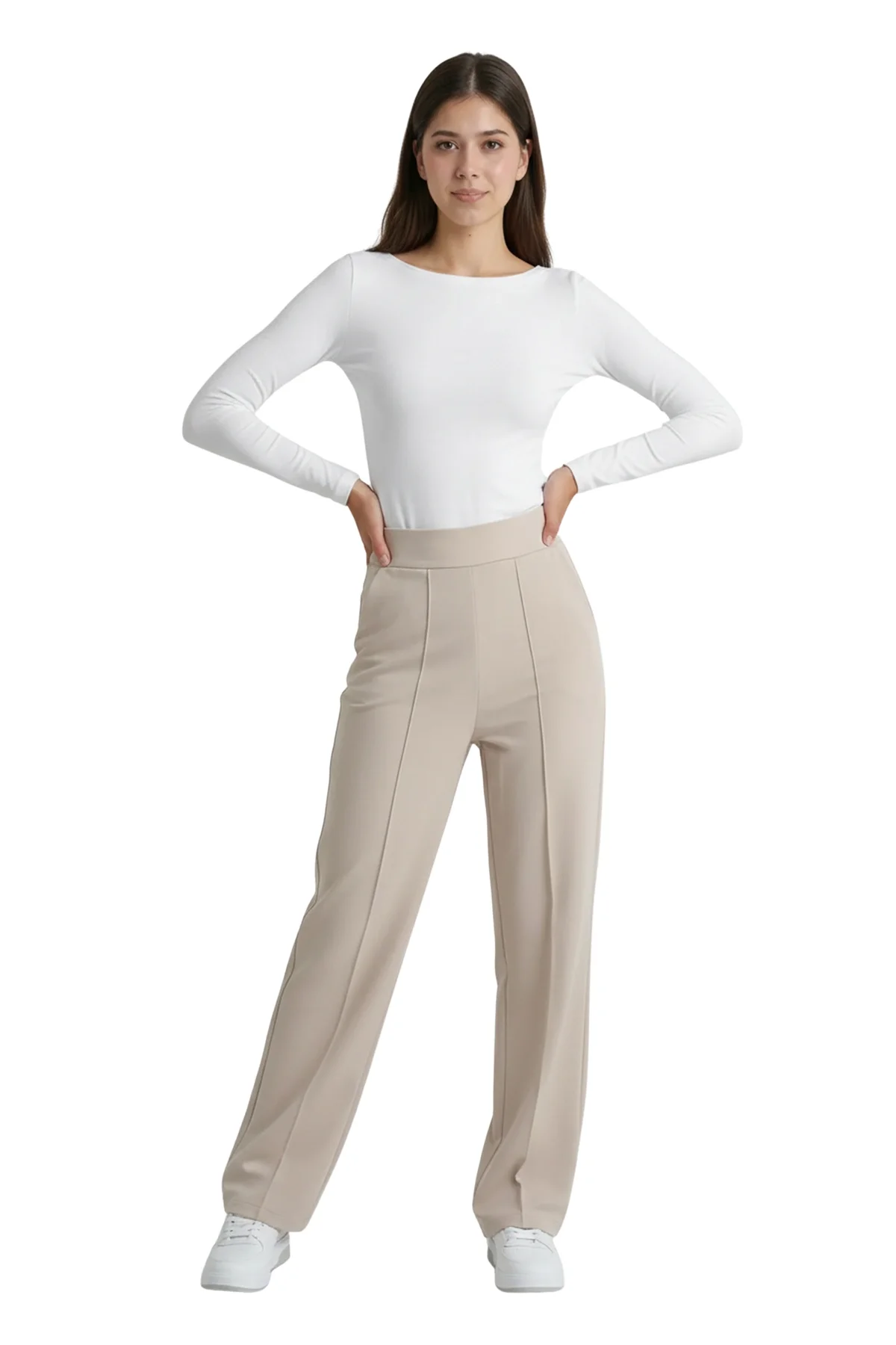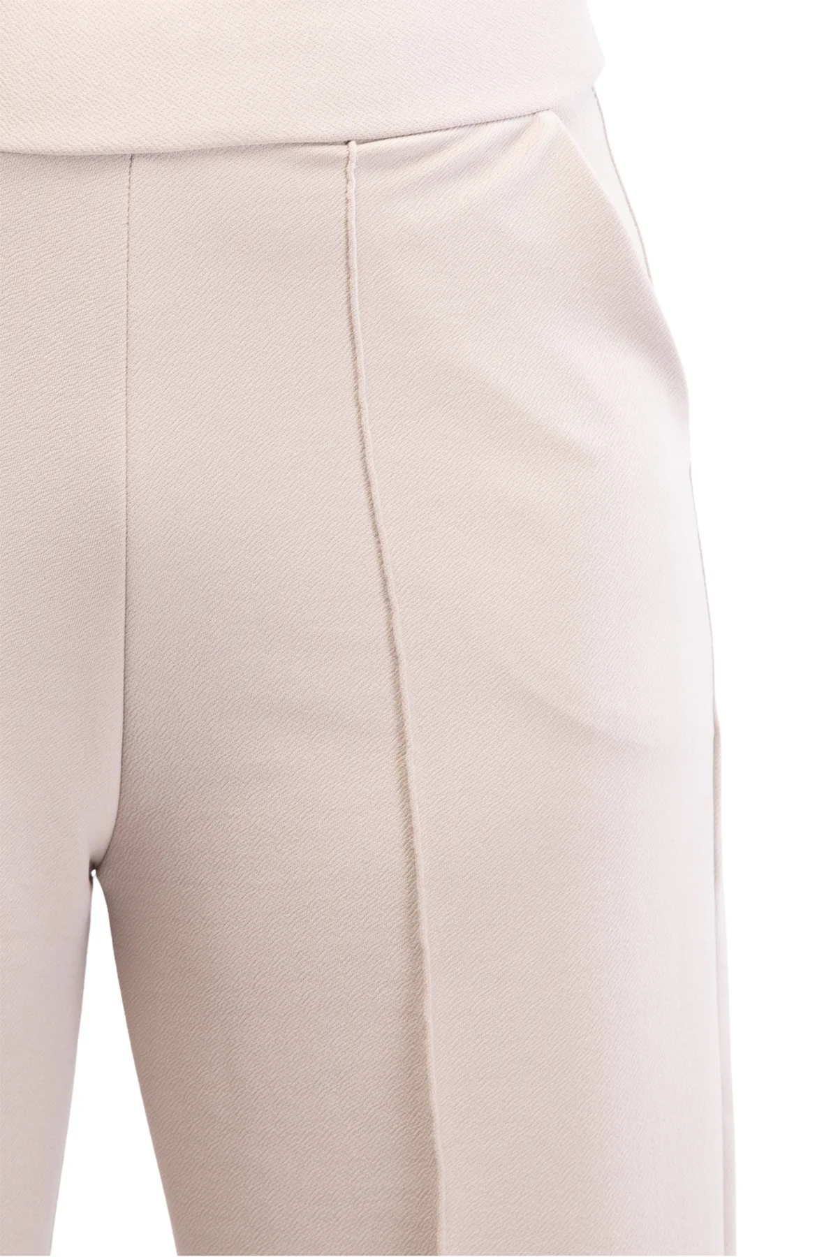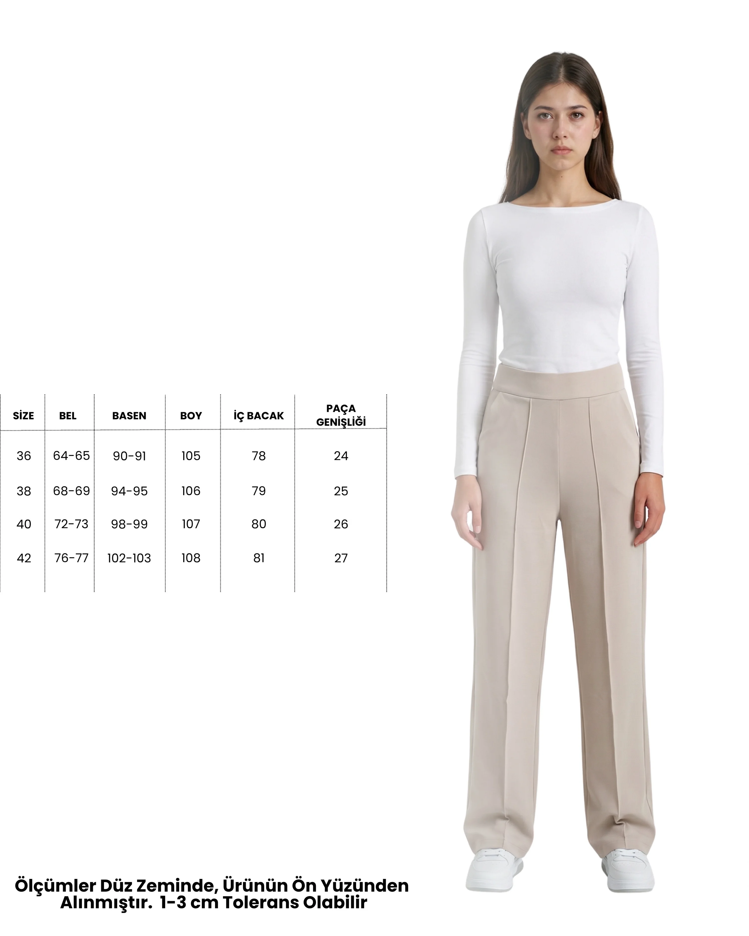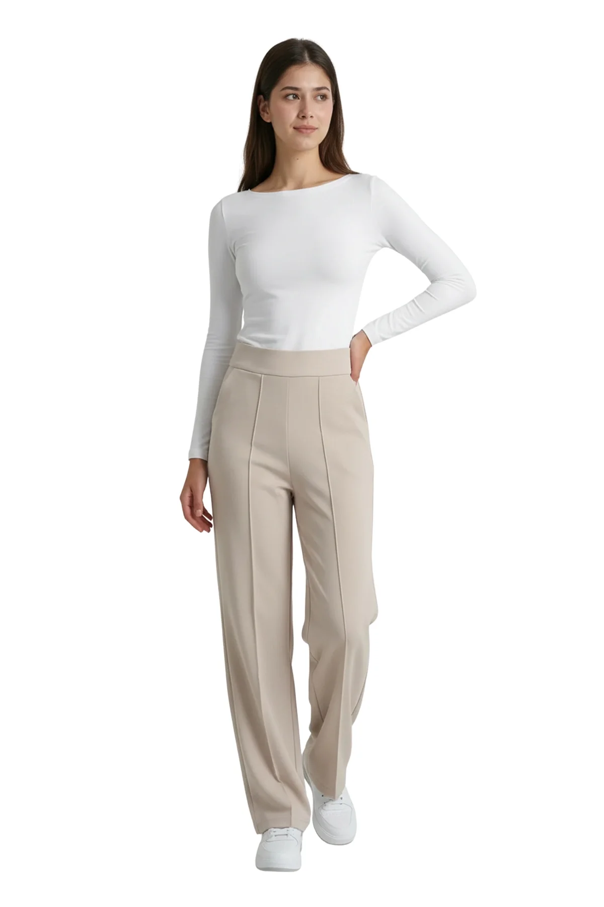 Aydınlık ve zarif bir stilin anahtarı! Bu bej yüksek bel pantolon, dökümlü birinci sınıf krep kumaşı ve bacak boyunu uzatan çimalı (dikişli iz) detayıyla hem fresh hem de profesyonel bir duruş sergiliyor. Krep kumaşın hafif esnek ve asla kırışmayan yapısı sayesinde, günün her saati ilk giydiğiniz andaki gibi kusursuz görüneceksiniz.