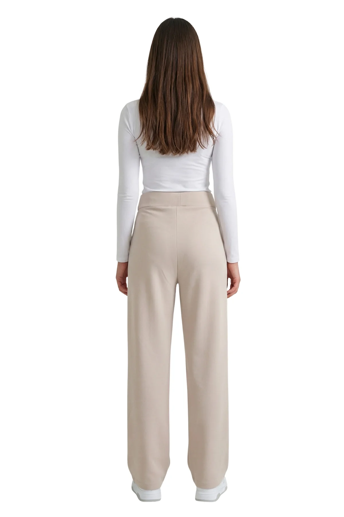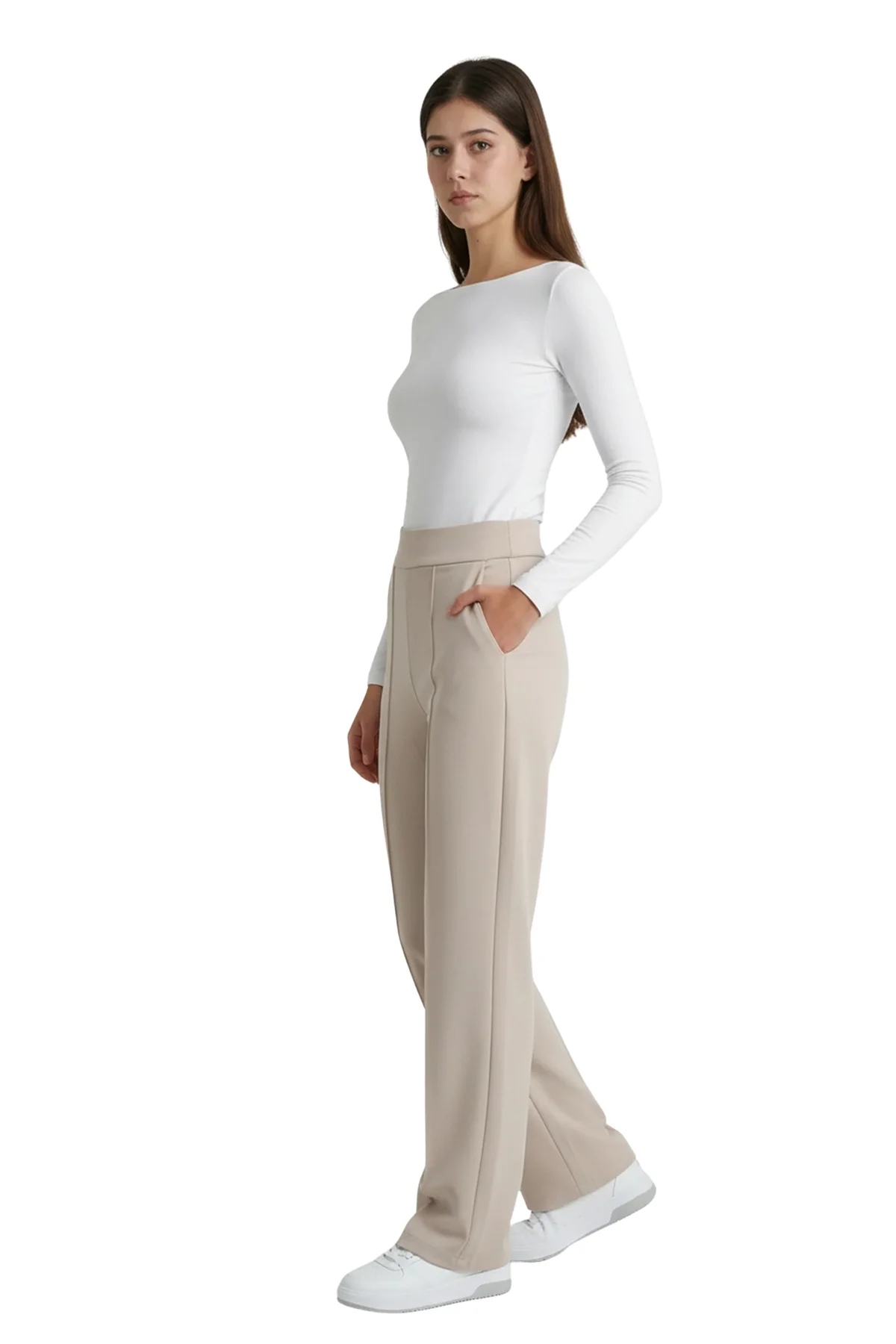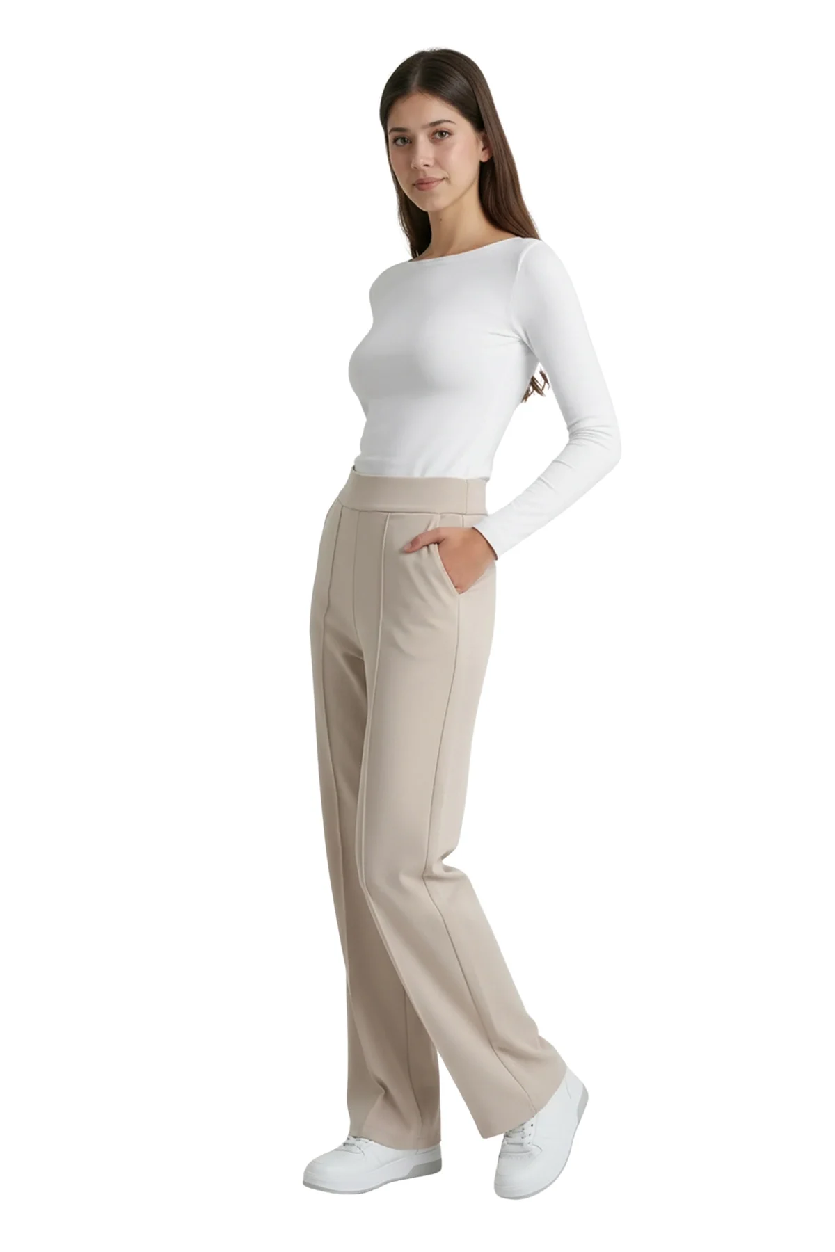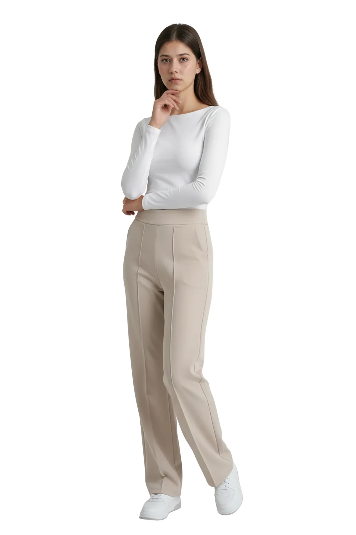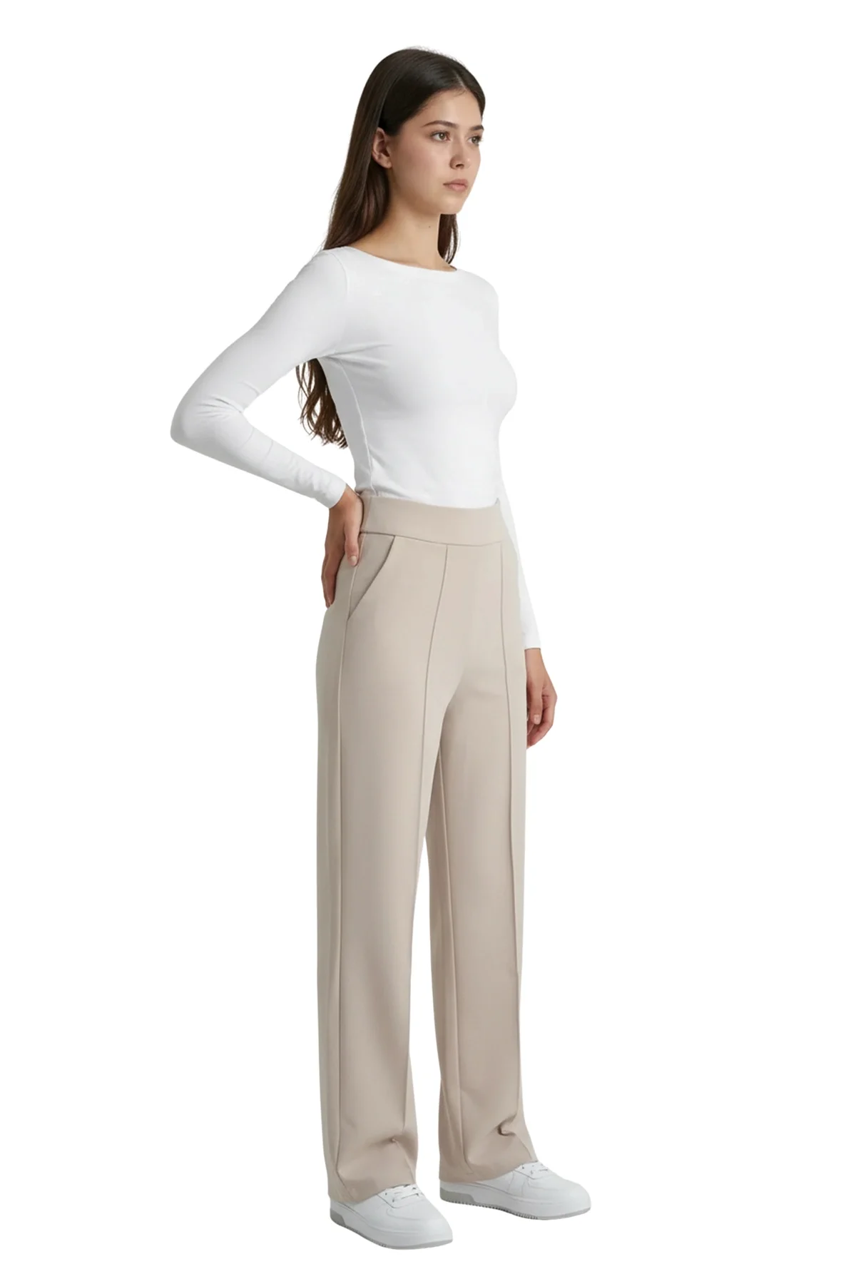 Aydınlık ve zarif bir stilin anahtarı! Bu bej yüksek bel pantolon, dökümlü birinci sınıf krep kumaşı ve bacak boyunu uzatan çimalı (dikişli iz) detayıyla hem fresh hem de profesyonel bir duruş sergiliyor. Krep kumaşın hafif esnek ve asla kırışmayan yapısı sayesinde, günün her saati ilk giydiğiniz andaki gibi kusursuz görüneceksiniz.