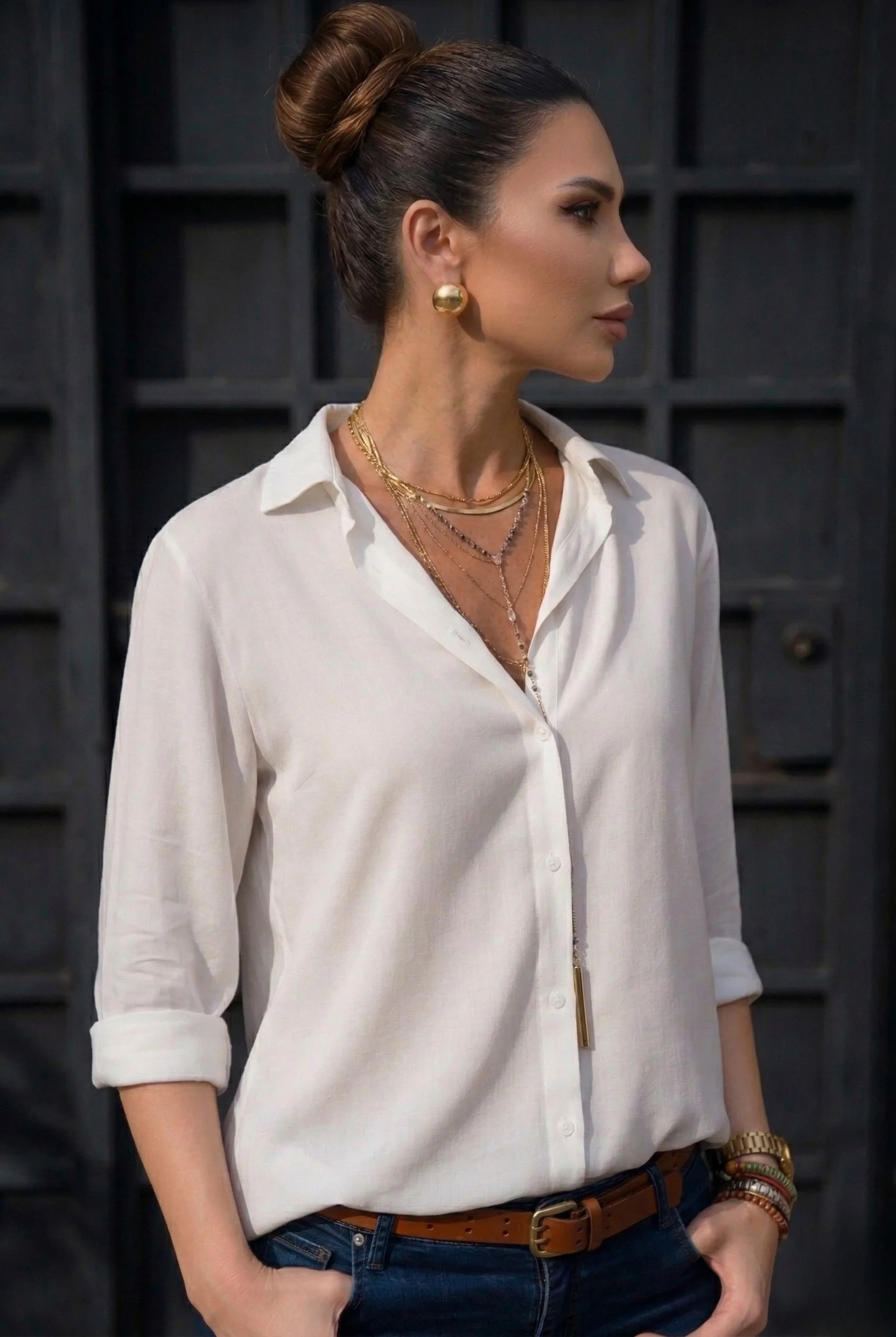 Bu beyaz dokuma gömleği, lacivert bir blazer ceket ve kumaş pantolonla kombinleyerek kusursuz ofis şıklığı yakalayabilirsiniz. Günlük tarz için kol uçlarını kıvırıp kargo pantolonlar veya denim şortlarla eşleştirerek safari tarzınızı ön plana çıkarın.