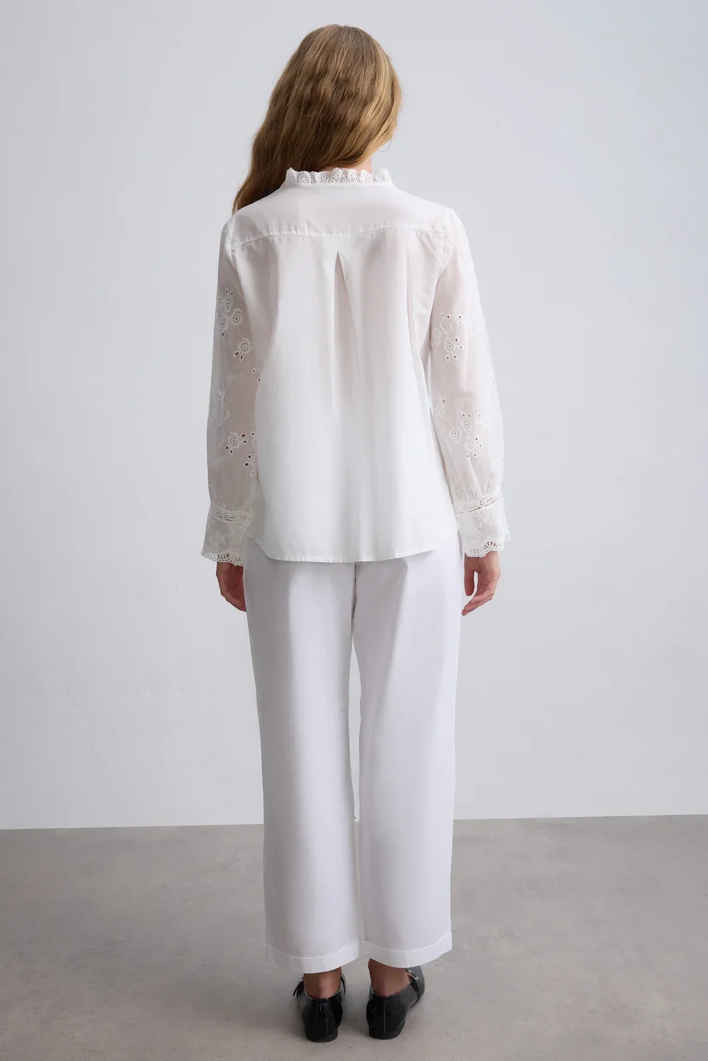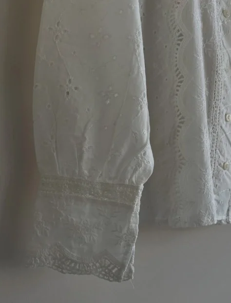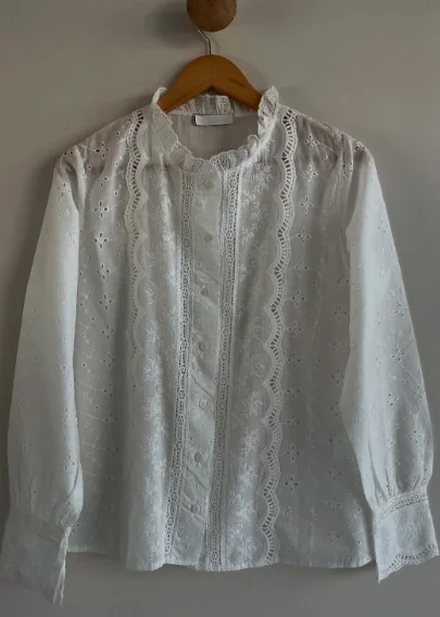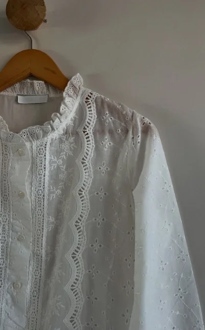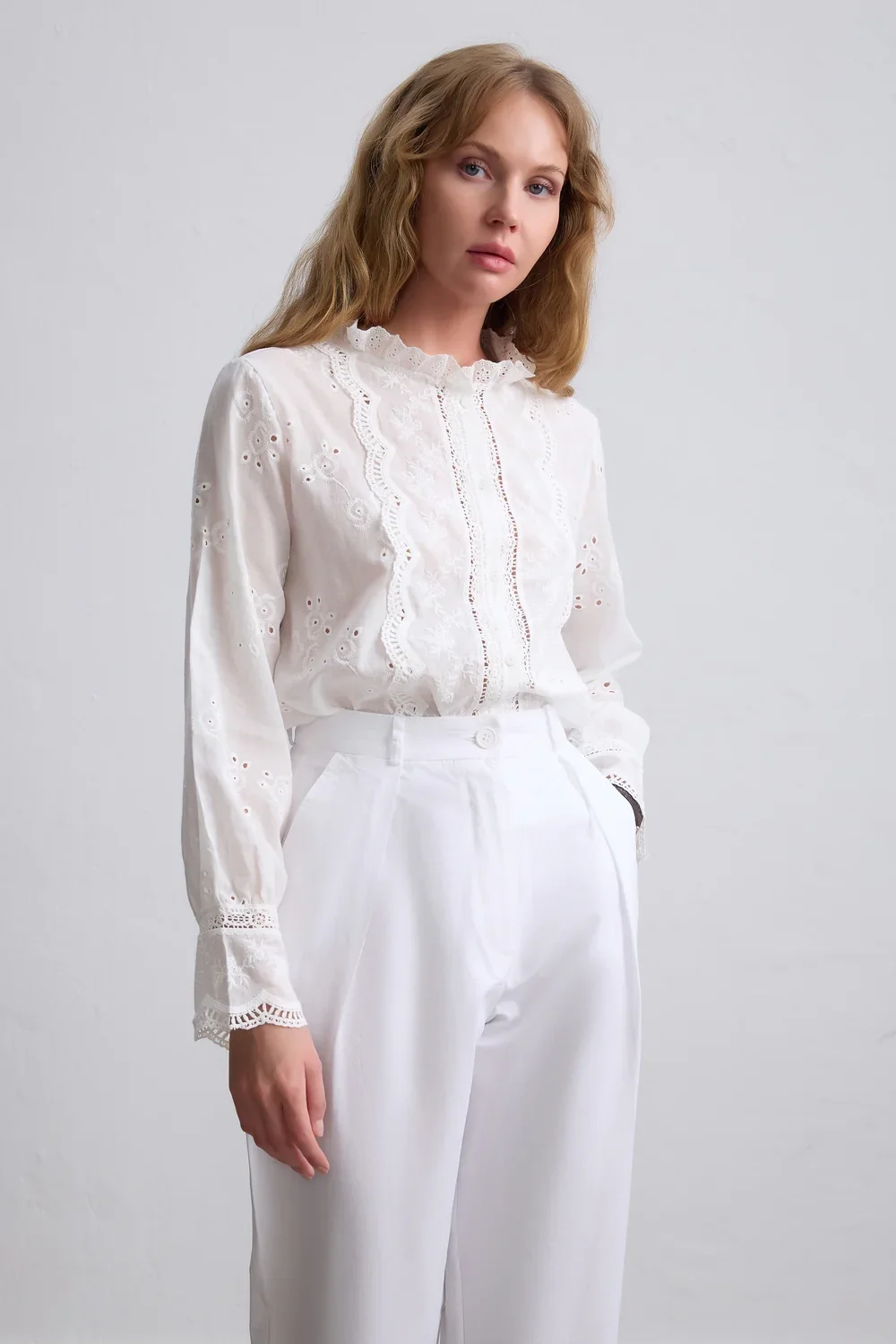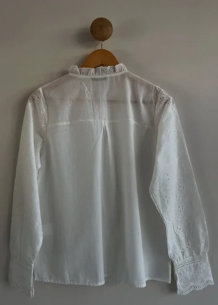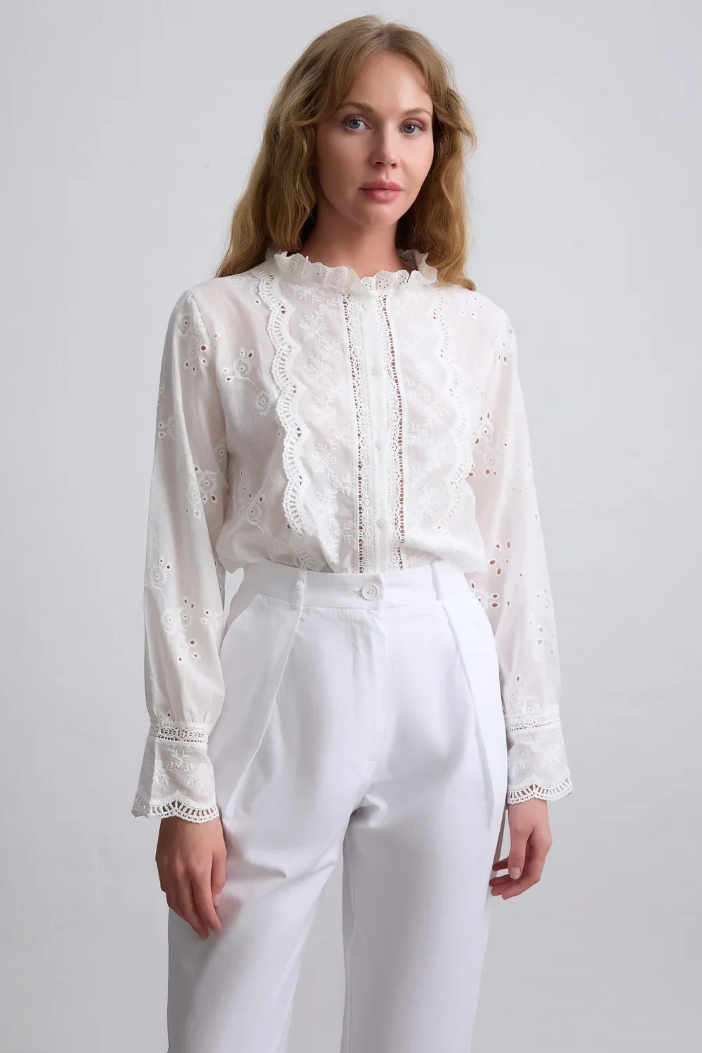 Yaz mevsiminin en romantik dokunuşu... Bu beyaz fisto işlemeli vual gömlek, vintage ruhunu modern kesimle buluşturuyor. Ön kısmındaki dikey dantel şeritler (garni) ve zarif nakış detayları, gömleğe bohem bir hava katarken, nefes alan hafif kumaşı sıcak günlerde ferahlık sağlıyor.