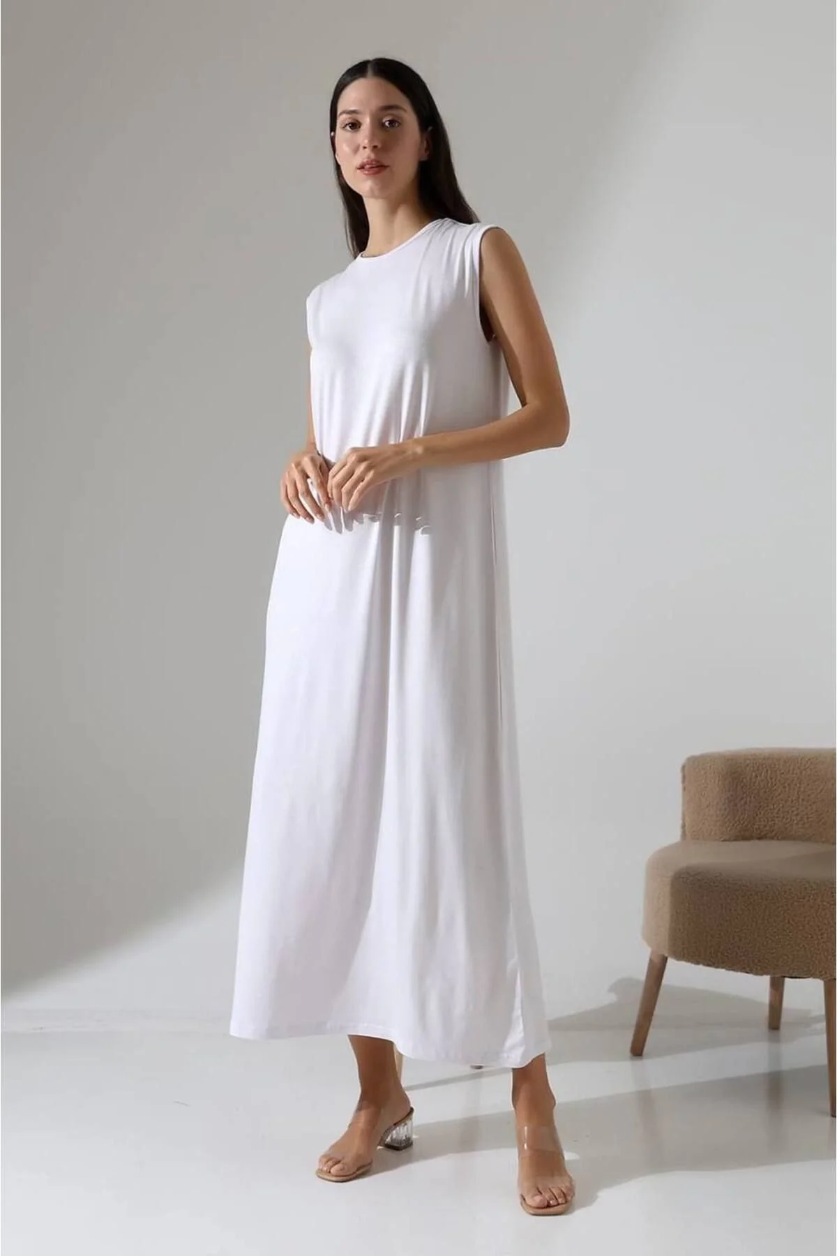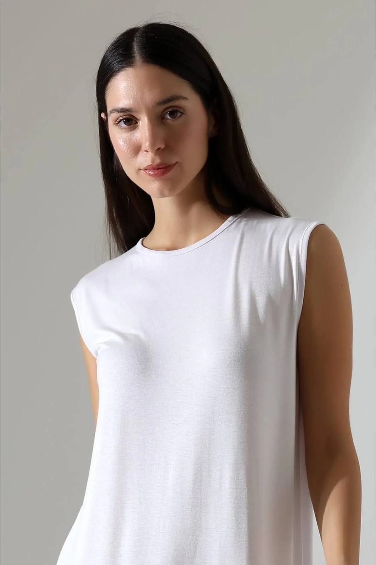 Kadın Beyaz Oversize Sıfır Kol Bisiklet Yaka Basic Günlük Uzun İçlik Tunik Viscon Kumaş