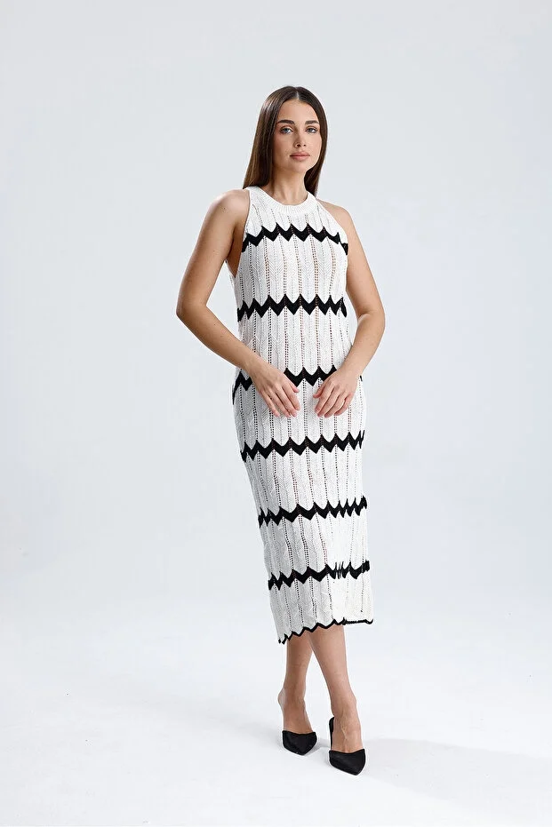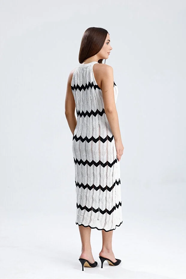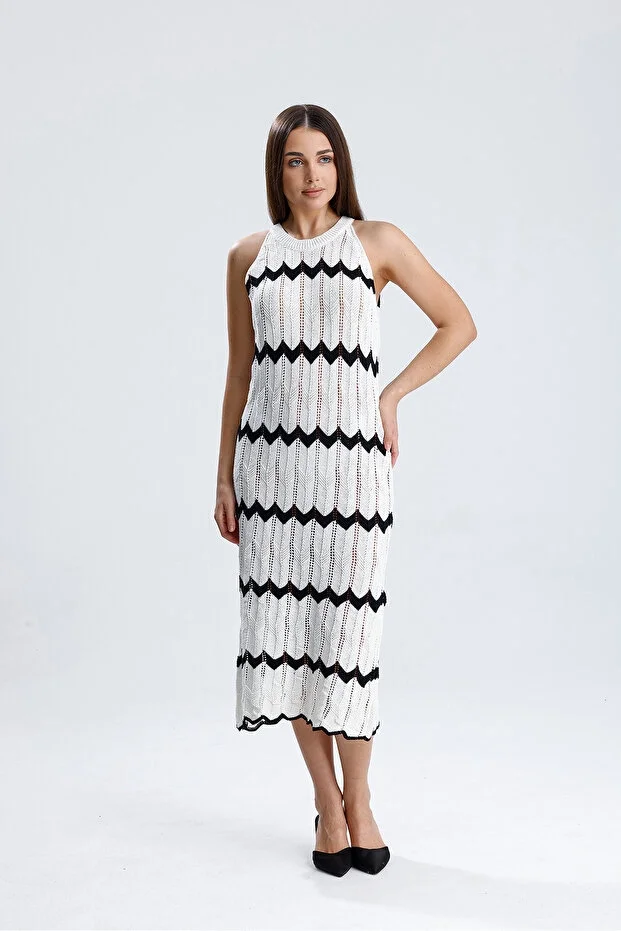 Yaz stilinin en taze hali! Bu beyaz triko elbise, siyah zigzag desenleri ve omuzları açıkta bırakan halter yaka kesimiyle hem sahil şıklığını hem de şehirli modernizmi bir araya getiriyor. Ajurlu örgü yapısı sayesinde hem hafif hem de nefes alan bir kullanım sunan bu parça, gardırobunuzun en "trend" üyesi olmaya aday.