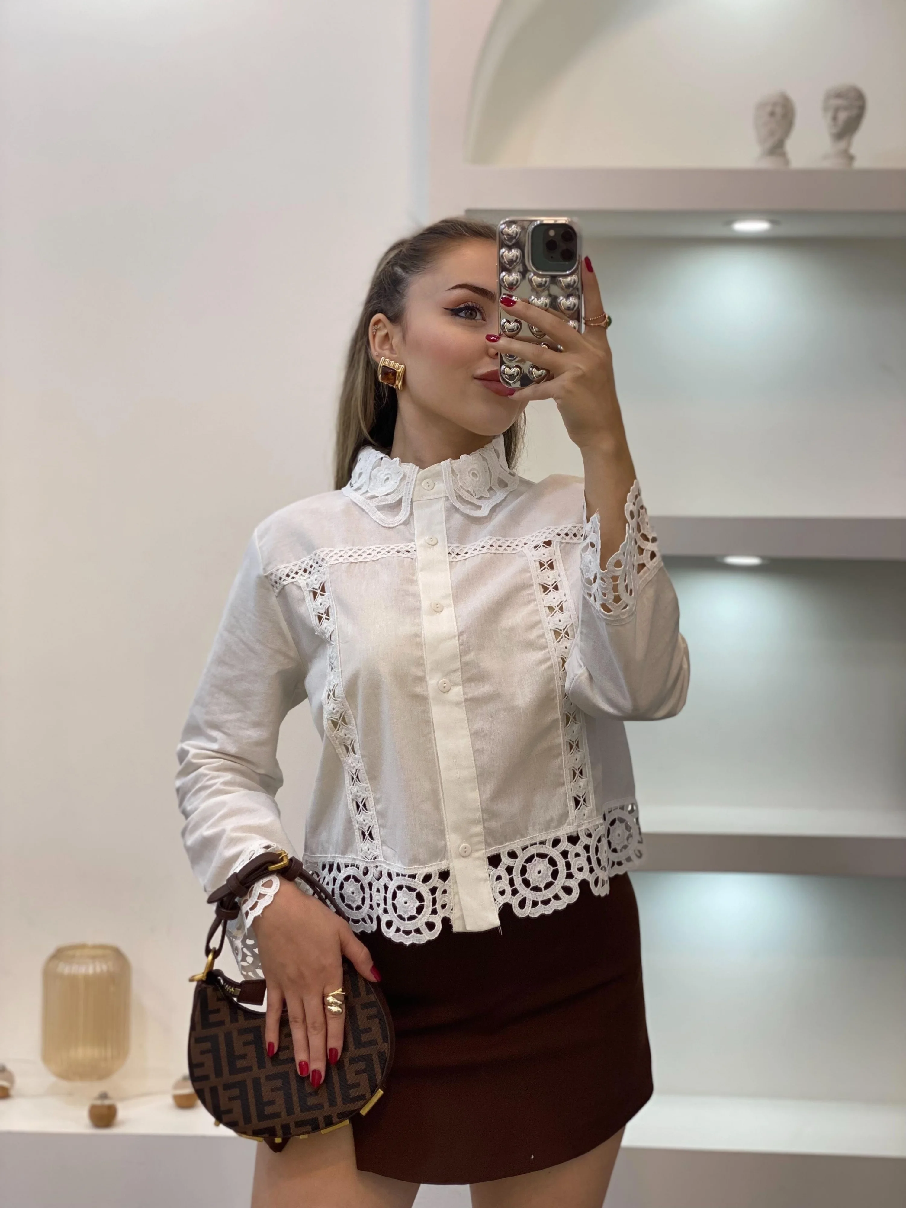 Romantik bir dokunuşla stilinizi yeniden tanımlayın! Bu tasarım motifli beyaz gömlek, geleneksel dantel sanatını modern kesimle buluşturuyor. Pamuklu keten karışımı kumaşıyla cildinize nefes aldırırken, yaka, manşet ve etek ucundaki gipur detaylarıyla benzersiz bir şıklık sunar.