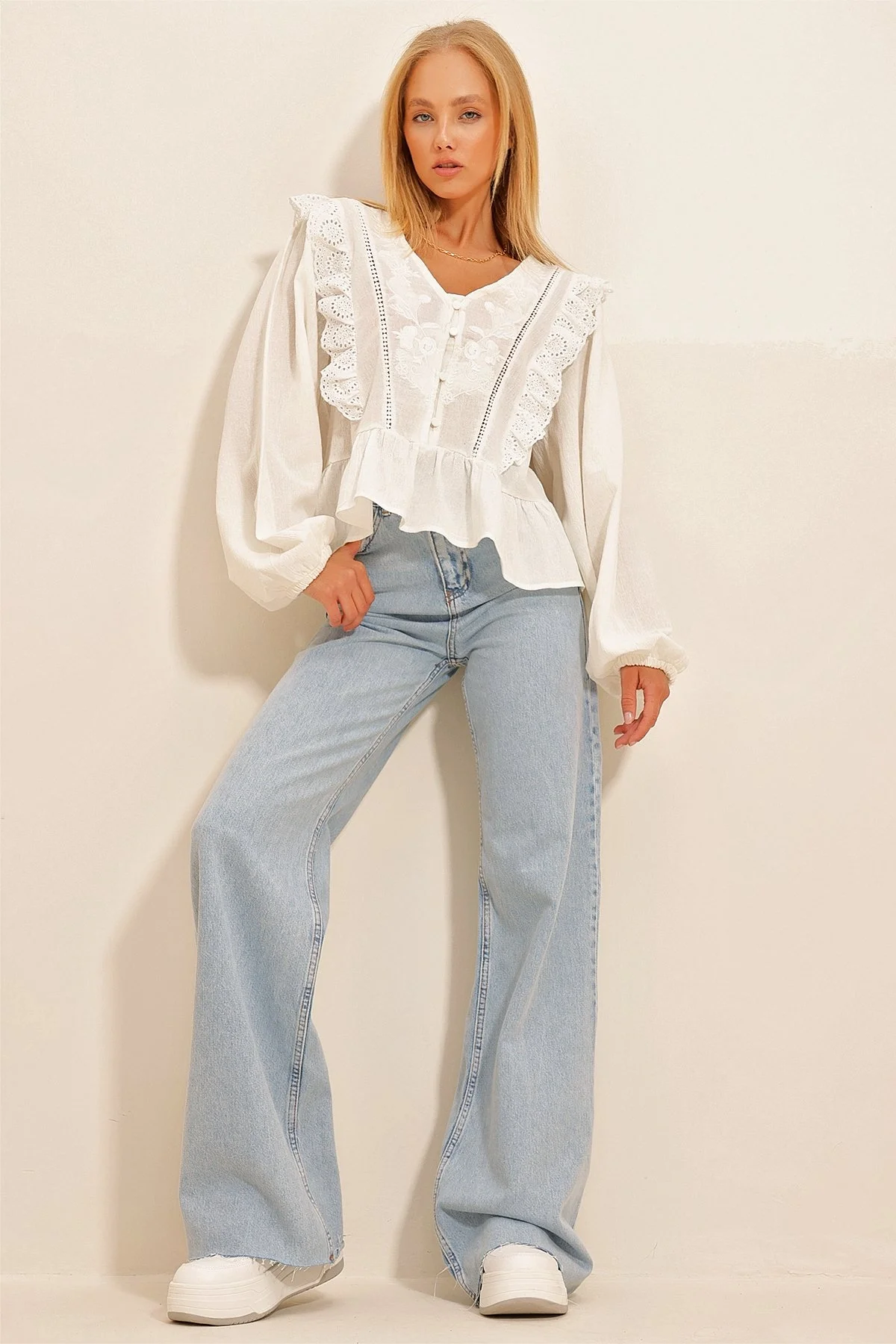 Bu şık beyaz nakışlı bluzu, görseldeki gibi siyah skinny jeanler ve altın rengi takılarla tamamlayarak "casual chic" bir tarz yakalayabilirsiniz. Yaz aylarında keten şortlar veya uçuşan eteklerle kombinleyerek tam bir bohem kraliçeye dönüşebilirsiniz.