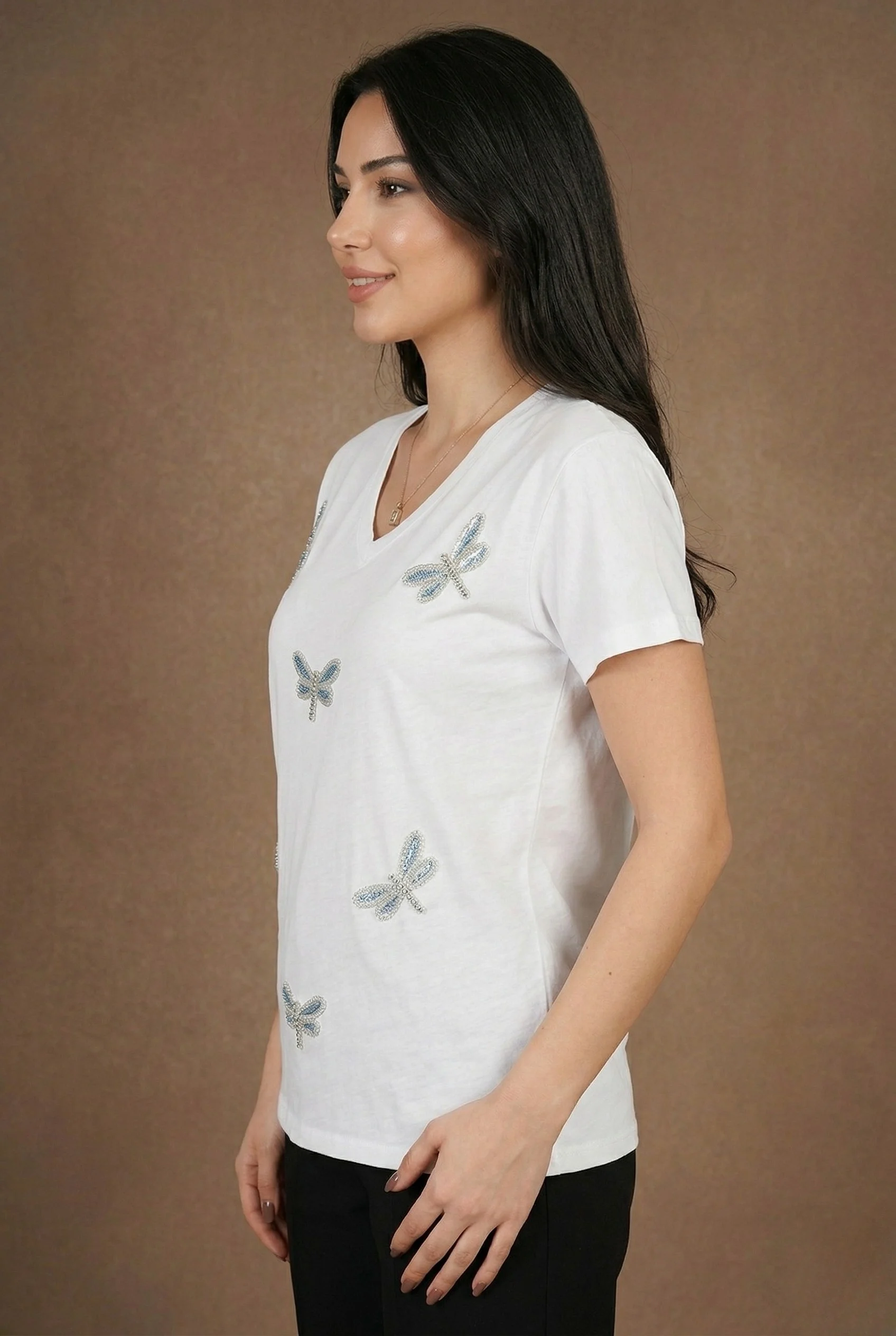 Beyazın ferahlığını parıltılı bir sanatla taçlandırın! Bu beyaz %100 pamuklu tişört, gövde üzerine serpiştirilmiş mavi boncuk işlemeli yusufçuk figürleriyle stilinize masalsı bir dokunuş katıyor. Beyaz zemin üzerindeki ışıltılı detaylar, güneşli günlerde fresh ve şık bir görünüm yakalamak için ideal bir seçim.