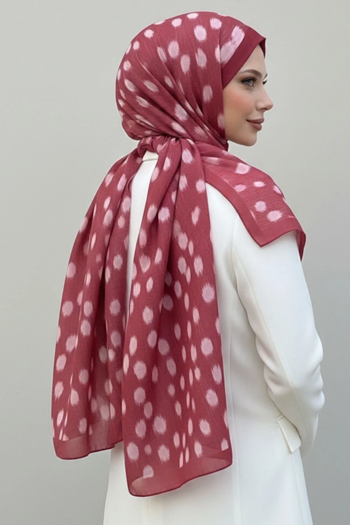 Modern İkat Deseni: Klasik puantiye desenine modern ve sanatsal bir yorum getiren ikat (bulanık) efektli benekler, şalınıza sofistike bir hava katar.