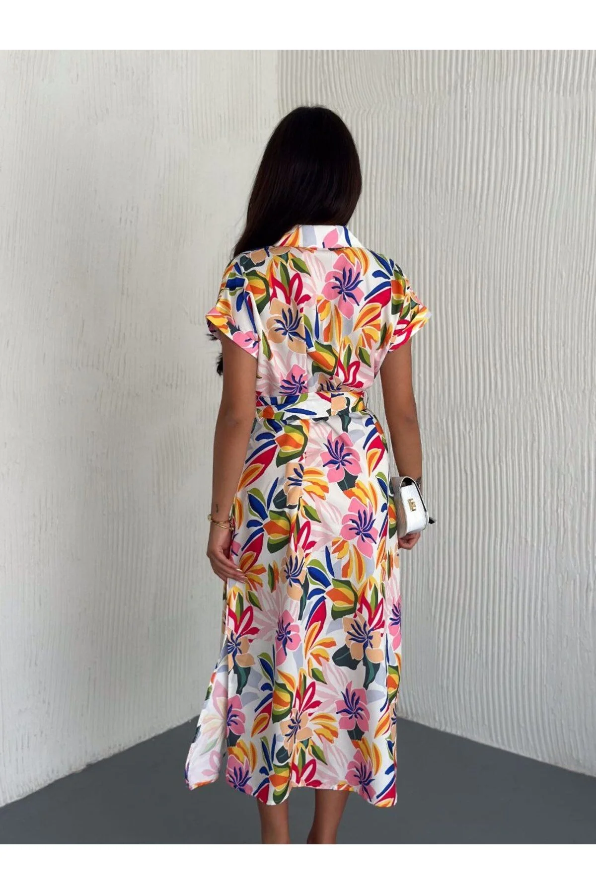 Kadın Gömlek Yaka Beli Kuşaklı Yırtmaçlı Desenli Poplin Midi Elbise - Çok Renkli