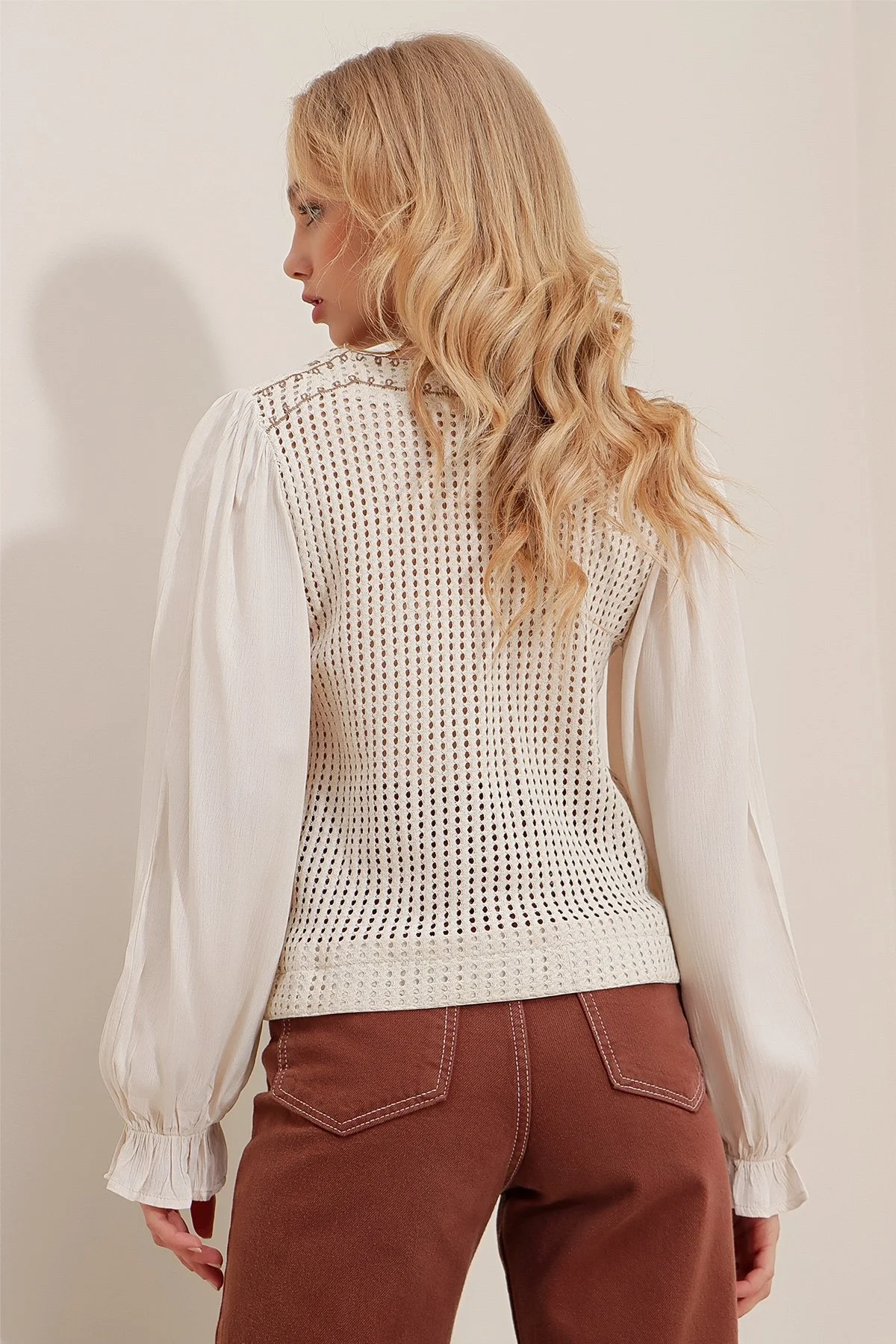 Mixed Media Tasarım: Örgü gövde ve kumaş kolların birleşimi, ürüne hem triko sıcaklığı hem de bluz şıklığı kazandırır.
