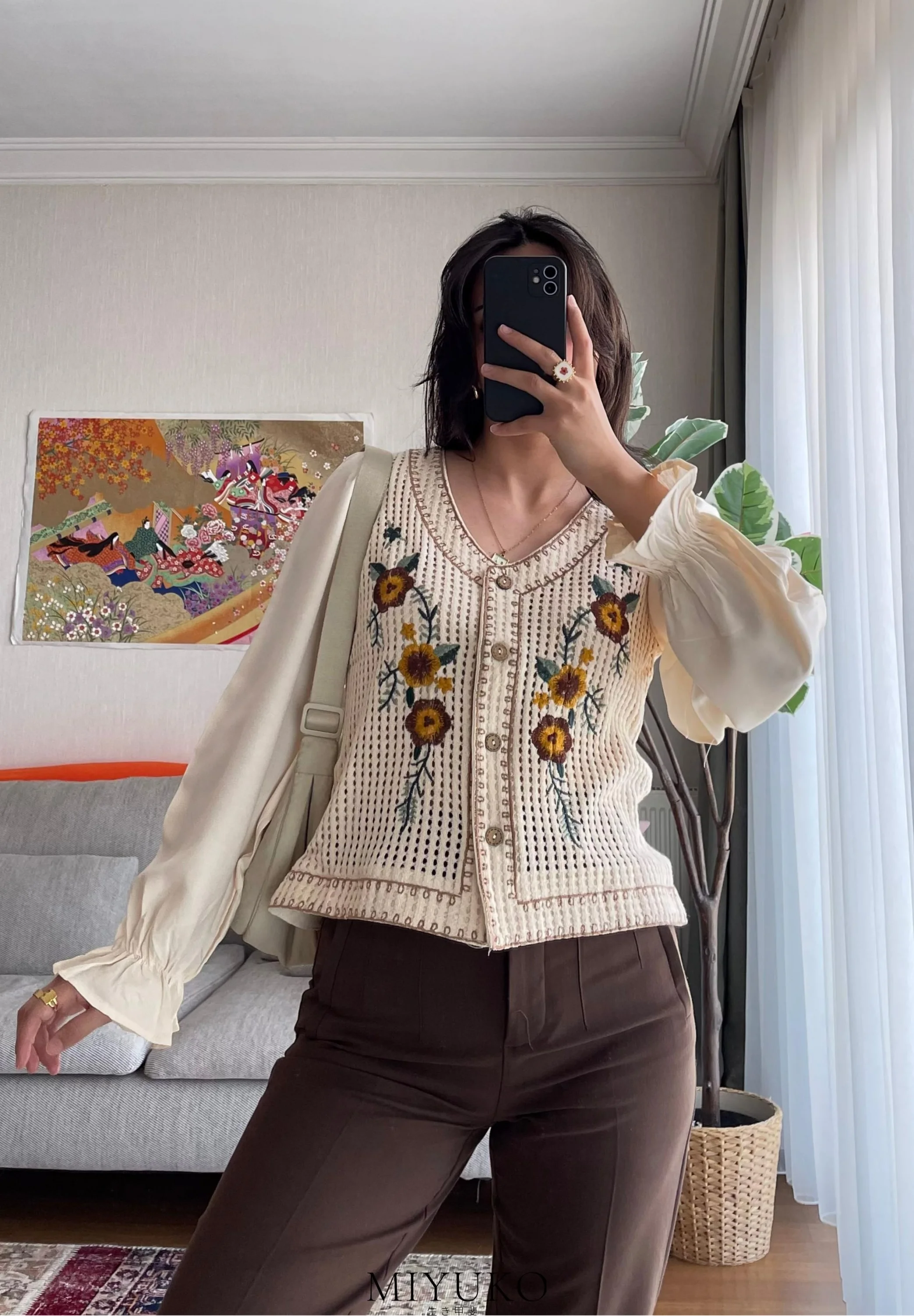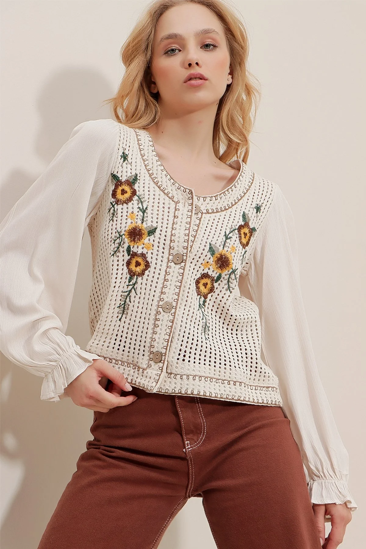 Doğallığın ve zanaatın buluşması... Bu özel tasarım ekru nakışlı bluz, farklı dokuların harmonisiyle göz kamaştırıyor. Gövde kısmındaki ajurlu (delikli) örgü dokusu ve üzerindeki sarı çiçek nakışları, vintage bir bahar havası estirirken; hafif kumaştan üretilen balon kollar tasarıma modern ve romantik bir yumuşaklık katıyor.