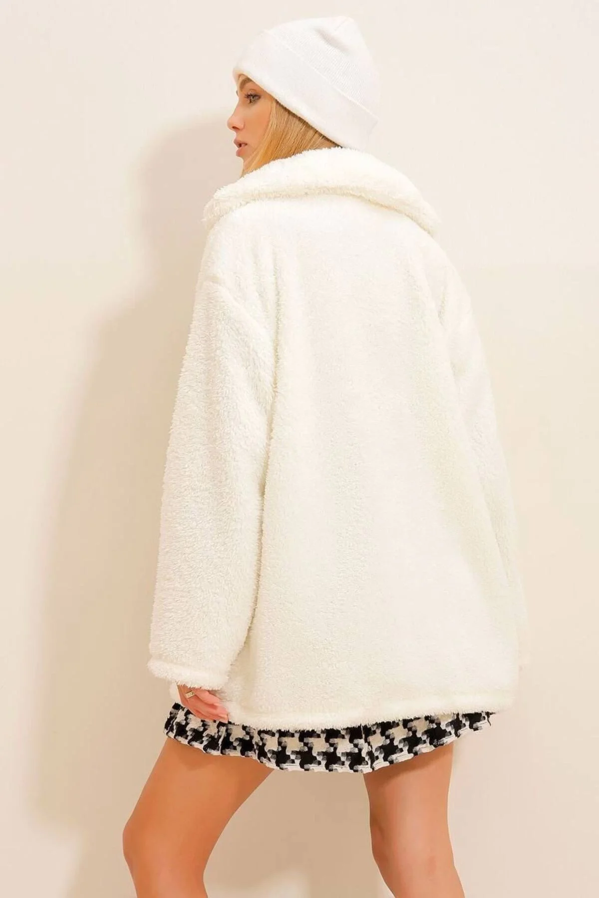 Kadın Ekru Oversize Düğmeli Cepli Kuzu Peluş Mont