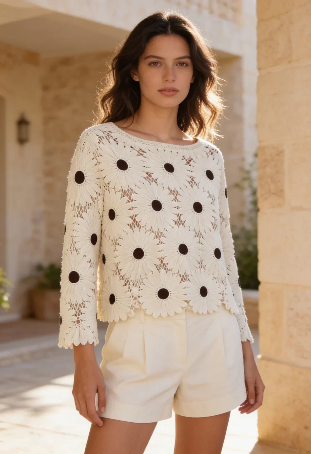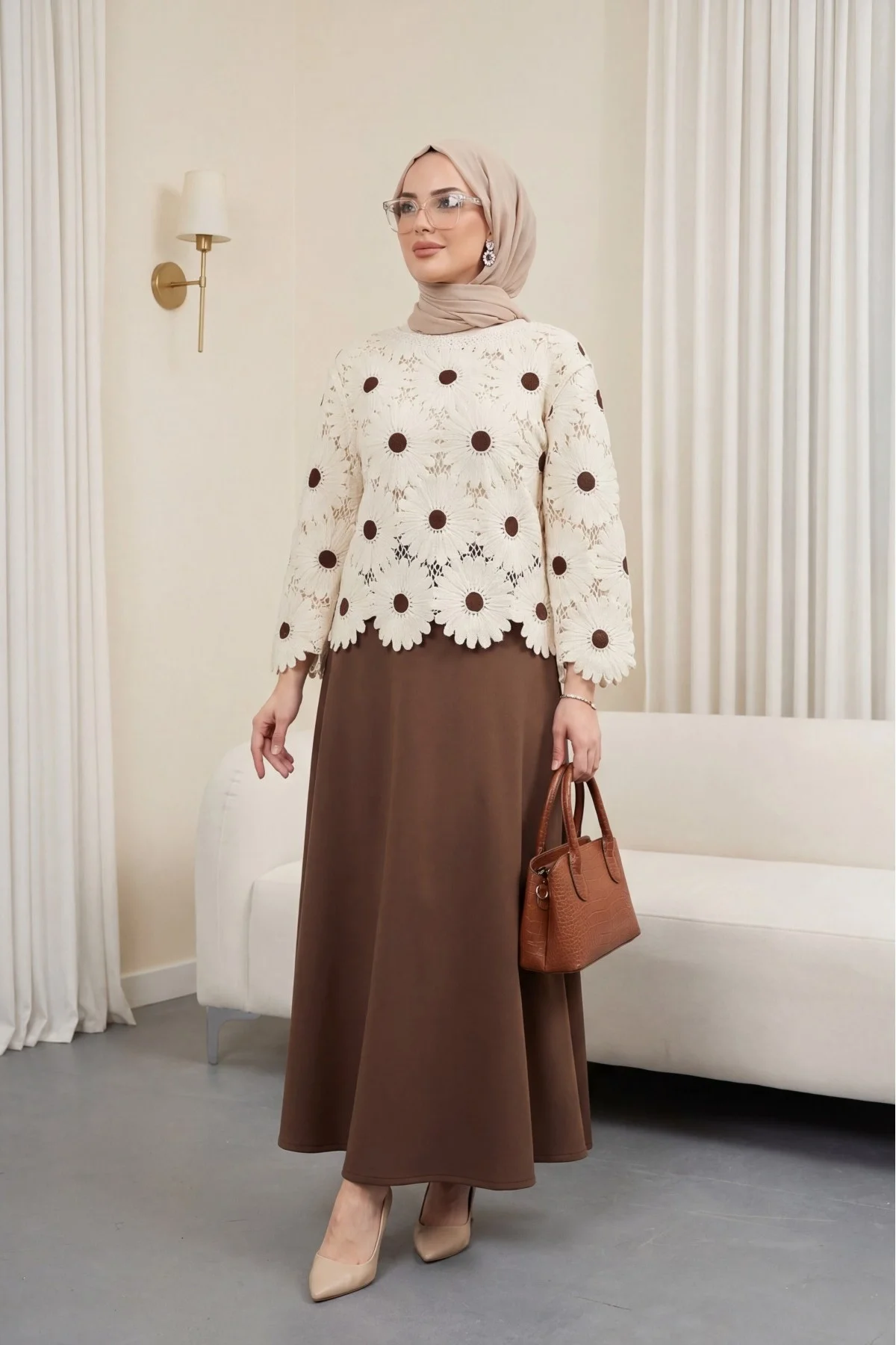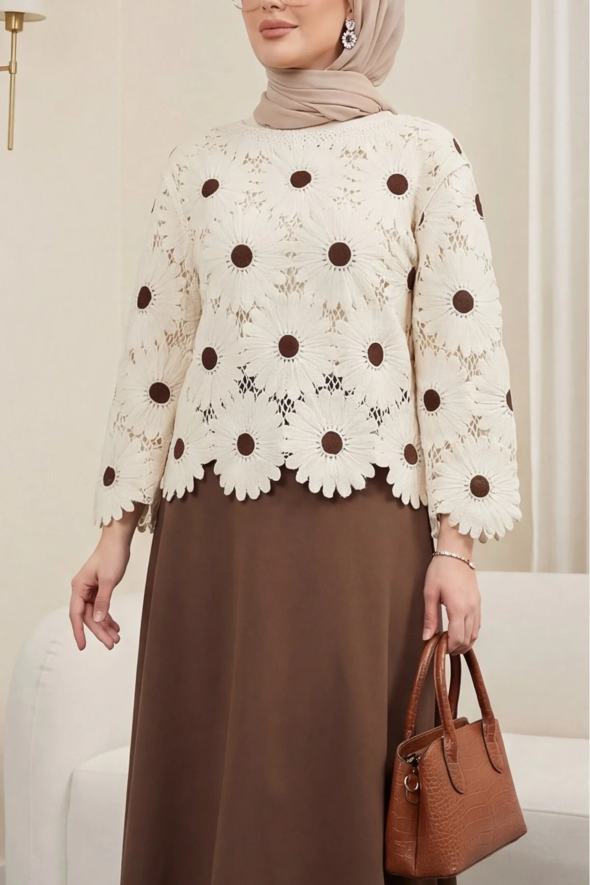 Bu ajurlu papatya bluzu, görseldeki gibi ekru veya krem tonlarında geniş paça bir pantolon ile monokrom bir şıklığa dönüştürebilirsiniz. Toprak tonlarında bir omuz çantası ve gold takılar ile Pinterest estetiğini tamamlayın.