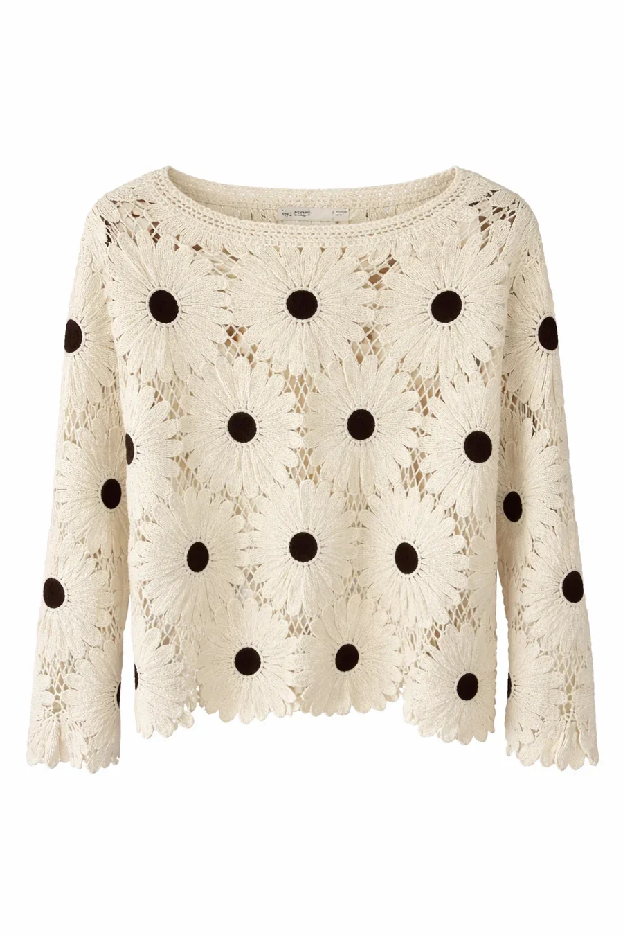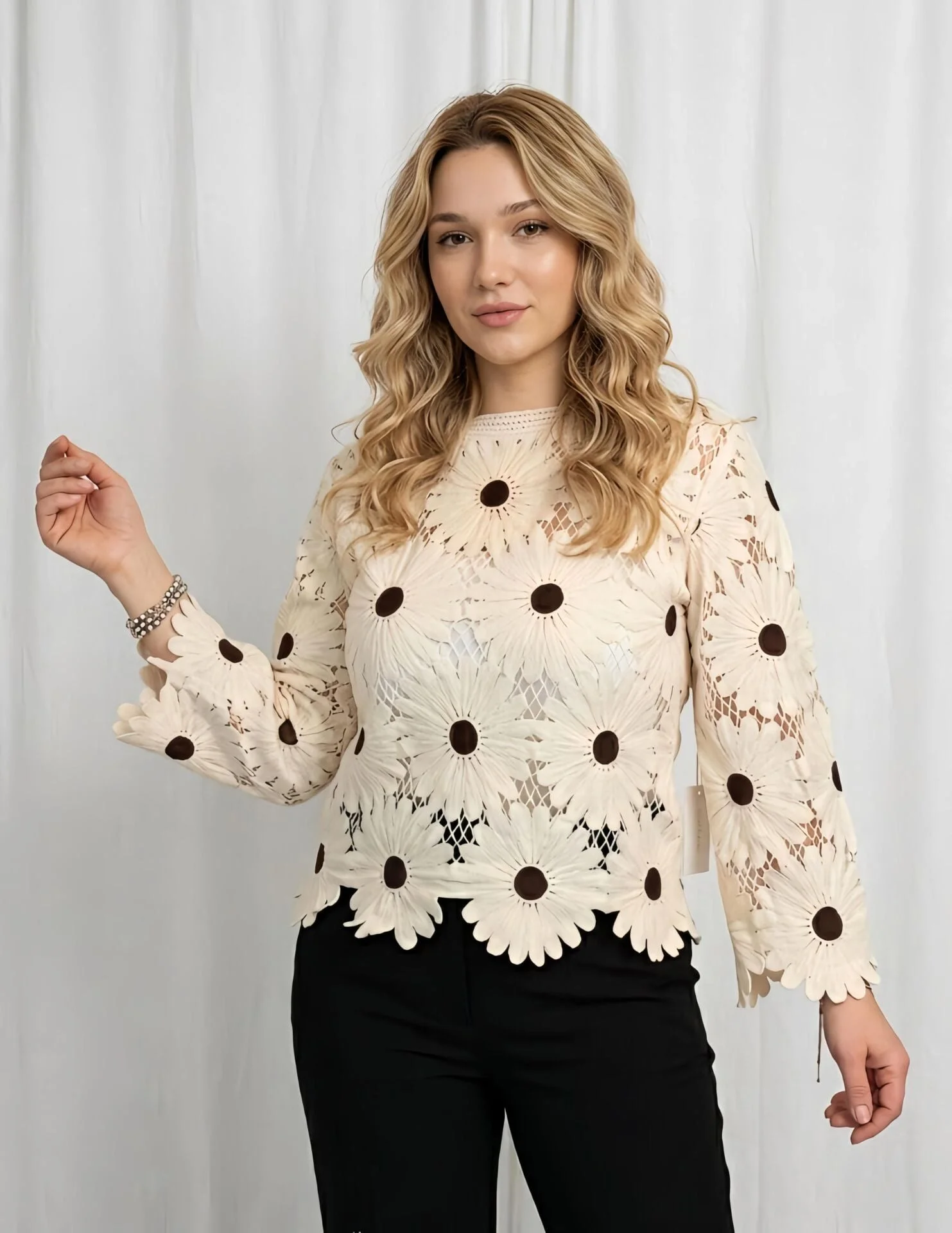 Sanatsal bir dokunuşla tasarlanan bu dev papatya motifli bluz, doku ve desenin kusursuz uyumunu sunuyor. Lazer kesim teknolojisi ile şekillendirilen floral figürler ve ajurlu (file) geçişler, ürüne üç boyutlu ve butik bir görünüm kazandırırken stilinize karakteristik bir hava katıyor.