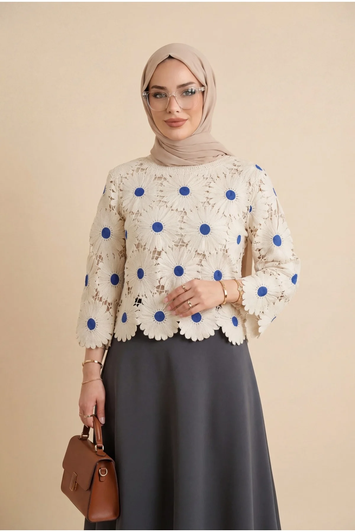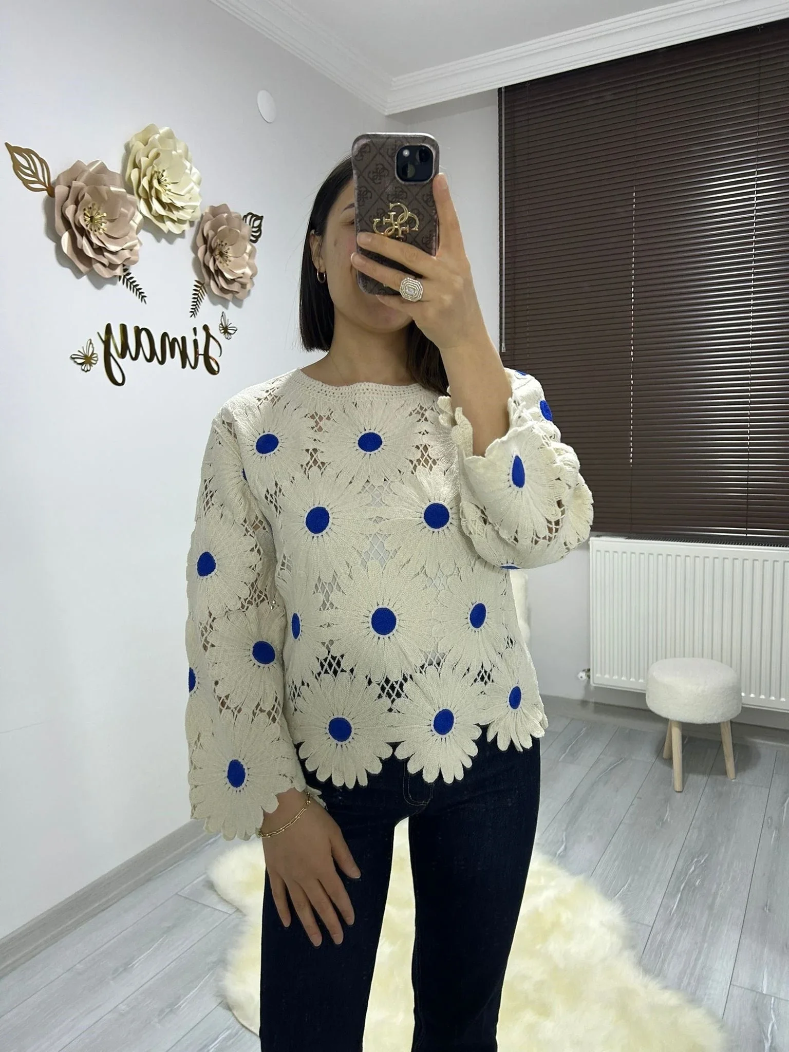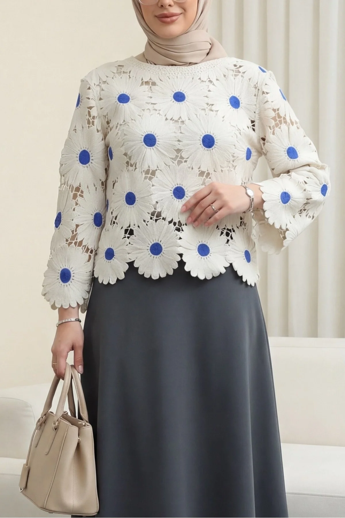Ekru rengin zarafeti, saks mavisinin çarpıcı enerjisiyle birleşiyor! Bu dev papatya nakışlı ajurlu bluz, lazer kesim teknolojisiyle hazırlanan kusursuz floral detayları ve file dokusuyla stilinize yüksek modadan bir dokunuş katar. Butik tasarımı ve üç boyutlu motifleri sayesinde kombinlerinizin yıldız parçası olacak.