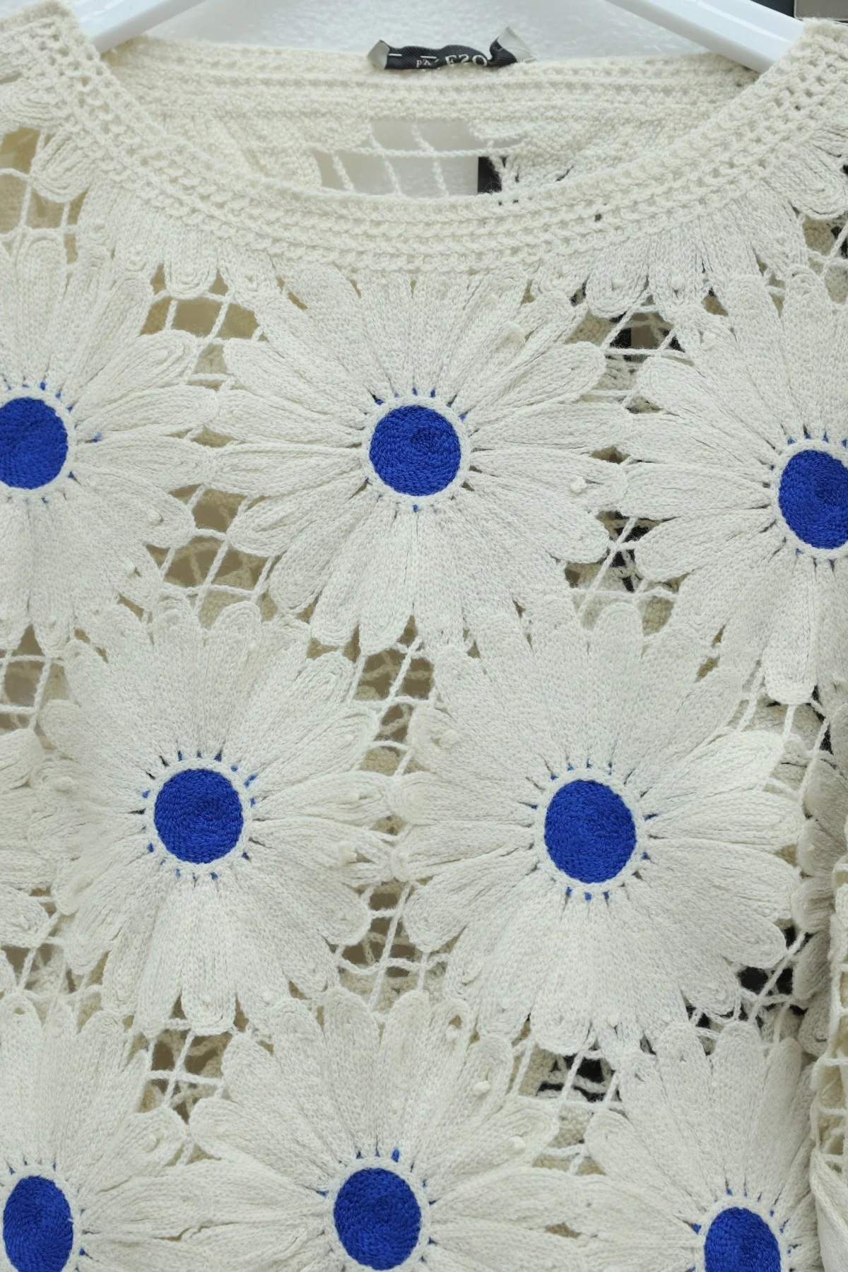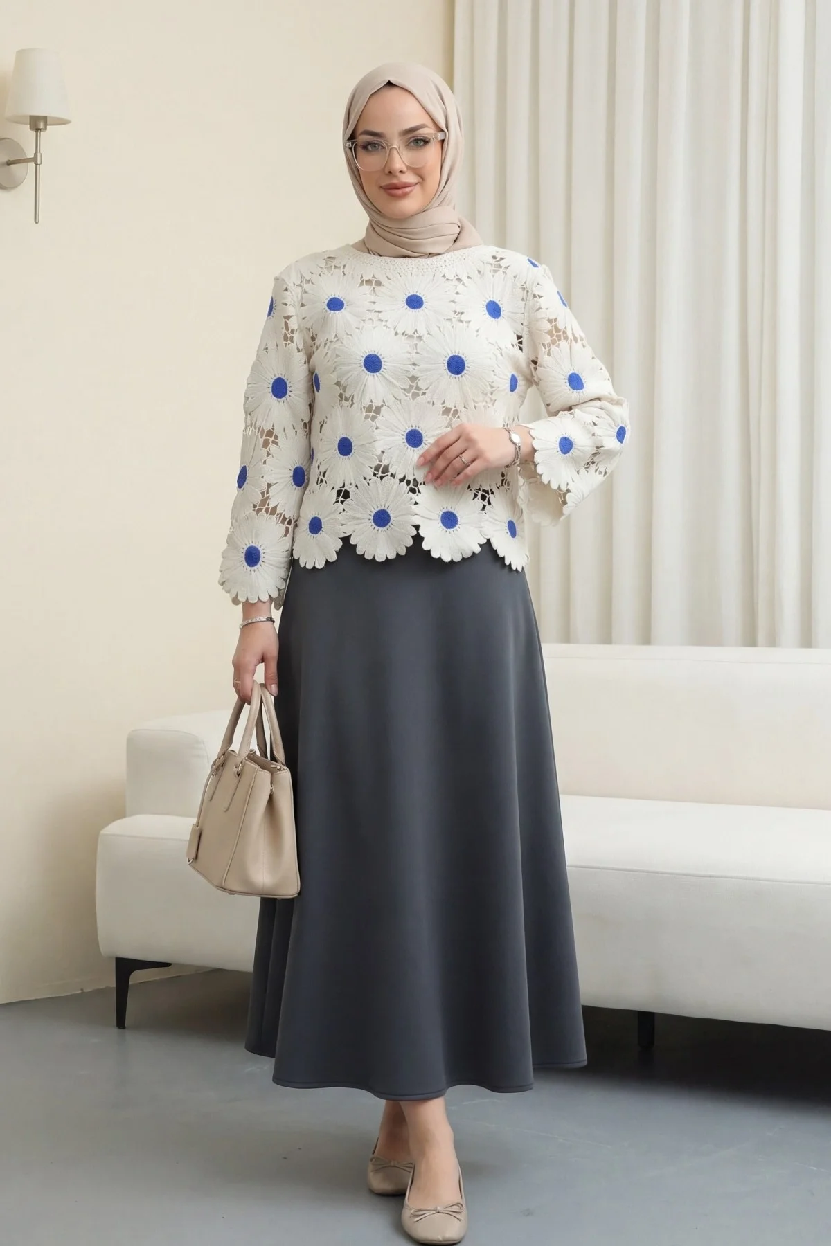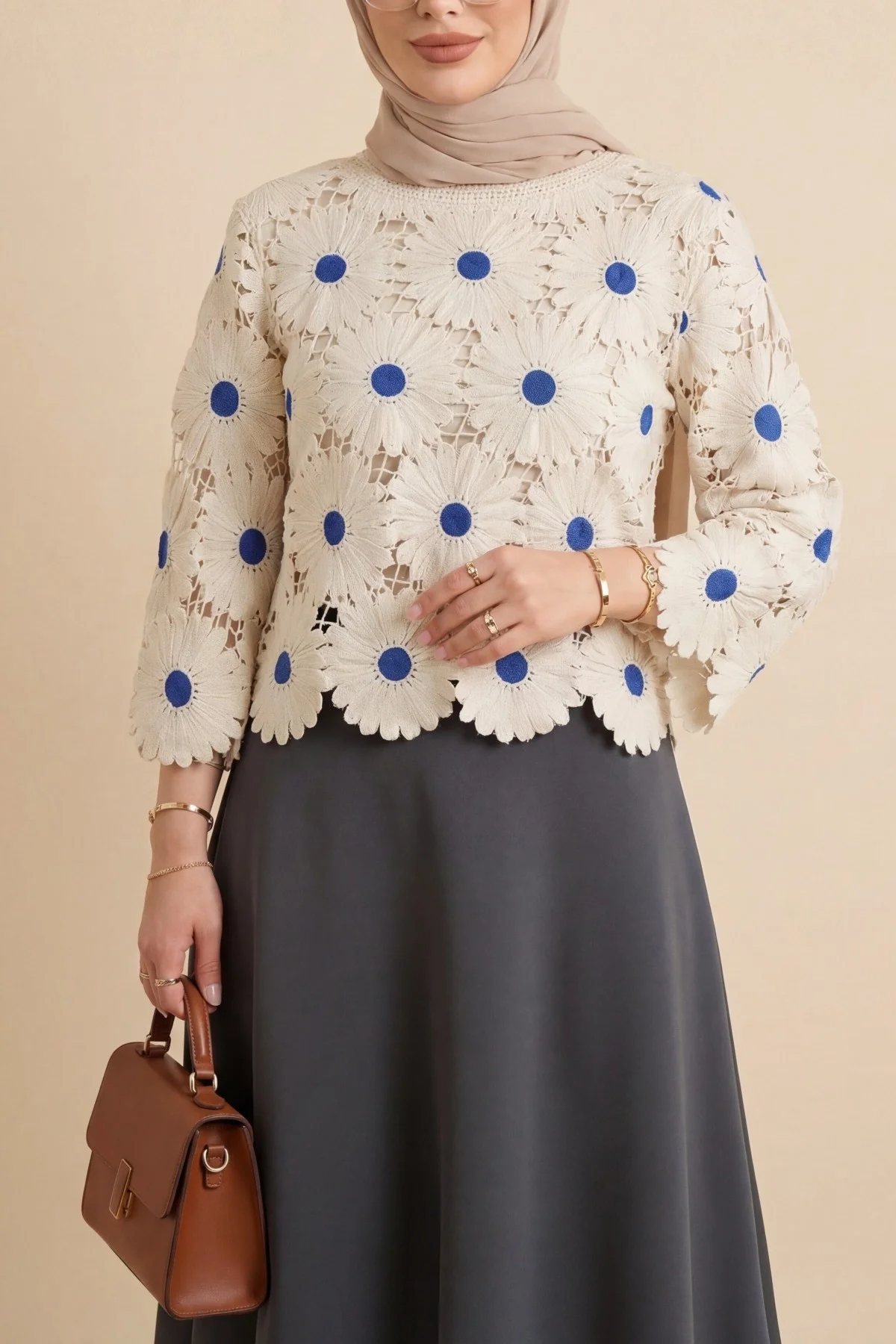 Ekru rengin zarafeti, saks mavisinin çarpıcı enerjisiyle birleşiyor! Bu dev papatya nakışlı ajurlu bluz, lazer kesim teknolojisiyle hazırlanan kusursuz floral detayları ve file dokusuyla stilinize yüksek modadan bir dokunuş katar. Butik tasarımı ve üç boyutlu motifleri sayesinde kombinlerinizin yıldız parçası olacak.