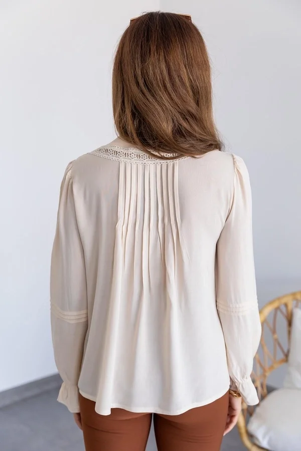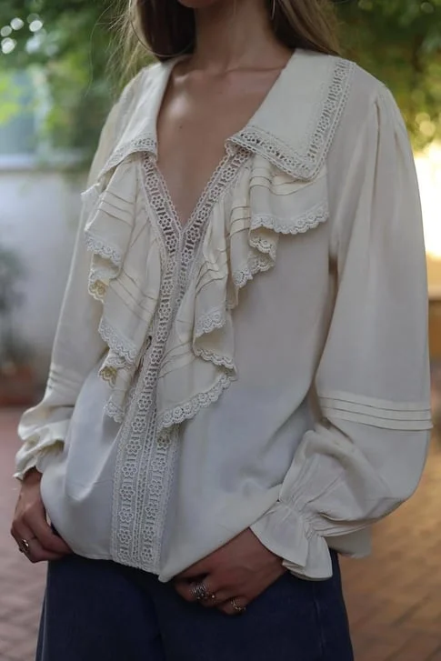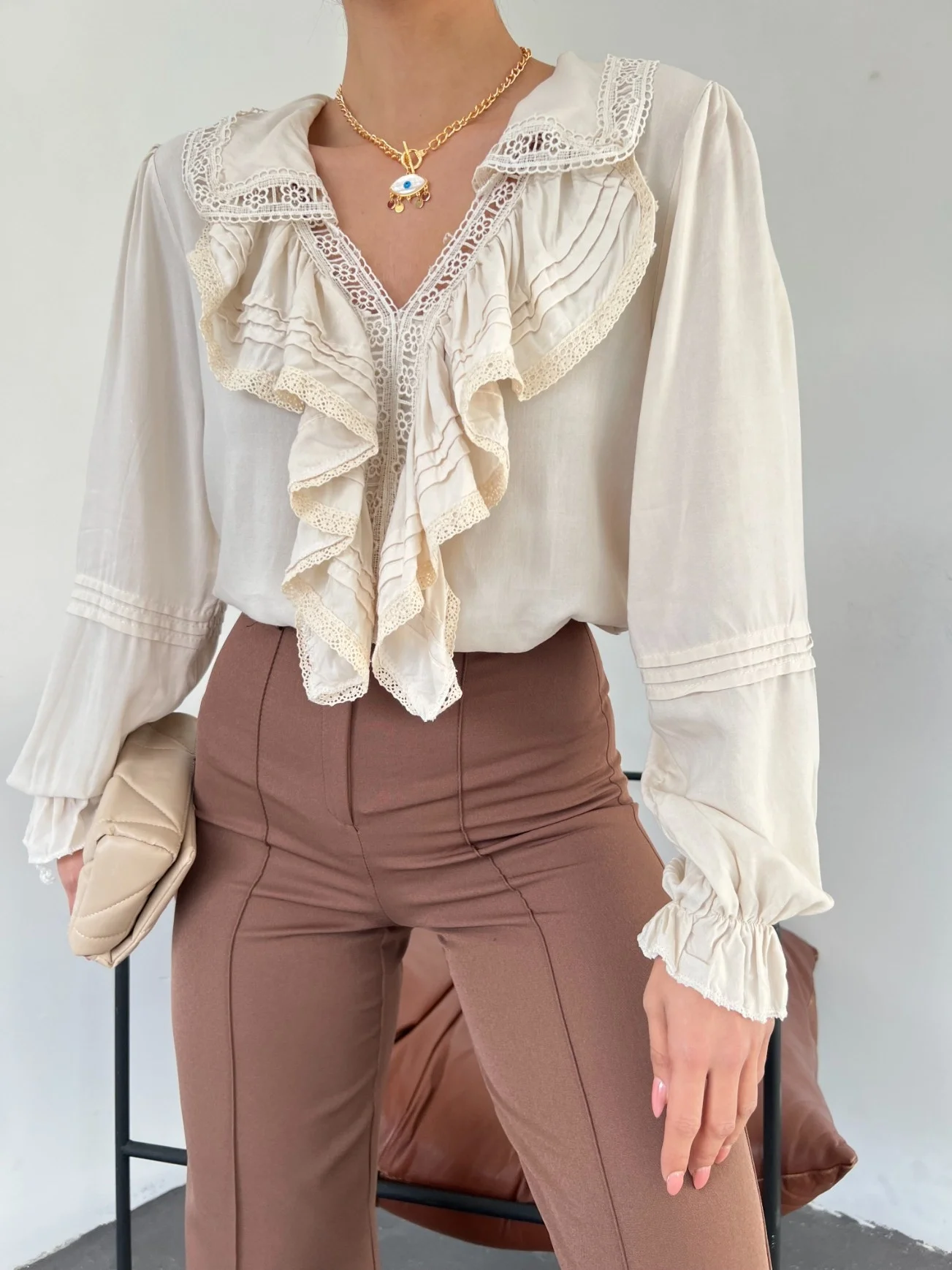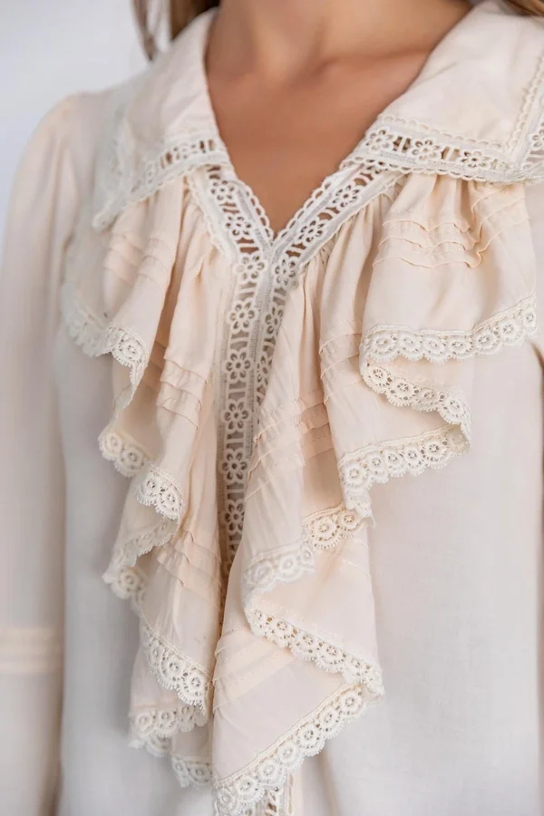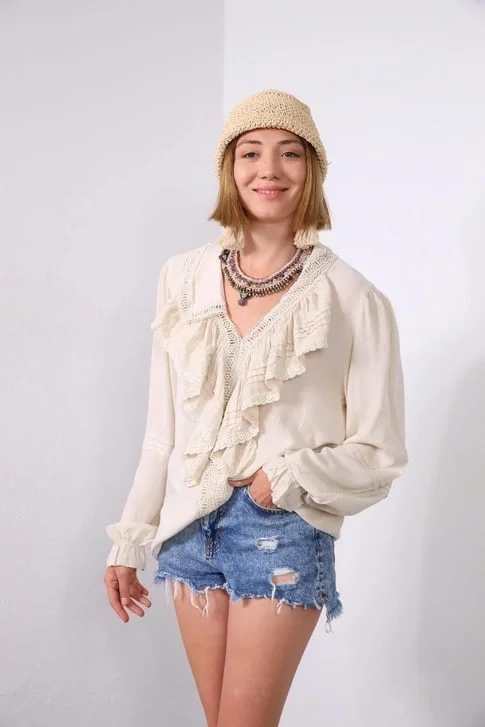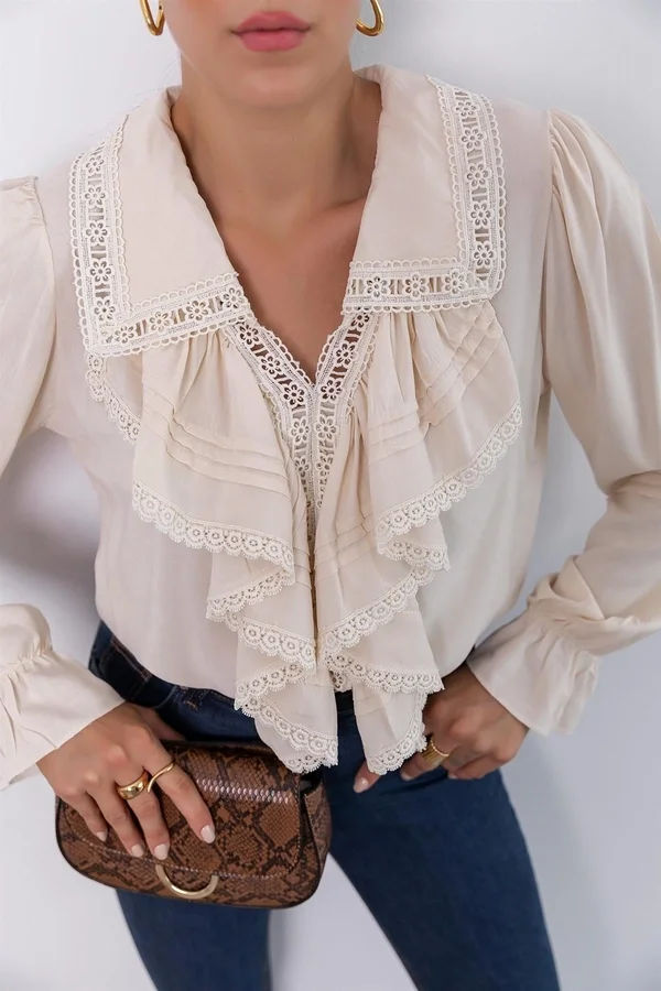 Geçmişin zarafeti bugünün stiliyle buluştu... Bu ekru fırfırlı ve dantelli bluz, Viktoryen döneminden ilham alan romantik detaylarıyla göz kamaştırıyor. Yakasından göğüs hizasına kadar inen pileli volanlar ve aralara serpiştirilmiş zarif dantel (güpür) şeritler, kombininize sofistike ve artistik bir hava katıyor.