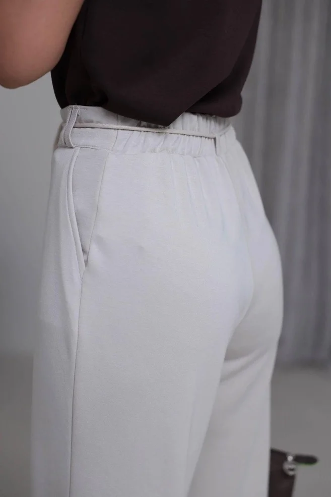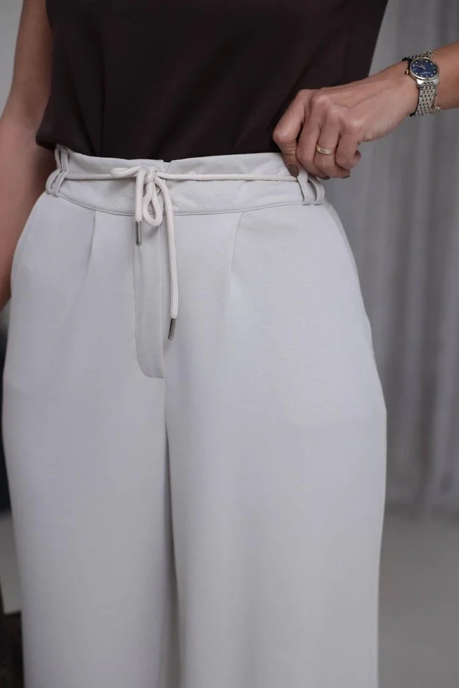 Konforun en lüks hali... Bu ekru modal kumaş pantolon, ipeksi dokunuşu ve muhteşem dökümüyle üzerinizden çıkarmak istemeyeceğiniz bir parça. Kayın ağacı liflerinden elde edilen doğal modal kumaşı, cildinizin nefes almasını sağlarken, yüksek belli ve bol paça kesimiyle size sınırsız bir hareket özgürlüğü sunar.
