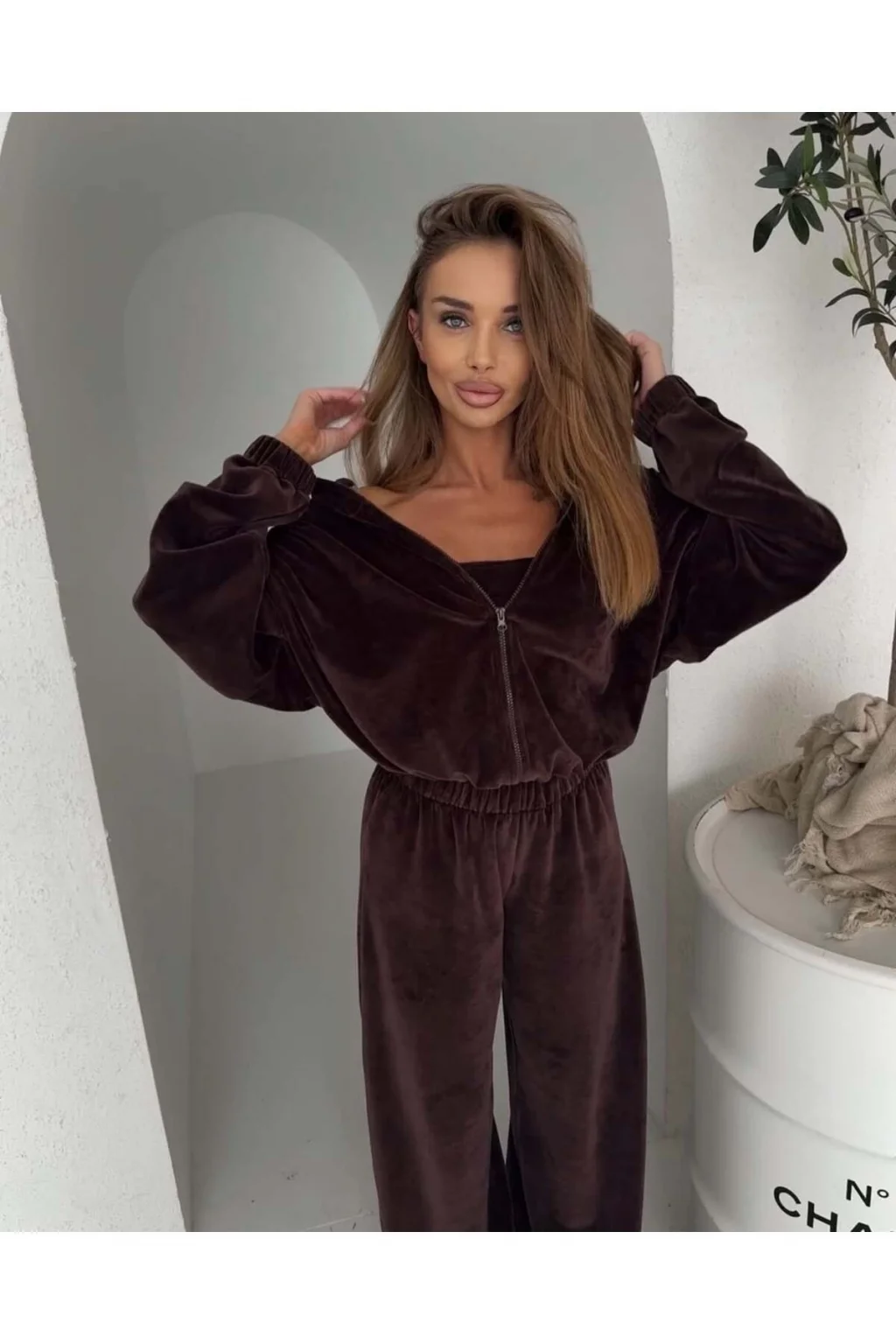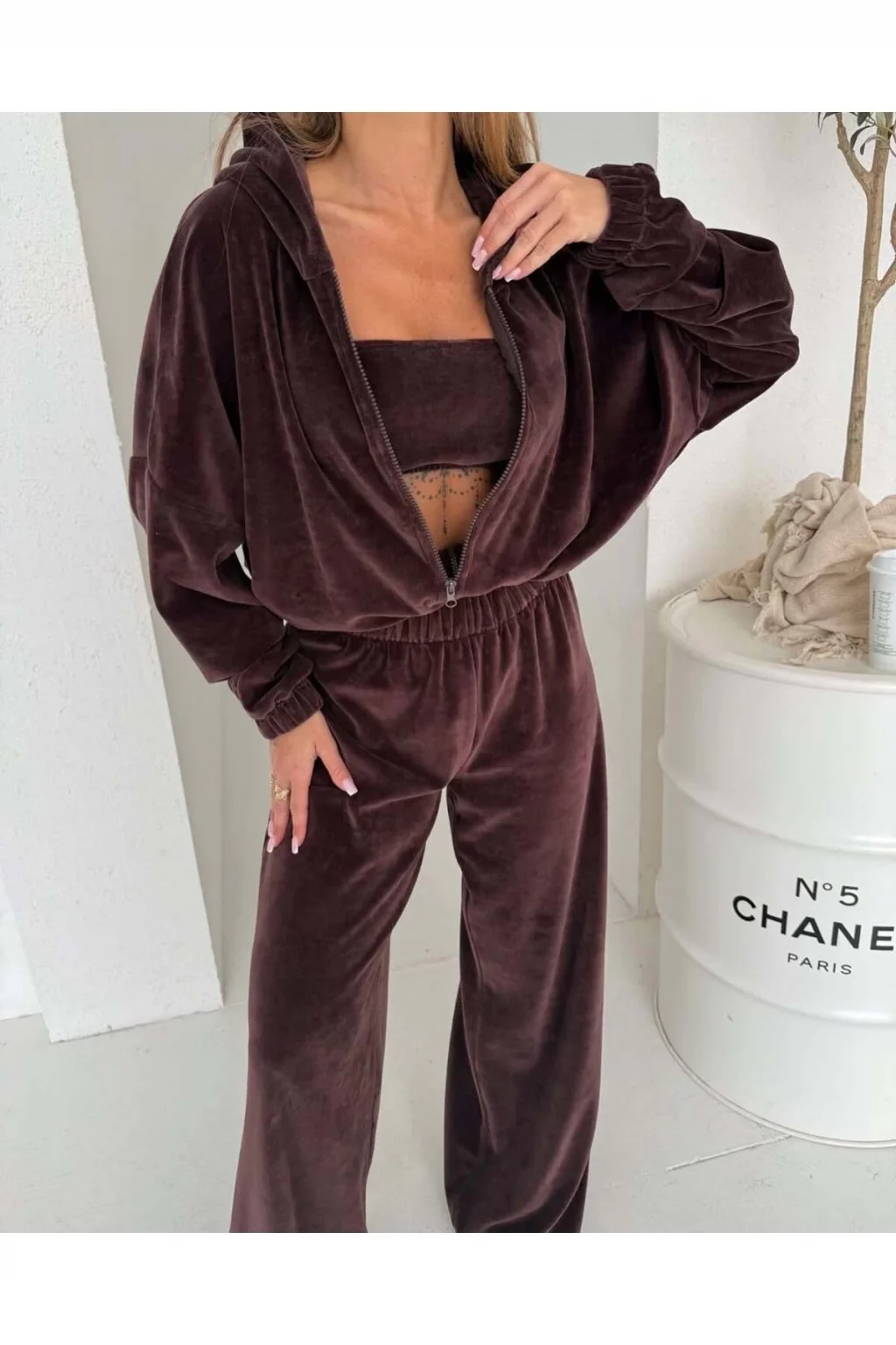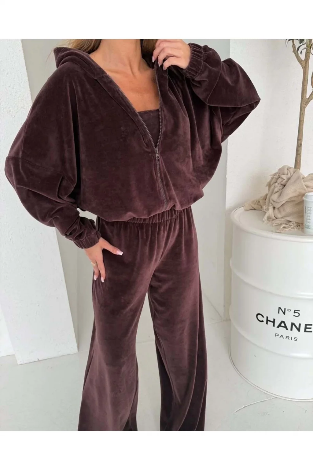 Lounge giyimin en şık hali olan bu kahverengi 3'lü kadife takım, stilinizi zahmetsizce bir üst seviyeye taşıyacak. Sneaker'larınızla tamamlayarak günlük ve havalı bir görünüm elde edebilir, evde ise lüks bir konforun tadını çıkarabilirsiniz. Straplez iç büstiyeri, ceketin içinden görünerek takıma iddialı bir hava katar.