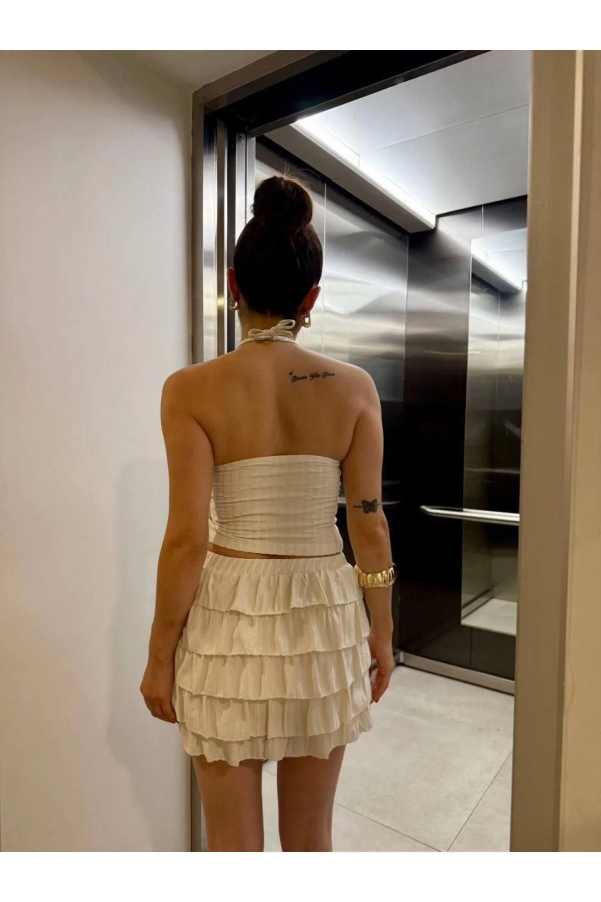 Üst parça sırtı tamamen açık ve bağlamalı model Kat kat fırfır detayı ile dikkat çeker Alt parça yüksek bel ve mini boy Hem şık davetlerde hem günlük kombinlerde tercih edilebilir Takım olarak satılmaktadır, ayrı ayrı da kullanılabilir Ürün astarsızdır, iç göstermeyen yapıya sahiptir Yaz sezonuna özel hafif ve dökümlü kumaş