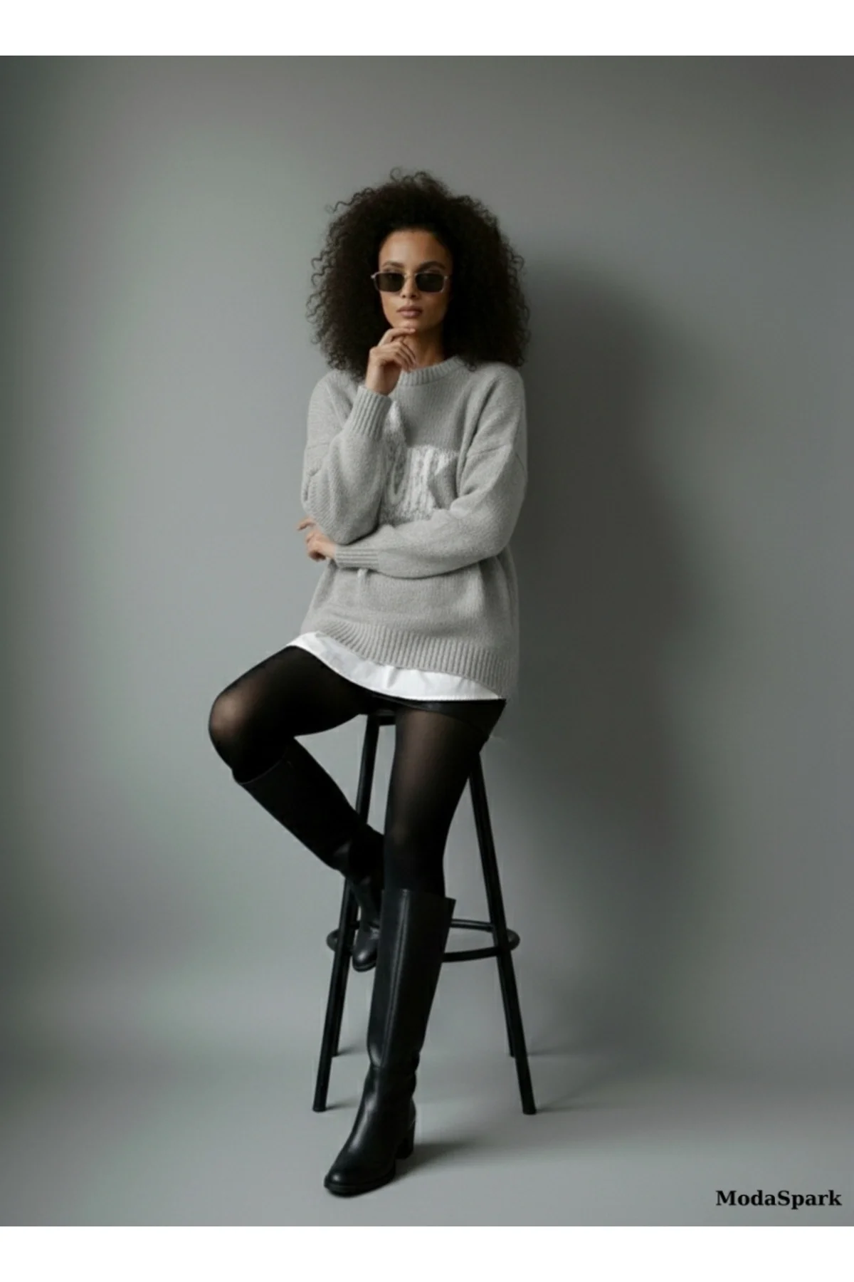 Bu sırtı yazılı gri kazağı, siyah deri mini etek ve siyah opak çorapla tamamlayarak stil sahibi bir kolej görünümü yakalayabilirsiniz. Daha spor bir tarz için biker taytlar veya yırtık jeanlerle kombinleyebilir, postallarla grunge etkinizi artırabilirsiniz.