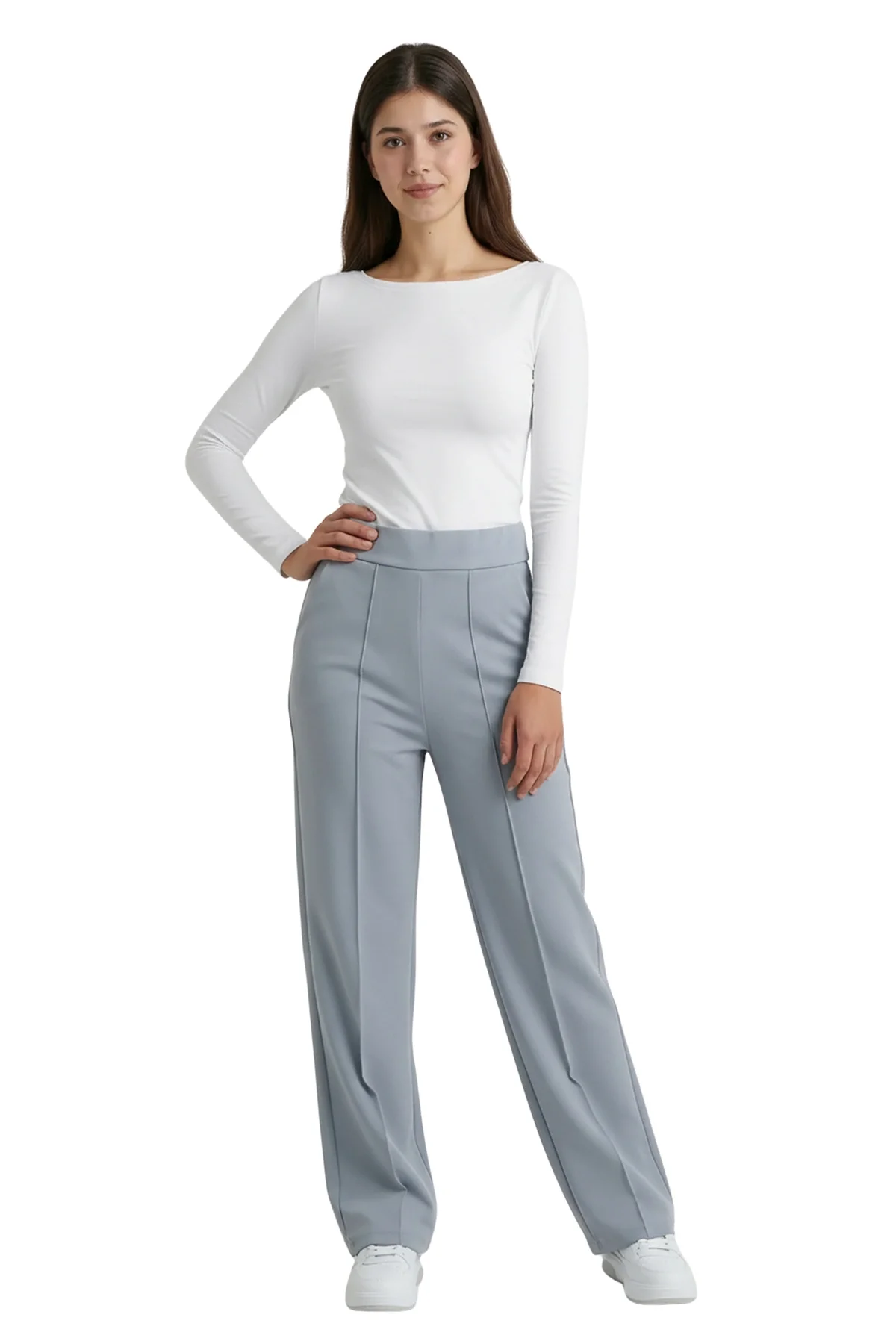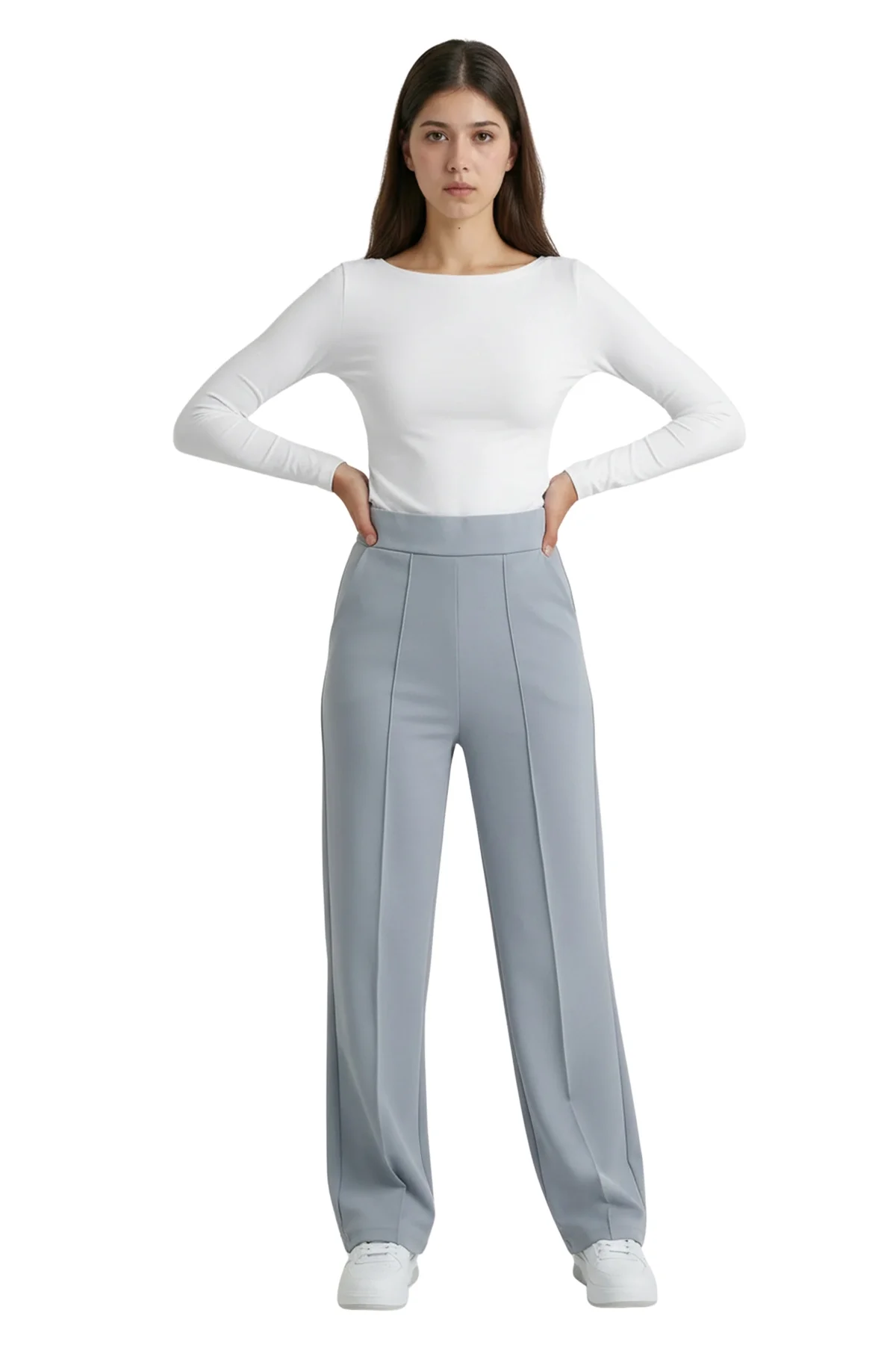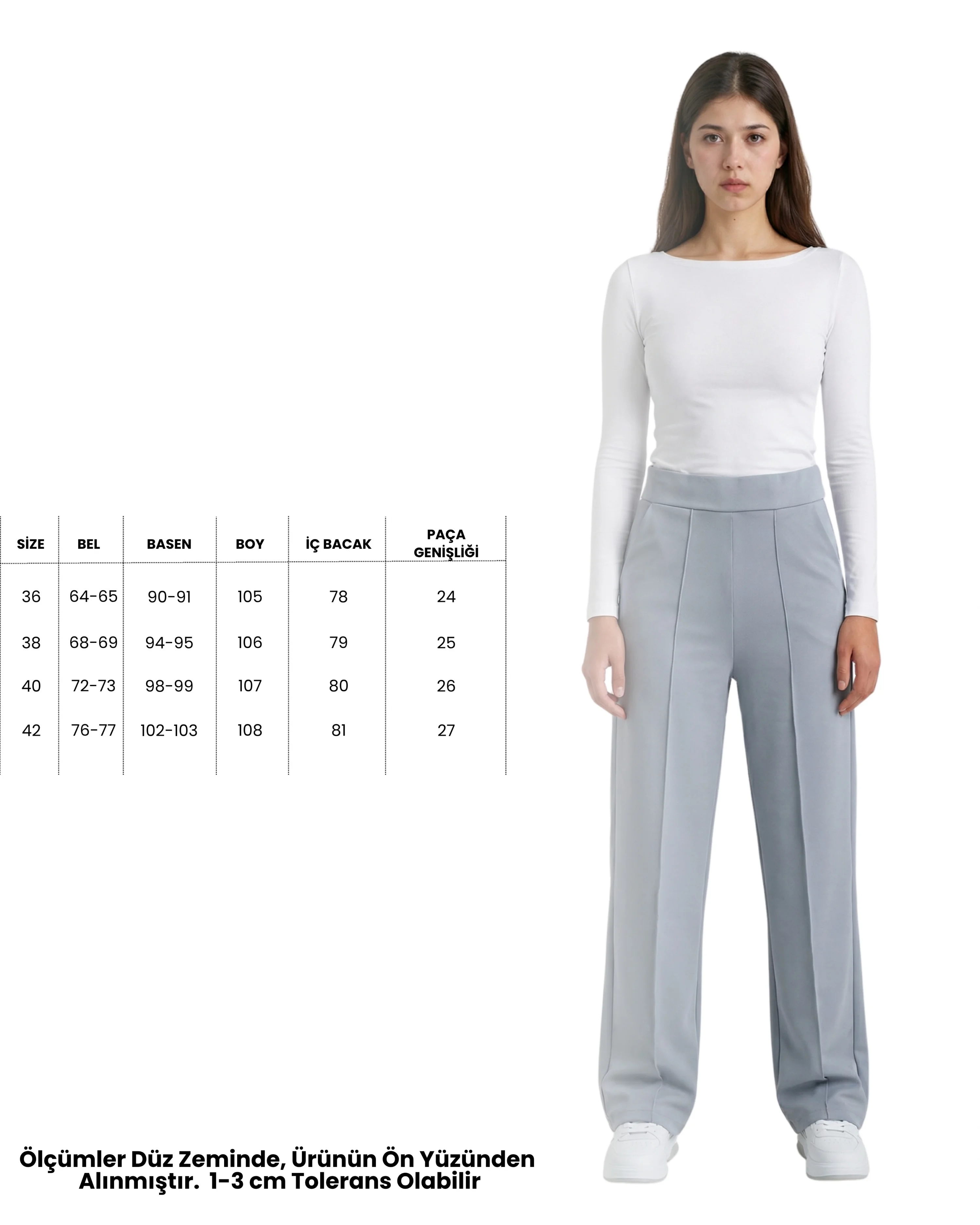 Modern ve sofistike bir stilin en güçlü parçası! Bu gri yüksek bel pantolon, dökümlü premium krep kumaşı ve bacak boyunu uzatan çimalı (dikişli iz) detayıyla hem profesyonel hem de şık bir duruş sergiliyor. Grinin her renkle uyum sağlayan nötr gücü, krep kumaşın kırışmayan esnek yapısıyla birleşerek günün her anında konforlu bir şıklık sunuyor.
