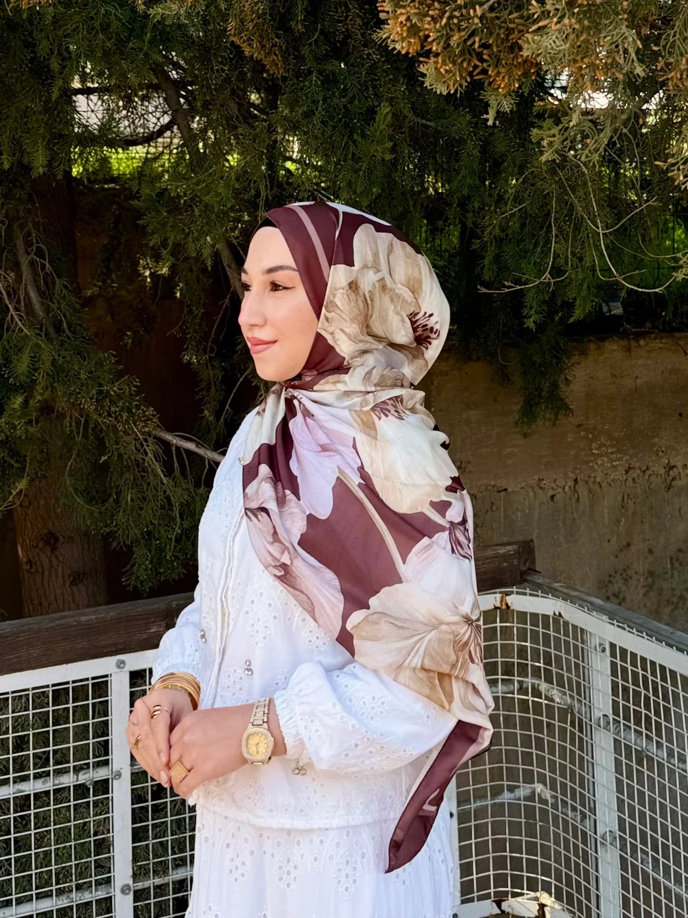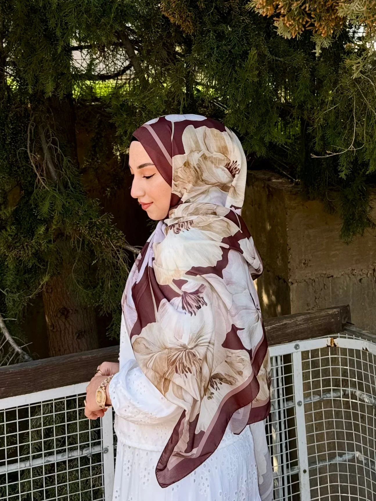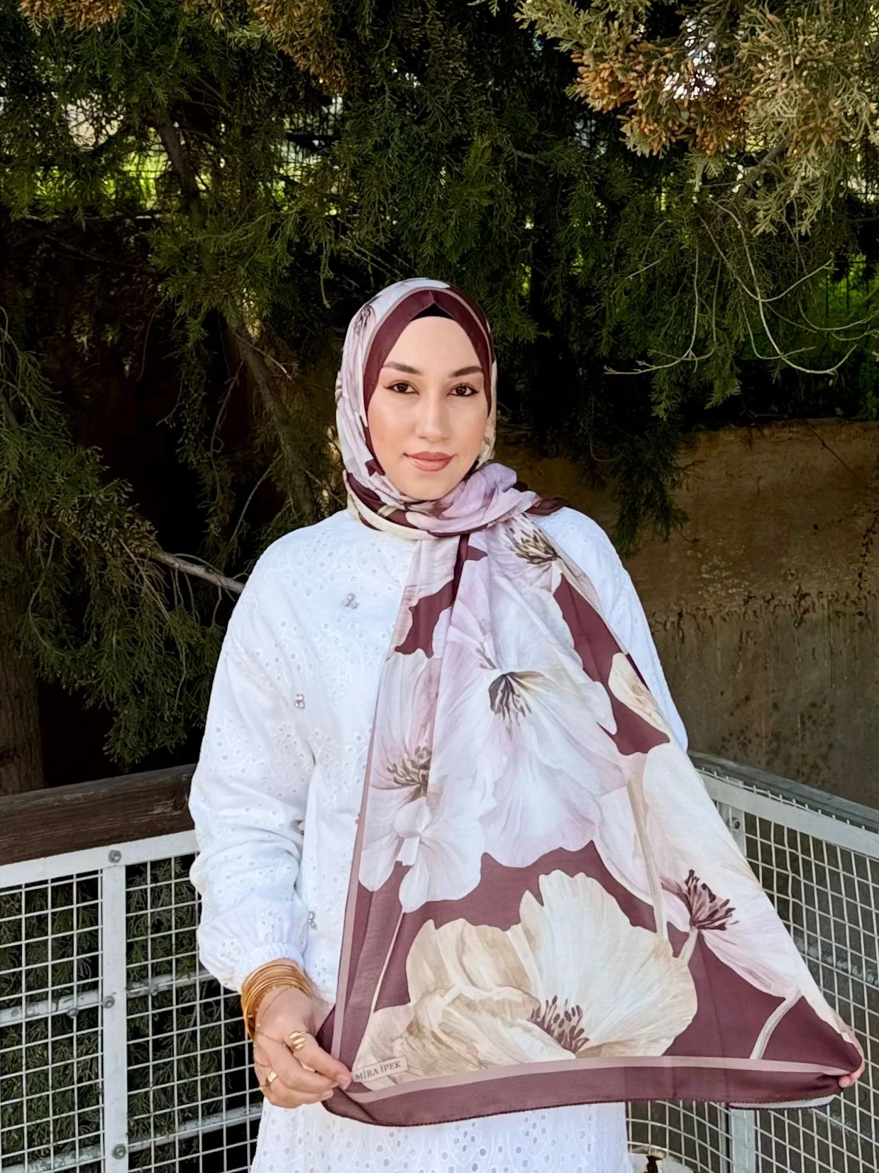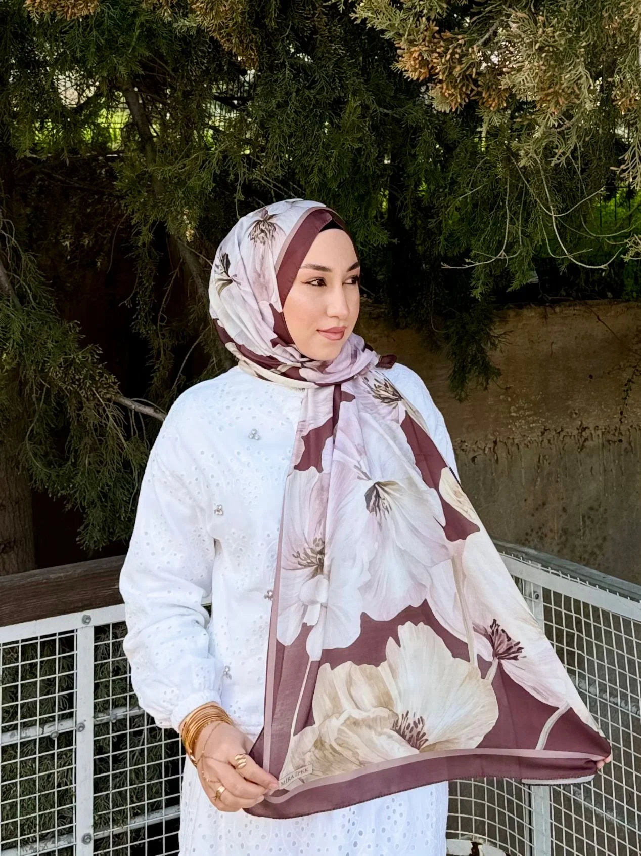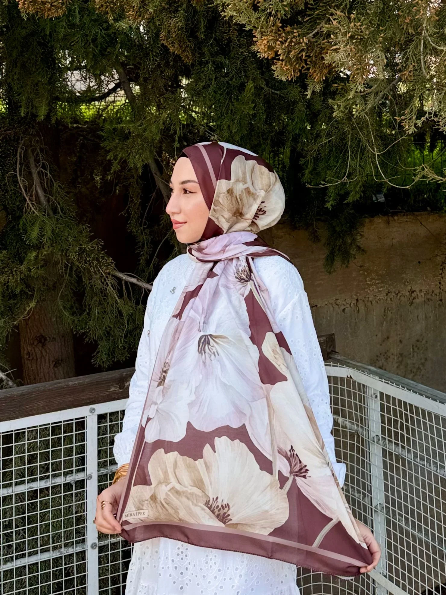 Bu büyük çiçek desenli şalı, görseldeki gibi beyaz fisto veya şifon bluzlarla eşleştirerek bahar enerjisini yansıtabilirsiniz. Desen içindeki mürdüm tonlarını öne çıkarmak için benzer renklerde bir çanta veya ruj seçimiyle bütünlük yakalayabilirsiniz.