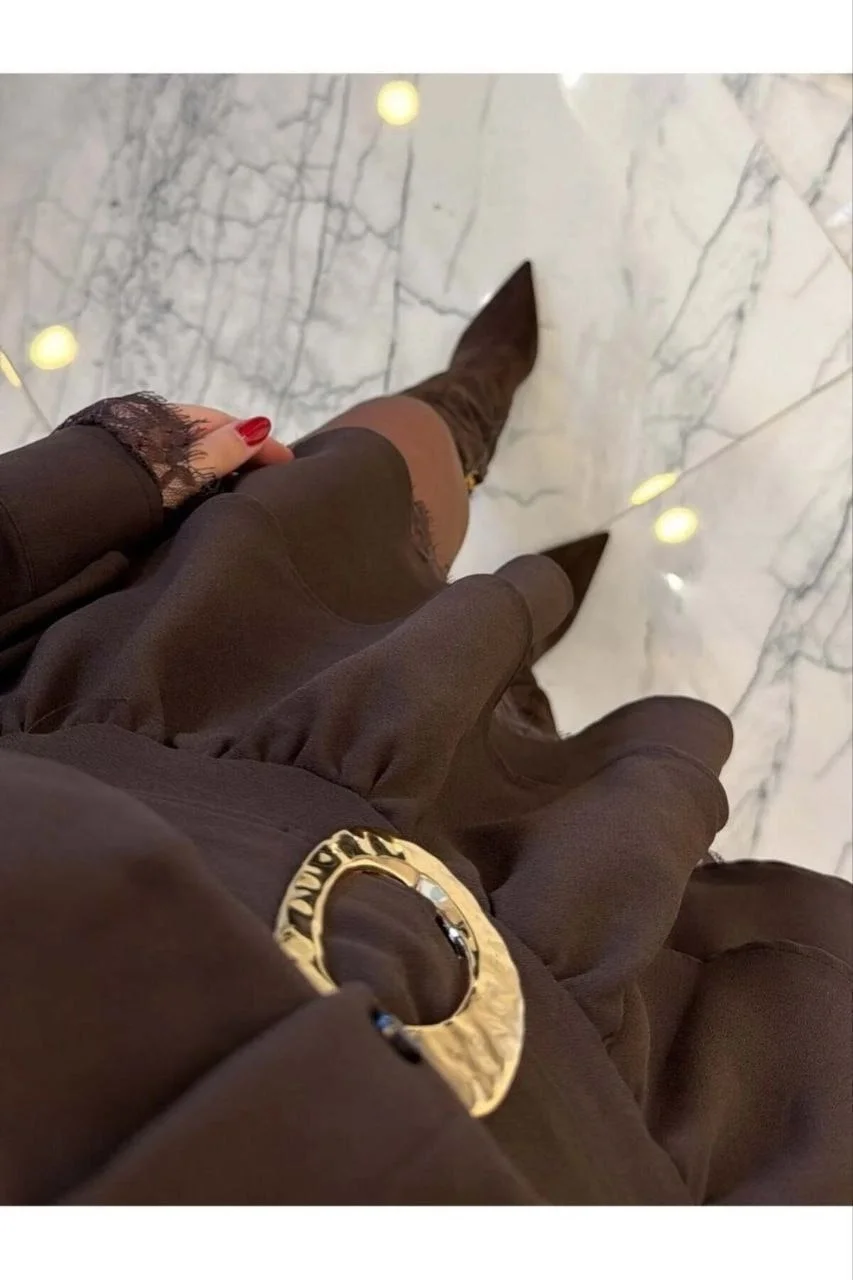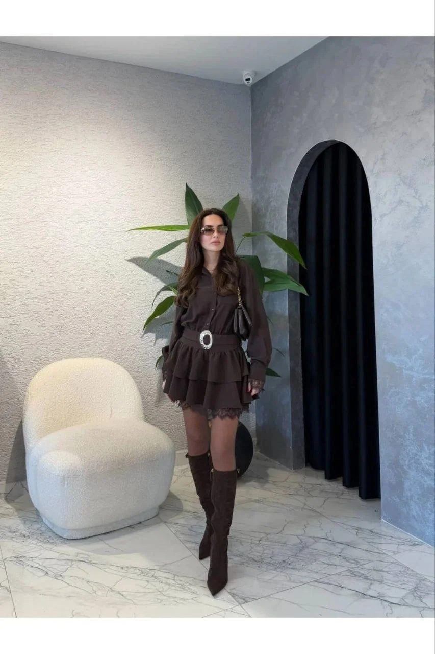 Romantizmin ve gücün mükemmel uyumu... İkili takım illüzyonu yaratan bu kahverengi gömlek yaka elbise, "Coquette" trendinin zarif detaylarını modern kadının dinamik stiliyle buluşturuyor. Tek parça giy-çık rahatlığını, koldan ve etek ucundan süzülen dantel detayları ile birleştirerek size adeta bir Paris şıklığı sunuyor. Elbiseye dahil olan tokalı kemeri ise kombinin imza dokunuşunu yapıyor.