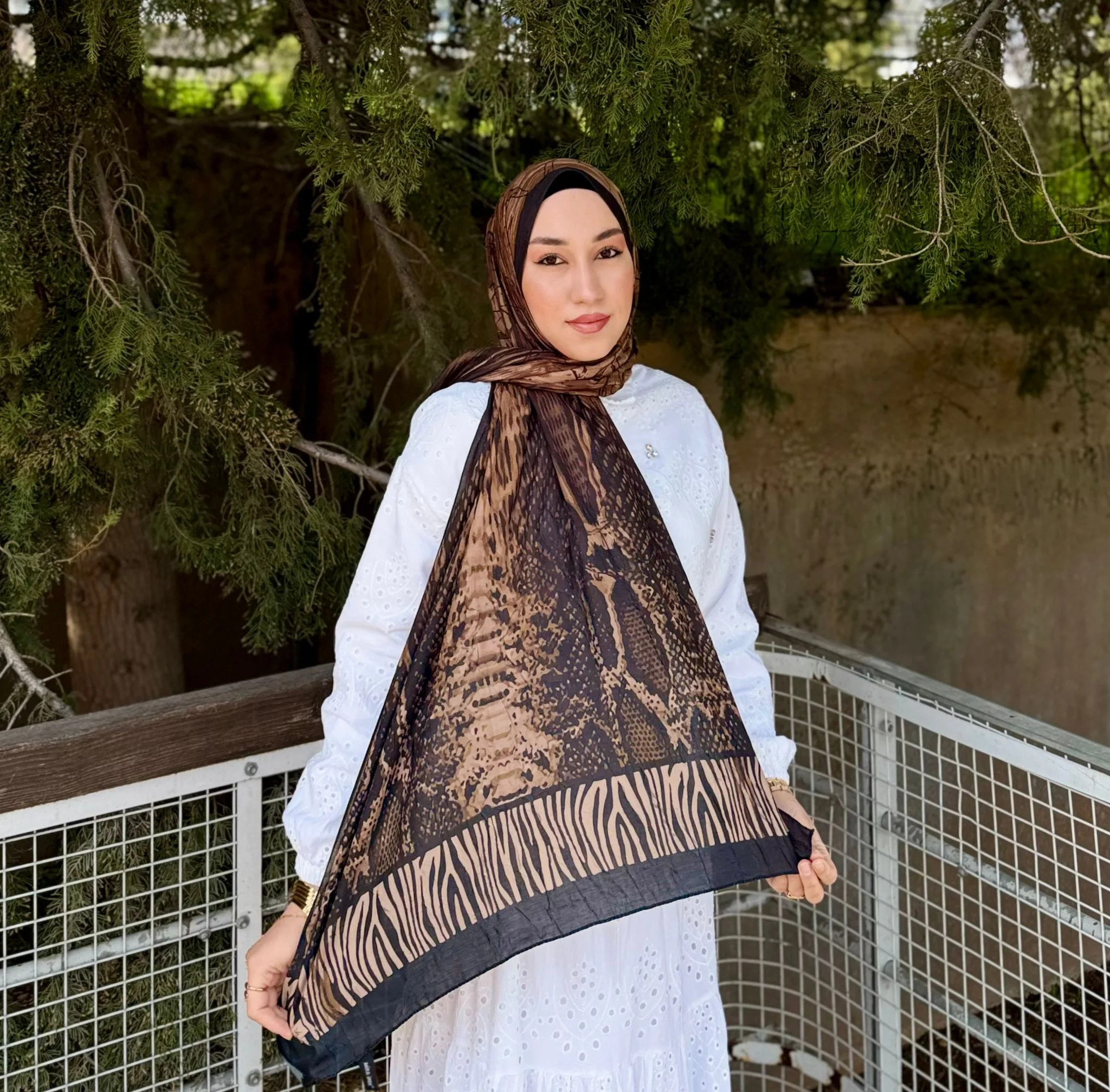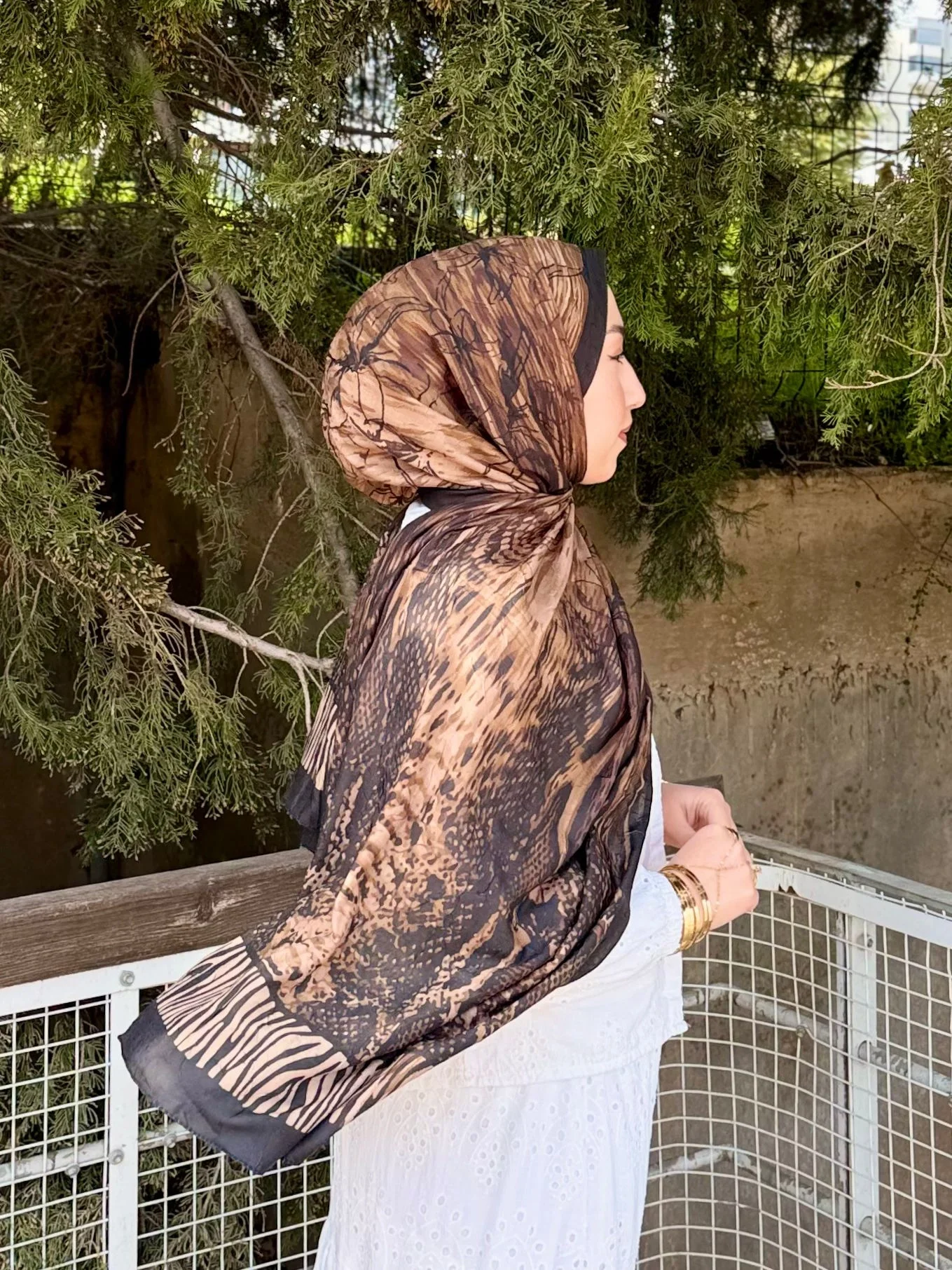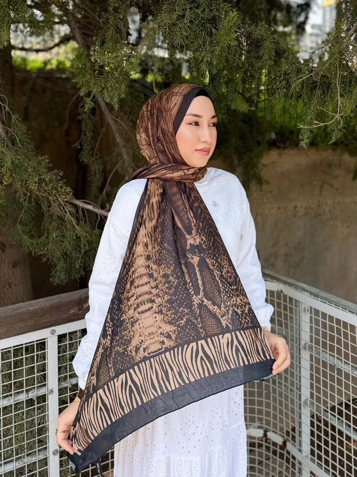 Modern çizgilerin vahşi desenlerle dans ettiği bu kahve tonlu pamuklu bambu şal, karakterli bir stil arayanlar için tasarlandı. Leopar dokusunun zebra desenli bordür ile birleştiği bu tasarım, bambu lifinin eşsiz yumuşaklığı sayesinde gün boyu konforlu bir kullanım sunar.