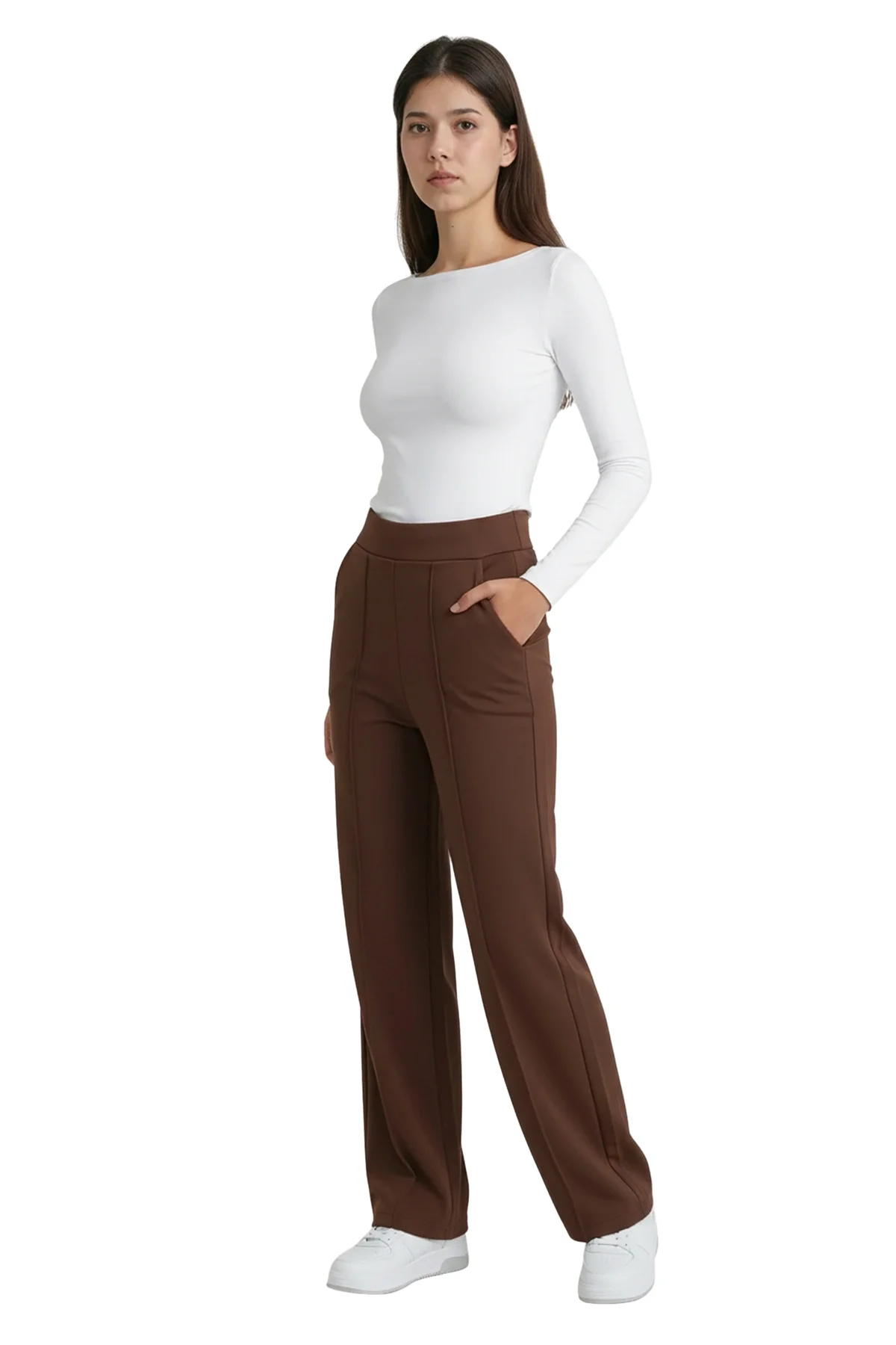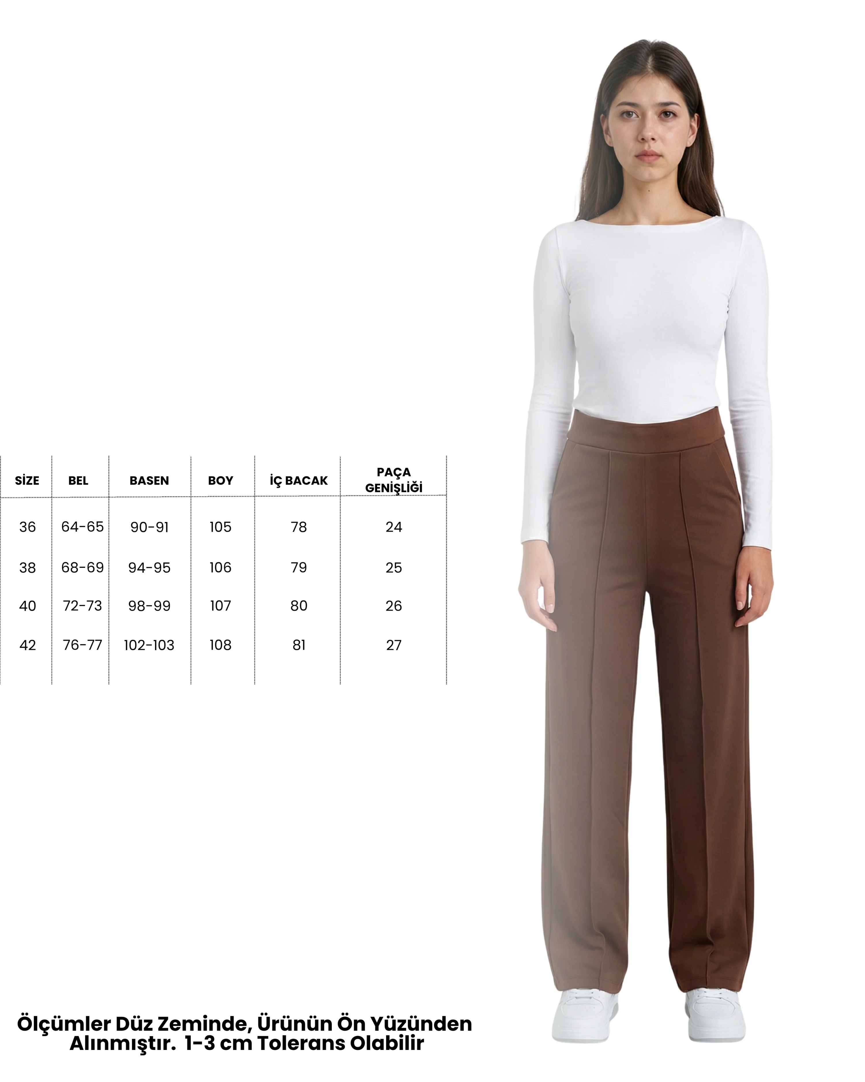 Doğanın sıcak tonlarını modern şehir stiliyle buluşturun! Bu kahverengi yüksek bel pantolon, dökümlü premium krep kumaşı ve bacak boyunu maksimize eden çimalı (dikişli iz) detayıyla "sessiz lüks" akımının en şık temsilcisi. Kahverenginin zengin tonu, krep kumaşın kırışmaya dayanıklı yapısıyla birleşerek gün boyu asaletini koruyan bir silüet sunuyor.