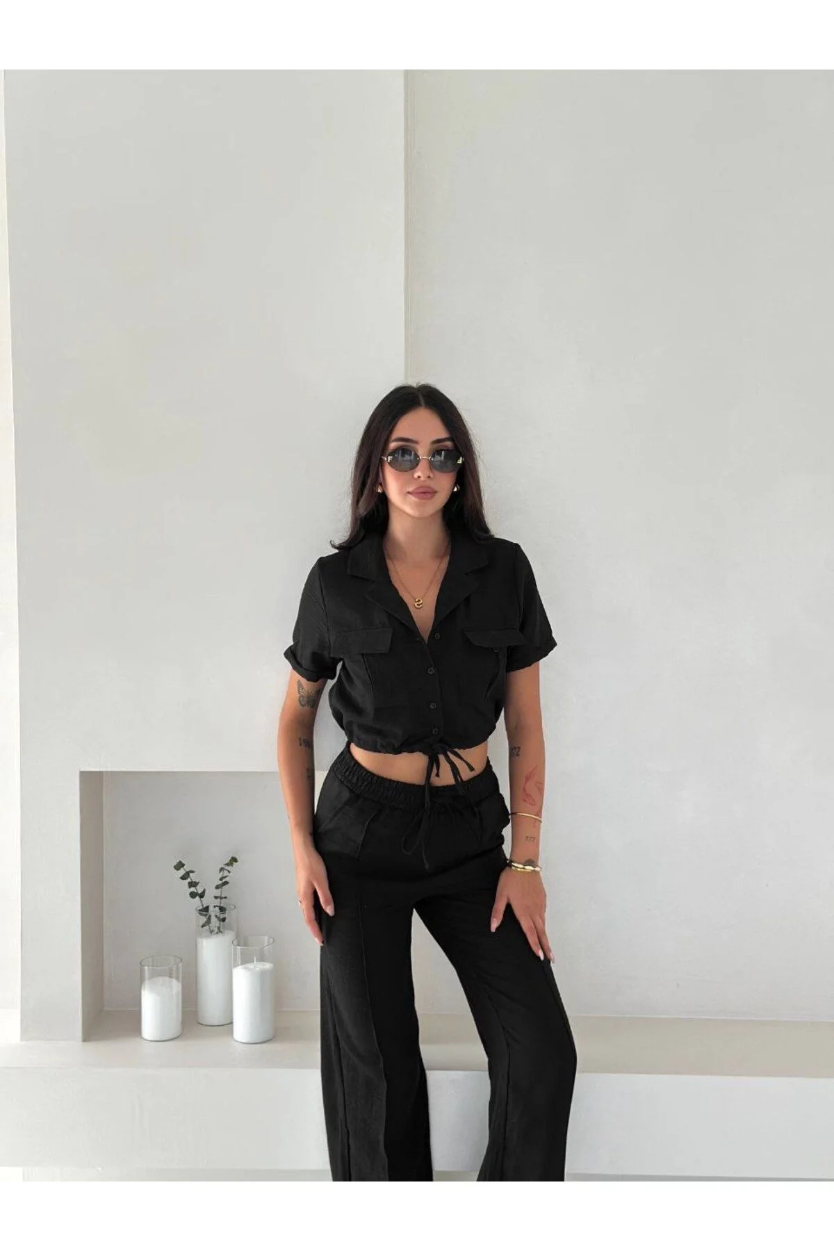 Kadın Gömlek Yaka Çift Cepli Crop ve Beli Lastikli Palazzo Pantolon Keten Takım - Siyah